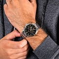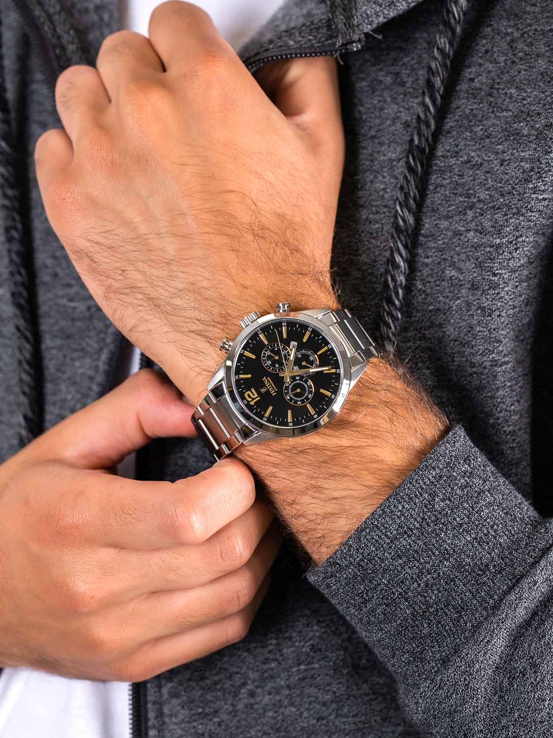 Эксклюзивный хронографХронографФункция позволяет измерять отрезки времени с особой точностью: часы, минуты, секунды. Верным признаком хронографа является наличие на циферблате 3 дополнительных окошек-счётчиков. с секундомеромСекундомерСекундоме́р — прибор, способный измерять интервалы времени с точностью до долей секунды., отличающийся продуманным дизайном и отделкой, придется по вкусу мужчинам, ценящим идеальное соотношение цены и качества.. Минеральное стеклоМинеральное стеклоМинеральное стекло представляет собой искусственно выращенный минерал кварца. Такое стекло отличается особой устойчивостью к повреждениям и царапинам. Уступает по некоторым качествам сапфировому стеклу. устойчивое к появлению царапин, обладающее высокой прозрачностью. Класс водозащиты: 100 метров, позволит защитить корпус от случайных брызг или капель дождя. Метки в виде штрихов. Стрелки и метки с нанесенным люминесцентным покрытиемЛюминесцентное покрытиеПозволяет считывать показания времени в темноте. Производители наносят на стрелки, часовые индексы, безель или поверхность циферблата светонакопительный состав, дающий холодное свечение.