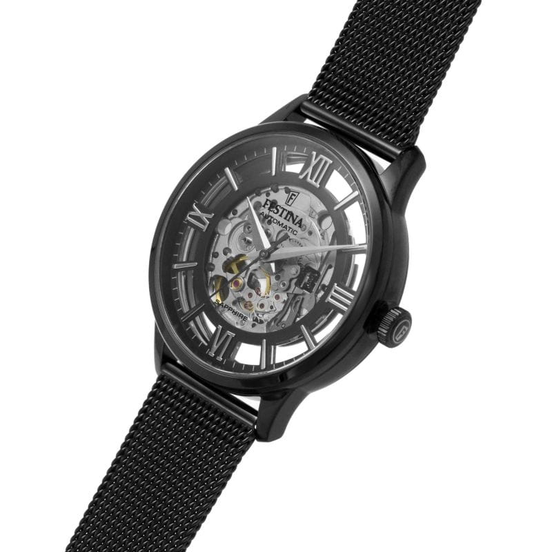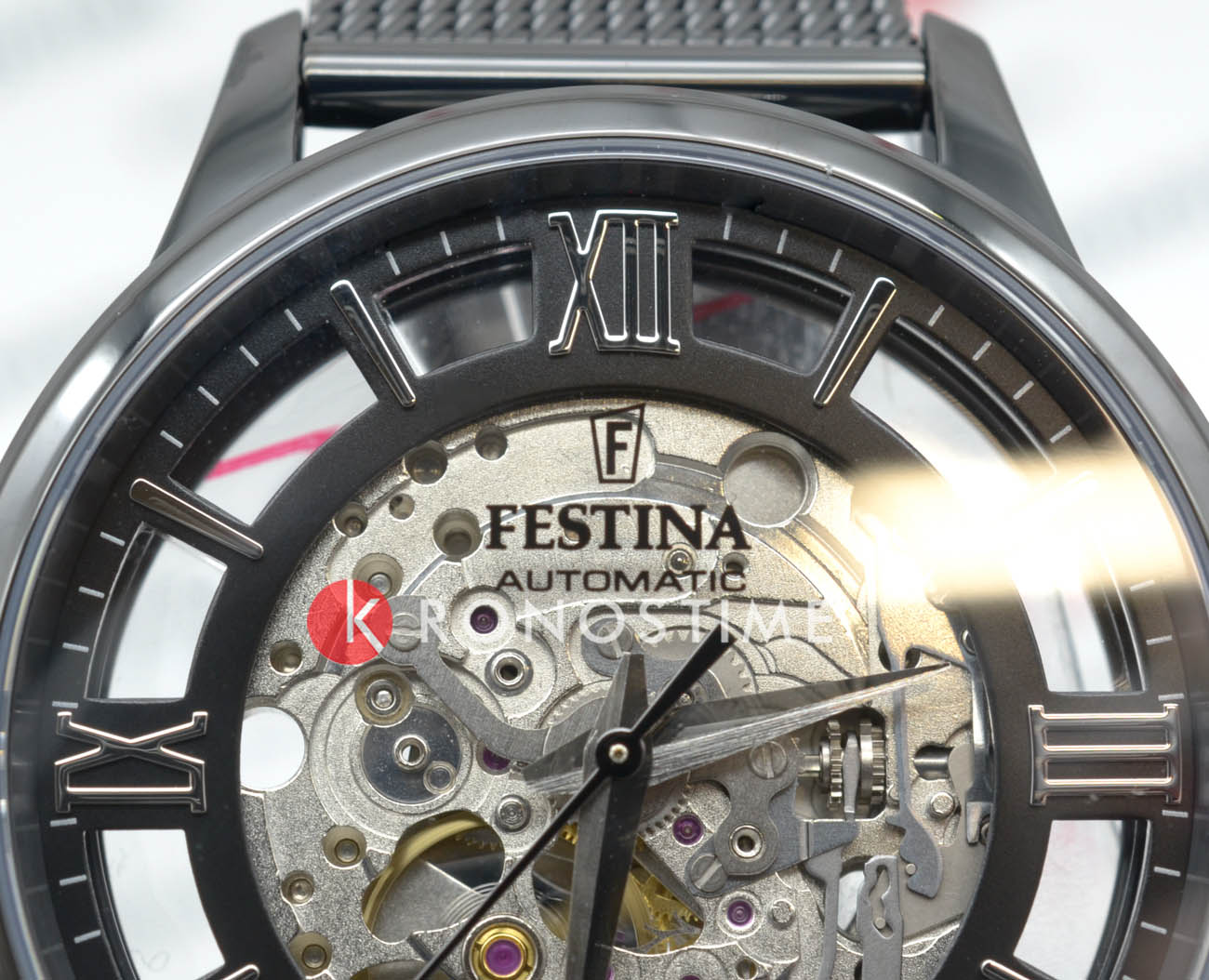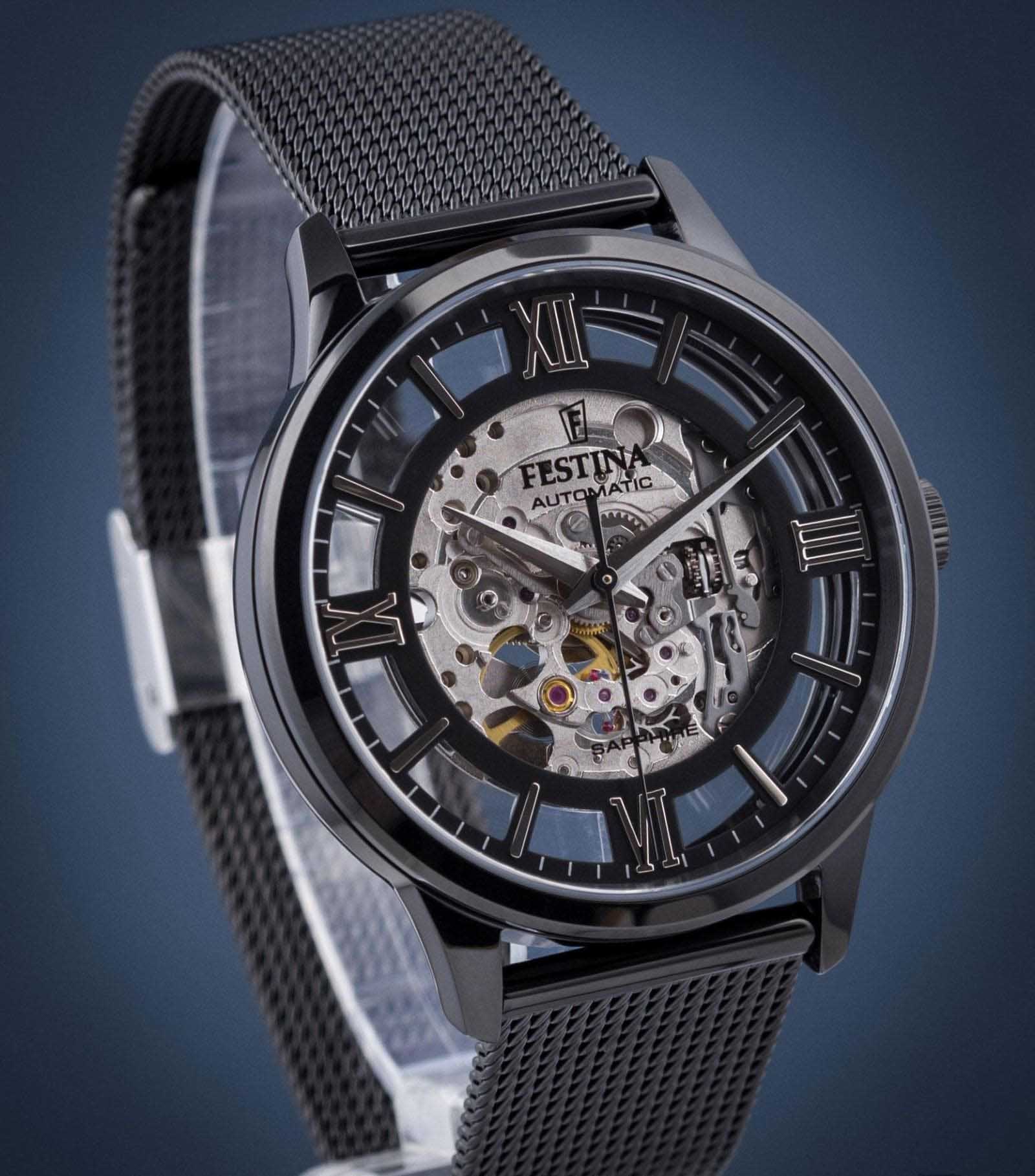Мужские механические часы-скелетоны Festina Automatic F20535/1, механический механизм (автоматический калибр) с высокой точностью. Сапфировое стеклоСапфировое стеклоПрочный и надёжный материал из кристалла сапфира синтетического происхождения, характеризующийся особой твёрдостью и устойчивостью к царапинам и повреждениям. устойчивое к появлению царапин, обладающее высокой прозрачностью. Класс водозащиты: 50 метров, позволит защитить корпус от случайных брызг или капель дождя. Корпус часов изготовлен из стали с PVD-покрытиемPVDУльтратонкое покрытие наносится в технике вакуумного напыления, сочетает в себе нитрид титана особой прочности со слоем золота или оксида хрома. Несёт в себе декоративную или защитную функцию.. Стальной браслет на раскладной застёжкеРаскладная застёжкаТакой тип застёжки используется только на браслетах из металла. Она никогда не раскрывается полностью, происходит разделение на 2 и более частей. Раскладывающая застёжка снизит вероятность потери часов к минимуму. с PVD-покрытиемPVDУльтратонкое покрытие наносится в технике вакуумного напыления, сочетает в себе нитрид титана особой прочности со слоем золота или оксида хрома. Несёт в себе декоративную или защитную функцию.. В механизме 21 камень. Циферблат с метками в виде штрихов и римских цифр. Рифленая заводная головка. Прозрачная задняя крышка. Браслет миланского плетения.