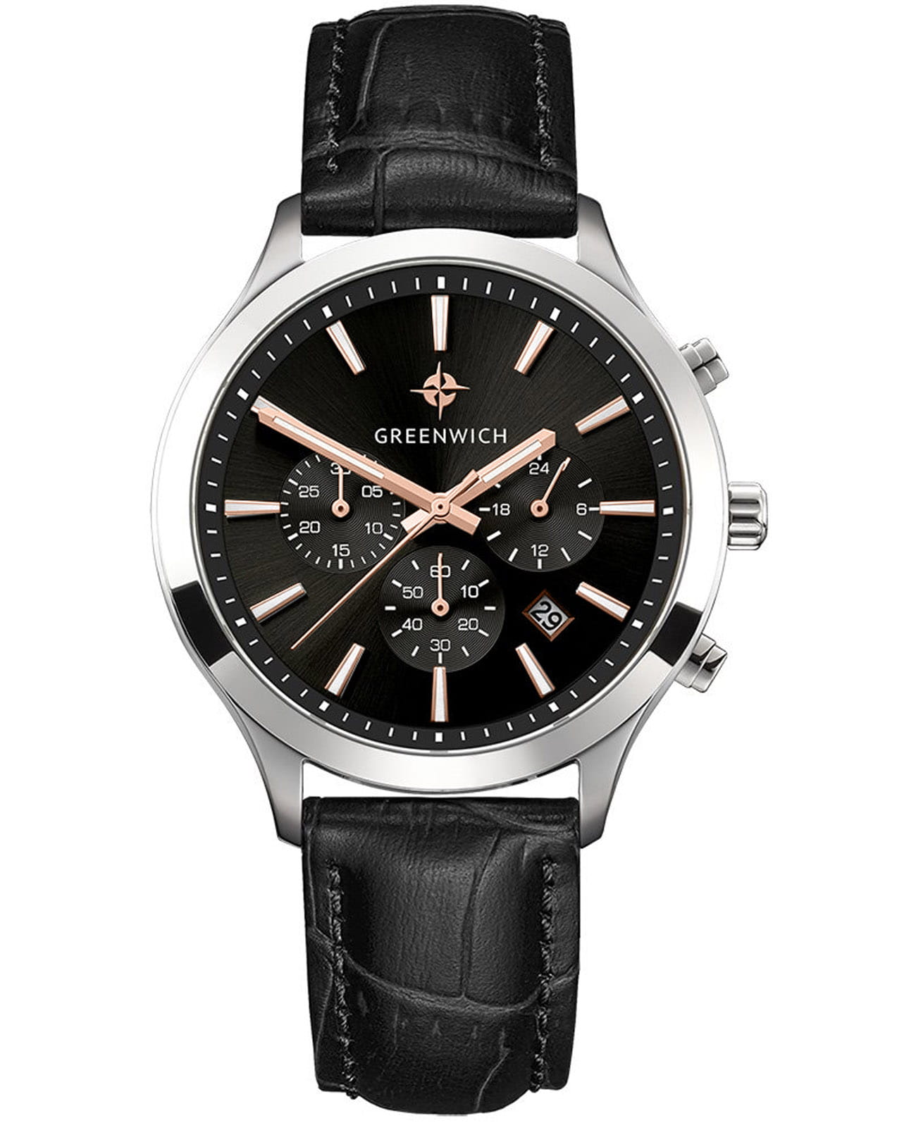 Мужские наручные часы Greenwich 043.11.35 c хронографомХронографФункция позволяет измерять отрезки времени с особой точностью: часы, минуты, секунды. Верным признаком хронографа является наличие на циферблате 3 дополнительных окошек-счётчиков. представляют собой классический вариант для повседневной носки. Циферблат украшается брендовым логотипом, изображающим Розу Ветров. Эмблема мореплавательского духа символизирует удачу, стремление достигнуть поставленной цели. Часы характеризуются традиционными формами, лаконичным исполнением, что делает модель элегантным дополнением к деловому костюму. Надёжный корпус из нержавеющей стали спасает японский механизм от повреждений и ударов. Минеральное стеклоМинеральное стеклоМинеральное стекло представляет собой искусственно выращенный минерал кварца. Такое стекло отличается особой устойчивостью к повреждениям и царапинам. Уступает по некоторым качествам сапфировому стеклу. отличается устойчивостью к образованию царапин на поверхности. Стрелки и метки с люминесцентным покрытиемЛюминесцентное покрытиеПозволяет считывать показания времени в темноте. Производители наносят на стрелки, часовые индексы, безель или поверхность циферблата светонакопительный состав, дающий холодное свечение.. Окошко даты находится в положении между 4 и 5 часов. Кожаный ремешок на стандартной застёжке.