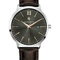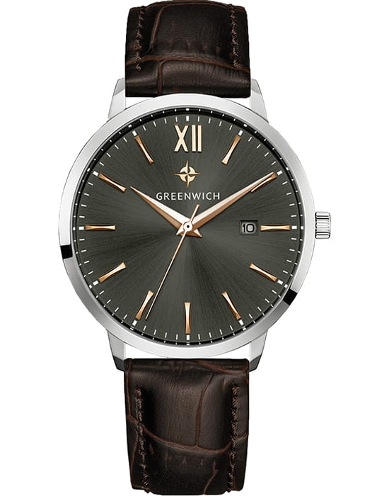 Классические мужские часы серии Brig прекрасно подойдут как под костюм, так и под одежду направления casual. В часах установлен точный японский механизм Miyota. Корпус часов изготовлен из нержавеющей гипоаллергенной стали: он изящно смотрится на руке и не создает неудобств при контакте с одеждой с длинным рукавом. Размер корпуса 41 мм. Полировка на циферблате серого цвета выполнена в виде солнечных лучей. Индексы часов изготовлены вручную и закреплены на двух штифтах. Выпуклая форма рисок создает эффект игры солнечных бликов. Объемные часовая и минутная стрелки имеют мечеобразную форму. В модели представлена дополнительная функция – дата. Ее окошко расположено на уровне трех часов. Циферблат надежно защищен минеральным стекломМинеральное стеклоМинеральное стекло представляет собой искусственно выращенный минерал кварца. Такое стекло отличается особой устойчивостью к повреждениям и царапинам. Уступает по некоторым качествам сапфировому стеклу.. На часах установлен темно-коричневый ремешок из натуральной кожи. Логотип марки – изображение «розы ветров», символа удачи и новых открытий - расположен на циферблате, заводной головке и внутренней части ремешка. Задняя крышка часов украшена изображениями логотипа и корабля, который является символом марки Greenwich.