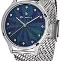 Женские английские часы Greenwich GW 341.19.56, кварцевый механизм с высокой точностью. Класс водозащиты: 30 метров, позволит защитить корпус от случайных брызг или капель дождя. Корпус часов изготовлен из стали. Браслет с раскладной застёжкойРаскладная застёжкаТакой тип застёжки используется только на браслетах из металла. Она никогда не раскрывается полностью, происходит разделение на 2 и более частей. Раскладывающая застёжка снизит вероятность потери часов к минимуму.. Циферблат сделан из темно-синего перламутра и украшен необычной гравировкой. Фианиты, исполняющие функцию маркеров часов, надежно закреплены в кастах.