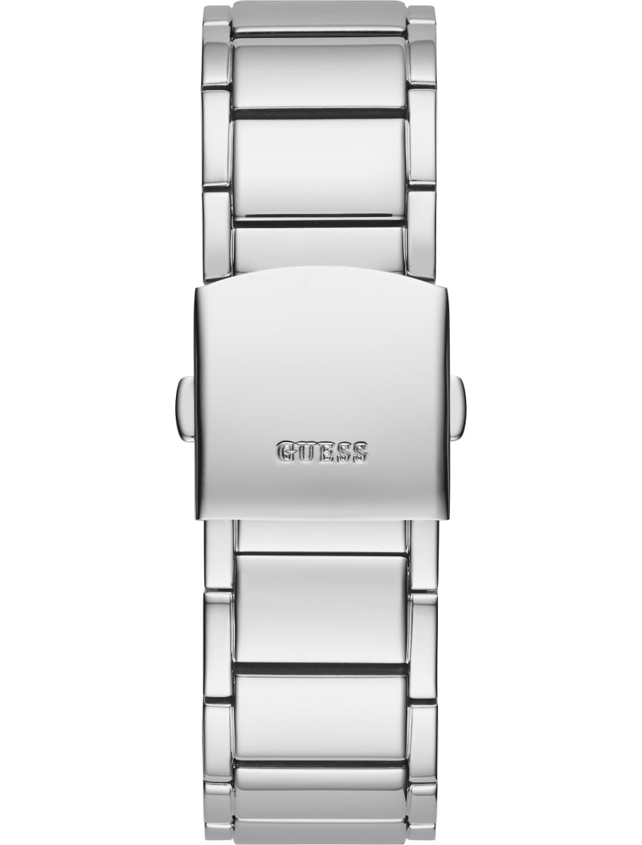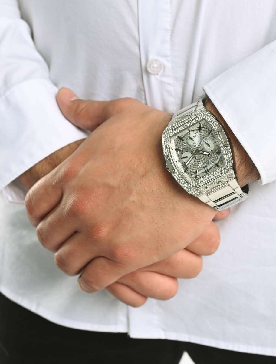 Мужские наручные часы Guess GW0094G1 – это сочетание элегантности и современного стиля. Они оснащены надежным кварцевым механизмом, который обеспечивает точность хода. Корпус часов выполнен из стали ширина 42 мм, высота 43 мм, безельБезельВнешний ободок, закрепляющий стекло. В спортивных часах так называется поворотное кольцо с делениями на циферблате, выполняет роль таймера – замеряет отрезки времени на шкале. Неподвижный безель – элемент декора. Однонаправленно вращающийся безель на дайверских часах позволяет фиксировать моменты погружения и выныривания на поверхность. декорирован кристаллами и винтами, придающими модели особый характер. Серебристый циферблат инкрустирован кристаллами и оснащен метками в виде штрихов, что добавляет изысканности и блеска. Часы поддерживают 24-х часовой формат времени, а также оснащены календарем, показывающим день недели на отдельном циферблате. Люминесцентное покрытиеЛюминесцентное покрытиеПозволяет считывать показания времени в темноте. Производители наносят на стрелки, часовые индексы, безель или поверхность циферблата светонакопительный состав, дающий холодное свечение. на стрелках обеспечивает отличную видимость в темноте. Стальной браслет с раскладной застежкойРаскладная застёжкаТакой тип застёжки используется только на браслетах из металла. Она никогда не раскрывается полностью, происходит разделение на 2 и более частей. Раскладывающая застёжка снизит вероятность потери часов к минимуму. гарантирует комфортное ношение и надежную фиксацию. Минеральное стеклоМинеральное стеклоМинеральное стекло представляет собой искусственно выращенный минерал кварца. Такое стекло отличается особой устойчивостью к повреждениям и царапинам. Уступает по некоторым качествам сапфировому стеклу. защищает циферблат от царапин, а водозащита 50WR предохраняет часы от случайных брызг и дождя. Эта модель станет отличным выбором для тех, кто ценит стиль и функциональность в одном аксессуаре.