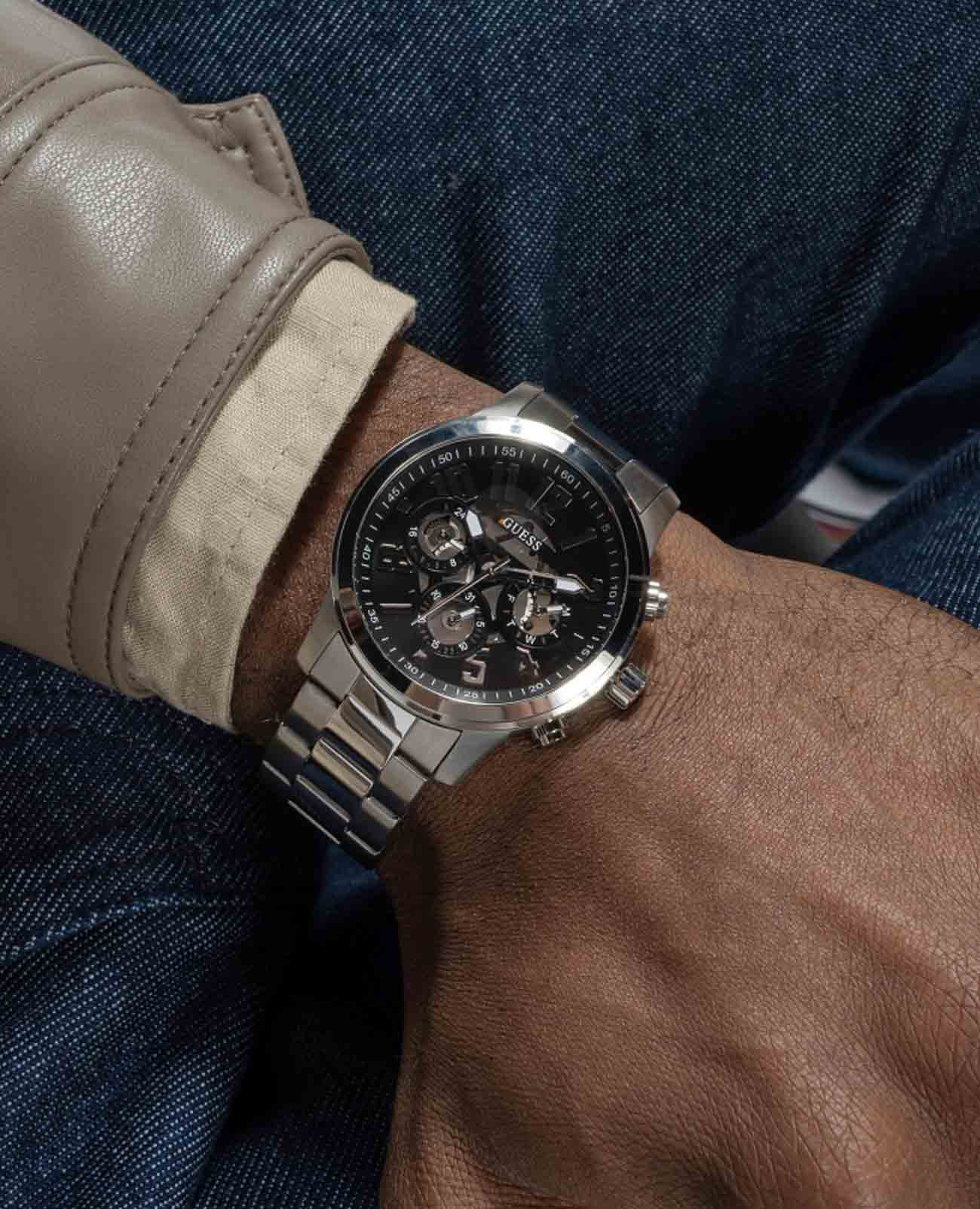 Мужские наручные часы с минеральным стекломМинеральное стеклоМинеральное стекло представляет собой искусственно выращенный минерал кварца. Такое стекло отличается особой устойчивостью к повреждениям и царапинам. Уступает по некоторым качествам сапфировому стеклу. Guess Dress  GW0627G1, кварцевый механизм с высокой точностью. Корпус часов изготовлен из стали. 24-х часовой формат времени, число и день недели отображаются на отдельных циферблатах. Метки в виде арабских цифр. Рифленая заводная головка. Стрелки с люминесцентным покрытиемЛюминесцентное покрытиеПозволяет считывать показания времени в темноте. Производители наносят на стрелки, часовые индексы, безель или поверхность циферблата светонакопительный состав, дающий холодное свечение.. Класс водозащиты: 50 метров, позволит защитить корпус от случайных брызг или капель дождя. Стальной браслет на раскладной застёжкеРаскладная застёжкаТакой тип застёжки используется только на браслетах из металла. Она никогда не раскрывается полностью, происходит разделение на 2 и более частей. Раскладывающая застёжка снизит вероятность потери часов к минимуму..