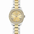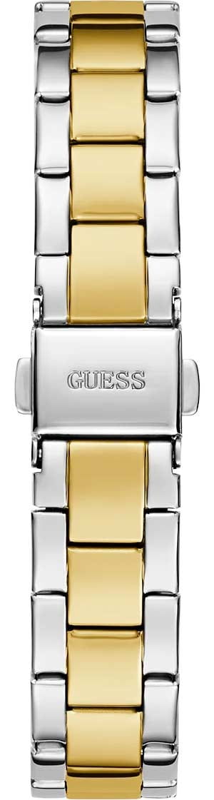 Эти элегантные часы Guess GW0841L2 станут идеальным дополнением для тех, кто стремится подчеркнуть свой стиль и уверенность. Оснащенные надежным кварцевым механизмом, они обеспечивают точность и долговечность. Круглый стальной корпус с полированной поверхностью придает часам современный и изысканный вид. БезельБезельВнешний ободок, закрепляющий стекло. В спортивных часах так называется поворотное кольцо с делениями на циферблате, выполняет роль таймера – замеряет отрезки времени на шкале. Неподвижный безель – элемент декора. Однонаправленно вращающийся безель на дайверских часах позволяет фиксировать моменты погружения и выныривания на поверхность. с золотистым IP-покрытиемIP-покрытиеМетод ионного напыления. Демонстрирует повышенную устойчивость к истиранию, окислению и химическим веществам. Под воздействием высокого давления и температуры около 1500°C молекулы металла надёжно соединяются с частицами корпуса часов. украшен кристаллами, добавляющими дополнительный блеск и роскошь. Золотистый циферблат, выполненный по технологии Sunray, притягивает взгляды своим изысканным сиянием. Метки на циферблате представлены в виде штрихов и римских цифр, что подчеркивает классический стиль аксессуара. Люминесцентное покрытиеЛюминесцентное покрытиеПозволяет считывать показания времени в темноте. Производители наносят на стрелки, часовые индексы, безель или поверхность циферблата светонакопительный состав, дающий холодное свечение. на стрелках обеспечивает отличную видимость в темноте. Рифленая заводная головка обеспечивает удобство в настройке времени. Стальной браслет с частичным золотистым IP-покрытиемIP-покрытиеМетод ионного напыления. Демонстрирует повышенную устойчивость к истиранию, окислению и химическим веществам. Под воздействием высокого давления и температуры около 1500°C молекулы металла надёжно соединяются с частицами корпуса часов. и с раскладной застежкойРаскладная застёжкаТакой тип застёжки используется только на браслетах из металла. Она никогда не раскрывается полностью, происходит разделение на 2 и более частей. Раскладывающая застёжка снизит вероятность потери часов к минимуму. гарантирует комфортное ношение и надежную фиксацию на запястье. Часы обладают водозащитой 30WR, что делает их устойчивыми к случайным брызгам. Минеральное стеклоМинеральное стеклоМинеральное стекло представляет собой искусственно выращенный минерал кварца. Такое стекло отличается особой устойчивостью к повреждениям и царапинам. Уступает по некоторым качествам сапфировому стеклу. защищает циферблат от царапин и других повреждений.