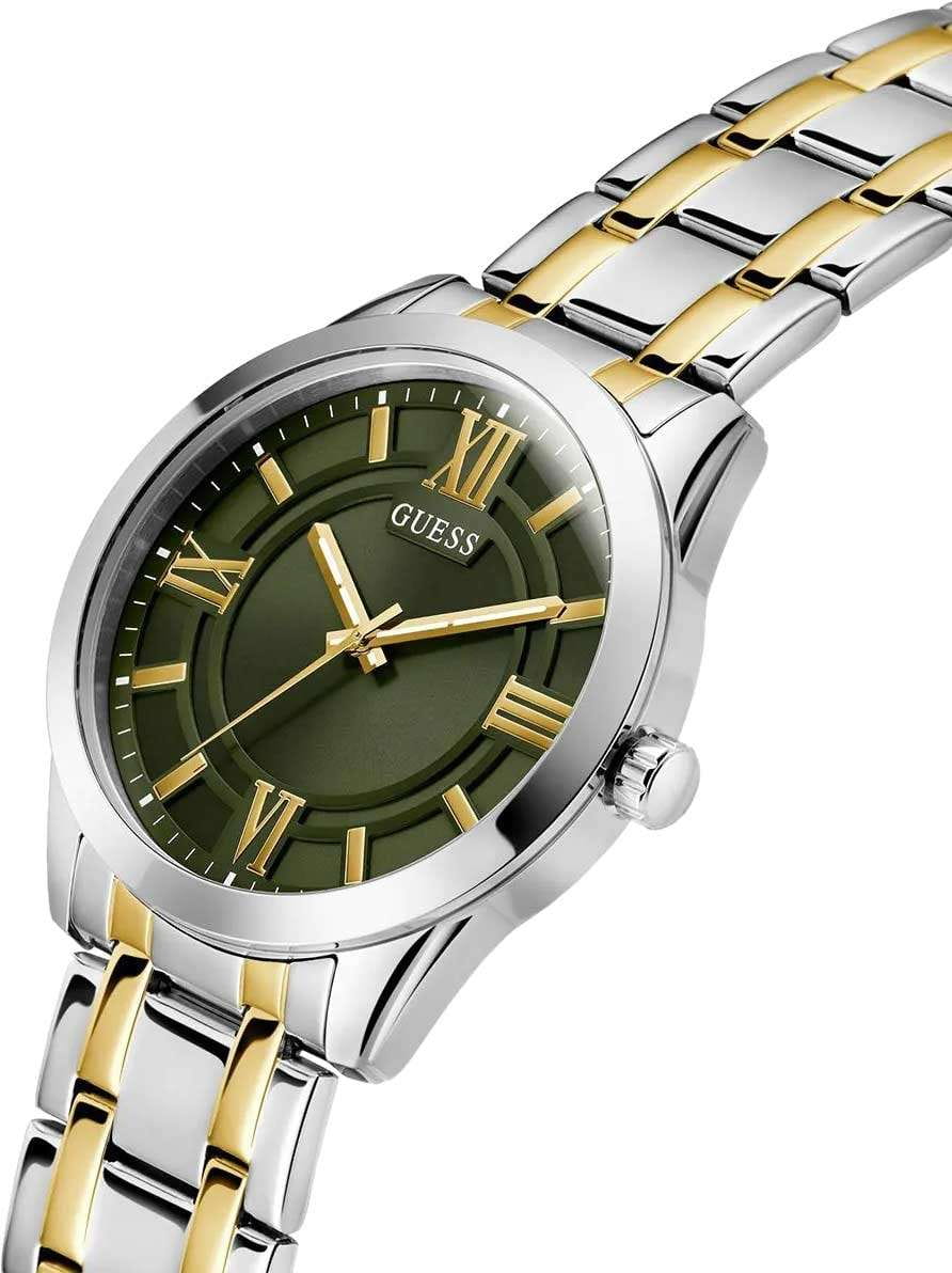 Стильные и практичные мужские наручные часы Guess GW0893G1 станут достойным дополнением к вашему образу. Эти часы оснащены надежным кварцевым механизмом, гарантирующим точность и долговечность. Круглый стальной корпус с полированной поверхностью подчеркивает элегантность и современный стиль аксессуара. Зеленый циферблат, выполненный по технологии Sunray, создает эффект солнечных лучей, добавляя глубины и изысканности. Метки в виде штрихов и римских цифр позволяют легко считывать время, а рифленая заводная головка обеспечивает удобство в использовании. Стальной браслет с частичным золотистым IP-покрытиемIP-покрытиеМетод ионного напыления. Демонстрирует повышенную устойчивость к истиранию, окислению и химическим веществам. Под воздействием высокого давления и температуры около 1500°C молекулы металла надёжно соединяются с частицами корпуса часов. и раскладной застежкойРаскладная застёжкаТакой тип застёжки используется только на браслетах из металла. Она никогда не раскрывается полностью, происходит разделение на 2 и более частей. Раскладывающая застёжка снизит вероятность потери часов к минимуму. обеспечивает комфортное прилегание к запястью и надежную фиксацию. Минеральное стеклоМинеральное стеклоМинеральное стекло представляет собой искусственно выращенный минерал кварца. Такое стекло отличается особой устойчивостью к повреждениям и царапинам. Уступает по некоторым качествам сапфировому стеклу. защищает циферблат от царапин, сохраняя его безупречный вид. Люминесцентное покрытиеЛюминесцентное покрытиеПозволяет считывать показания времени в темноте. Производители наносят на стрелки, часовые индексы, безель или поверхность циферблата светонакопительный состав, дающий холодное свечение. на стрелках обеспечивает отличную видимость в темноте. Водозащита уровня 50WR позволяет не беспокоиться о случайных брызгах и дождевых каплях, что делает эти часы идеальным выбором для активных и стильных мужчин.