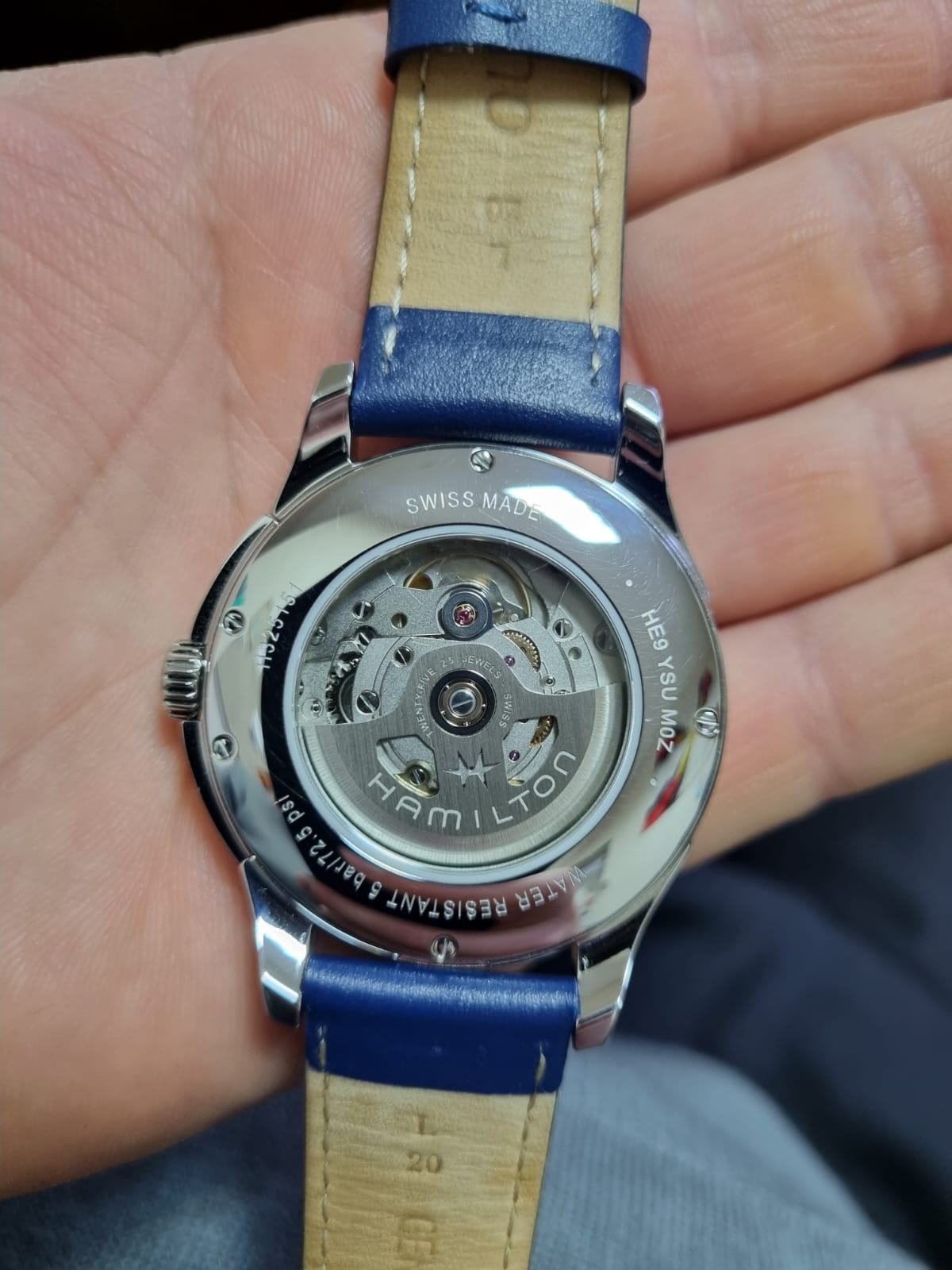 Часы прекрасно сочетаются с синим кожаным ремешком и легко носятся на руке, практически не чувствуешь их, что очень удобно. Модель на браслете имеет вес, смотрится более привлекательно за счет полированных частей звеньев, отмечу хорошую застежку, вообще браслет серьезный, соединения шпильками и втулками. Толщина часов около 11мм, однако на руке кажется не более 9 мм за счет скосов на задней крышке довольно тонкие, не цепляются за рукава, хорошо выполнена защита компактной и в то же время удобной заводной головки. Часы имеют идеальный размер для запястья среднего размера. Задняя крышка с окошком, интересно понаблюдать за работой механизма.