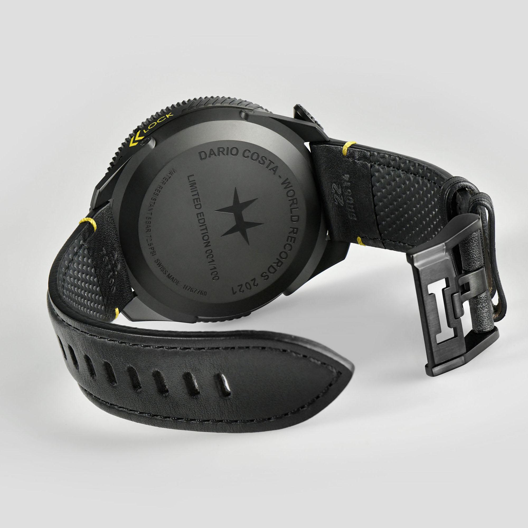 Специальное издание, посвященное мировому рекорду полета в туннеле итальянского пилота Дарио Коста. Часы диаметром 46 мм, оснащенные автоматическим механизмом хронографа H-31, обладают уникальной функцией, разработанной для пилотов: съемным футляром, который можно прикрепить к фиксированному креплению приборной панели. Как намек на два туннеля, через которые Дарио пролетел с рекордной скоростью, на обоих дополнительных циферблатах есть желтые кольца, а 12-часовой счетчик адаптирован для 15-минутного обратного отсчета. Super-LumiNova® наносится только на секундную стрелку и индикаторы до 43, отмечая 43-секундный полет Дарио. Ограничение 100 экземплярами, это отсылка на максимально возможную высоту полета (100 см) в обоих туннелях.