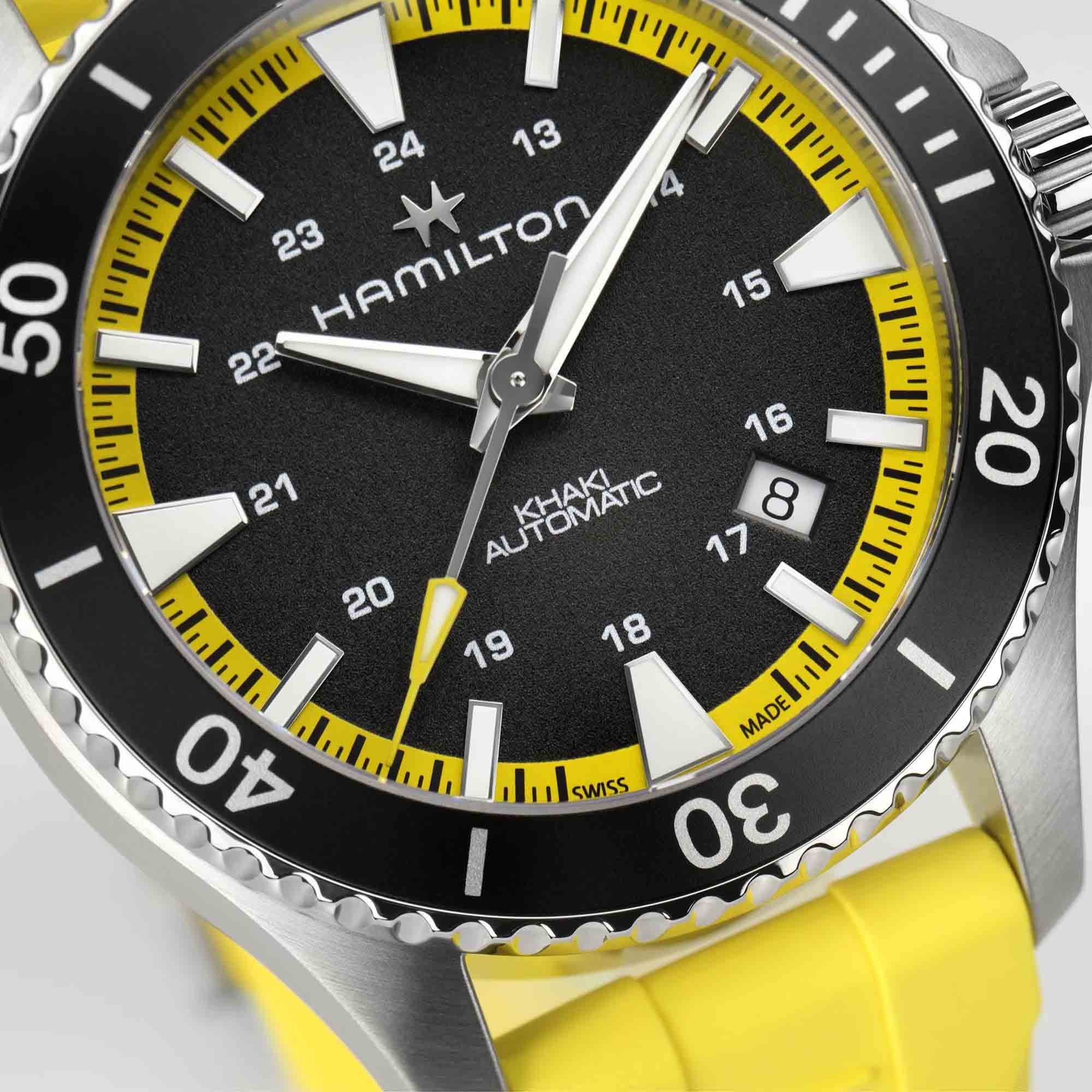 На пляже, у бассейна или в океанских глубинах: новая модель Khaki Navy Scuba гарантированно произведет фурор. Часы для современных мореплавателей, любителей подводного плавания, серфинга и пляжного отдыха с розовым каучуковым ремешком и контрастным черным циферблатом сочетают в себе эффектный дизайн и функциональность. Независимо от того, хронометрируете ли вы время плавания, бега или пребывания на солнце, они позаботятся о том, чтобы вы сохраняли спокойствие даже при высоких температурах. Сапфировое стеклоСапфировое стеклоПрочный и надёжный материал из кристалла сапфира синтетического происхождения, характеризующийся особой твёрдостью и устойчивостью к царапинам и повреждениям. устойчивое к появлению царапин, обладающее высокой прозрачностью.