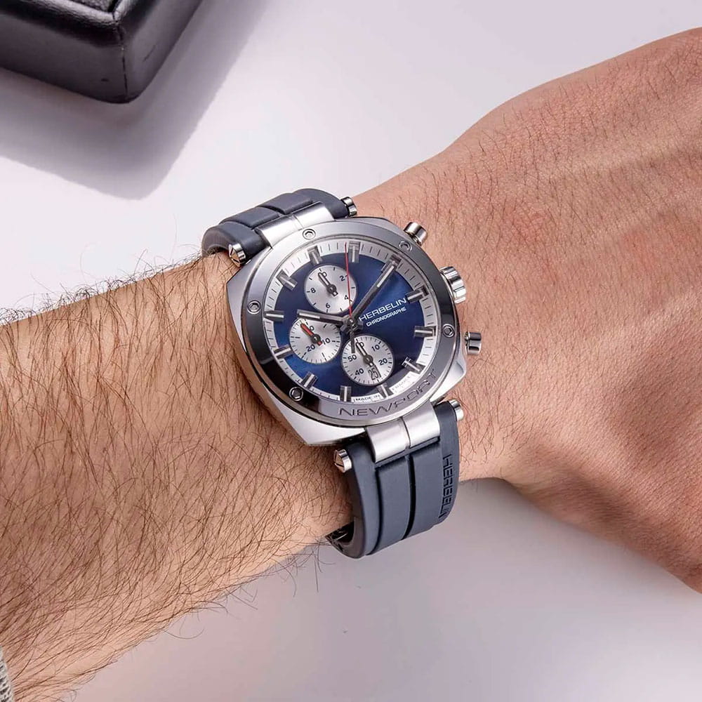 Мужские кварцевые часы-хронографХронографФункция позволяет измерять отрезки времени с особой точностью: часы, минуты, секунды. Верным признаком хронографа является наличие на циферблате 3 дополнительных окошек-счётчиков. Herbelin Newport Heritage 35664AP25CB – отражающий идеальное сочетание современного дизайна, надёжности и функциональности. Элегантный облик станет превосходным завершением образа, наделив его индивидуальным характером. Корпус из нержавеющей стали серебристого цвета, диаметром 42 мм, идеально сбалансирован и элегантен. Сапфировое стеклоСапфировое стеклоПрочный и надёжный материал из кристалла сапфира синтетического происхождения, характеризующийся особой твёрдостью и устойчивостью к царапинам и повреждениям. защищает циферблат от царапин и устойчивое к механическим повреждениям. Стальной безельБезельВнешний ободок, закрепляющий стекло. В спортивных часах так называется поворотное кольцо с делениями на циферблате, выполняет роль таймера – замеряет отрезки времени на шкале. Неподвижный безель – элемент декора. Однонаправленно вращающийся безель на дайверских часах позволяет фиксировать моменты погружения и выныривания на поверхность. украшен винтами. Окошко даты находится в положении 6 часов. Стрелки и метки с люминесцентным покрытиемЛюминесцентное покрытиеПозволяет считывать показания времени в темноте. Производители наносят на стрелки, часовые индексы, безель или поверхность циферблата светонакопительный состав, дающий холодное свечение.. Каучуковый ремешок на стандартной застежке обеспечивает комфортное ношение. Водозащита 100 метров позволит плавать, нырять и заниматься другими водными видами спорта. Эта модель – отличный выбор для тех, кто ищет сочетание стиля, качества и функциональности. Часы станут не только полезным аксессуаром, но и выразительным элементом вашего имиджа.