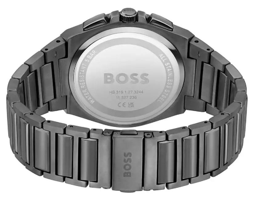 Мужские часы Hugo Boss Steer HB1514045 представлены в круглом 45,8-мм корпусе из нержавеющей стали с IP-покрытиемIP-покрытиеМетод ионного напыления. Демонстрирует повышенную устойчивость к истиранию, окислению и химическим веществам. Под воздействием высокого давления и температуры около 1500°C молекулы металла надёжно соединяются с частицами корпуса часов.. Оснащены кварцевым механизмом с функциями хронографаХронографФункция позволяет измерять отрезки времени с особой точностью: часы, минуты, секунды. Верным признаком хронографа является наличие на циферблате 3 дополнительных окошек-счётчиков., секундомеромСекундомерСекундоме́р — прибор, способный измерять интервалы времени с точностью до долей секунды.. Зеленый циферблат защищен устойчивым к царапинам минеральным стекломМинеральное стеклоМинеральное стекло представляет собой искусственно выращенный минерал кварца. Такое стекло отличается особой устойчивостью к повреждениям и царапинам. Уступает по некоторым качествам сапфировому стеклу.. Браслет из нержавеющей стали с IP-покрытиемIP-покрытиеМетод ионного напыления. Демонстрирует повышенную устойчивость к истиранию, окислению и химическим веществам. Под воздействием высокого давления и температуры около 1500°C молекулы металла надёжно соединяются с частицами корпуса часов. дополнен раскладной застёжкойРаскладная застёжкаТакой тип застёжки используется только на браслетах из металла. Она никогда не раскрывается полностью, происходит разделение на 2 и более частей. Раскладывающая застёжка снизит вероятность потери часов к минимуму.. Водонепроницаемость 50 метров (5 ATM) позволяет использовать часы для плавания.