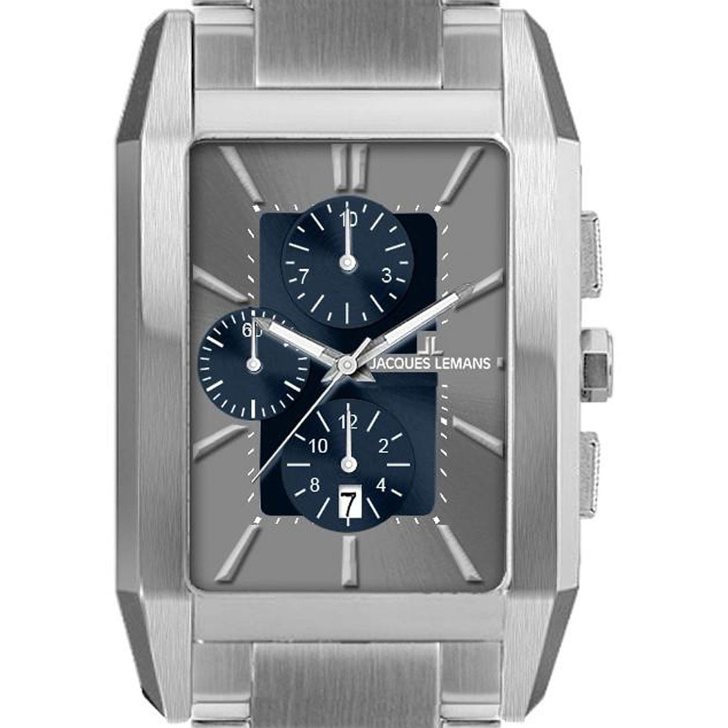 Мужские часы- хронографХронографФункция позволяет измерять отрезки времени с особой точностью: часы, минуты, секунды. Верным признаком хронографа является наличие на циферблате 3 дополнительных окошек-счётчиков. Jacques Lemans Classic 1-2161K, кварцевый механизм с высокой точностью.  Минеральное стеклоМинеральное стеклоМинеральное стекло представляет собой искусственно выращенный минерал кварца. Такое стекло отличается особой устойчивостью к повреждениям и царапинам. Уступает по некоторым качествам сапфировому стеклу. устойчивое к мелким механическим повреждениям. Корпус часов изготовлен из стали. Окошко даты находится в положении 6 часов. Стрелки с люминесцентным покрытиемЛюминесцентное покрытиеПозволяет считывать показания времени в темноте. Производители наносят на стрелки, часовые индексы, безель или поверхность циферблата светонакопительный состав, дающий холодное свечение.. Класс водозащиты: 50 метров, позволит плавать, нырять и заниматься другими водными видами спорта. Стальной браслет на раскладной застёжкеРаскладная застёжкаТакой тип застёжки используется только на браслетах из металла. Она никогда не раскрывается полностью, происходит разделение на 2 и более частей. Раскладывающая застёжка снизит вероятность потери часов к минимуму..