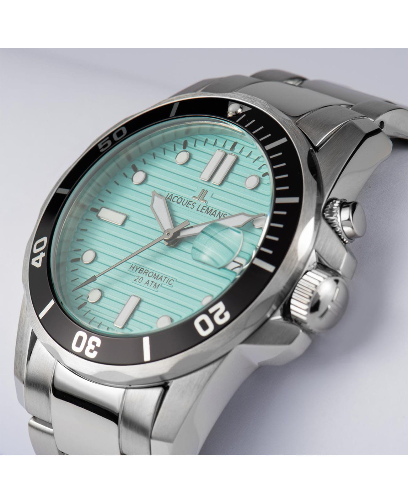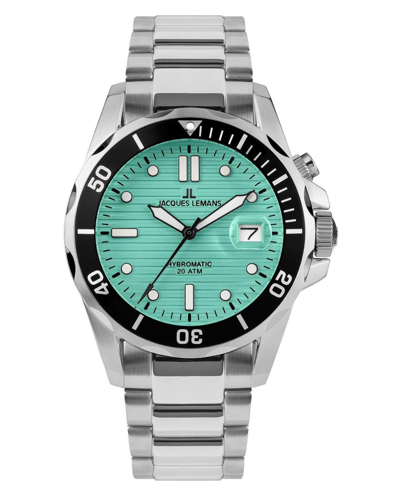 Мужские часы Jacques Lemans Hybromatic 1-2170i с минеральным стекломМинеральное стеклоМинеральное стекло представляет собой искусственно выращенный минерал кварца. Такое стекло отличается особой устойчивостью к повреждениям и царапинам. Уступает по некоторым качествам сапфировому стеклу., гибрид кварца и механики с автоподзаводом. Корпус выполенен из нержавеющей стали. Вращающийся безельБезельВнешний ободок, закрепляющий стекло. В спортивных часах так называется поворотное кольцо с делениями на циферблате, выполняет роль таймера – замеряет отрезки времени на шкале. Неподвижный безель – элемент декора. Однонаправленно вращающийся безель на дайверских часах позволяет фиксировать моменты погружения и выныривания на поверхность. из нержавеющей стали с PVDPVDУльтратонкое покрытие наносится в технике вакуумного напыления, сочетает в себе нитрид титана особой прочности со слоем золота или оксида хрома. Несёт в себе декоративную или защитную функцию. покрытием. Стрелки и метки с люминесцентным покрытиемЛюминесцентное покрытиеПозволяет считывать показания времени в темноте. Производители наносят на стрелки, часовые индексы, безель или поверхность циферблата светонакопительный состав, дающий холодное свечение.. Окошко даты находится в положении 3 часов. Класс водозащиты: 200 метров, позволит плавать, нырять и заниматься другими водными видами спорта. Стальной браслет на раскладной застёжкеРаскладная застёжкаТакой тип застёжки используется только на браслетах из металла. Она никогда не раскрывается полностью, происходит разделение на 2 и более частей. Раскладывающая застёжка снизит вероятность потери часов к минимуму..