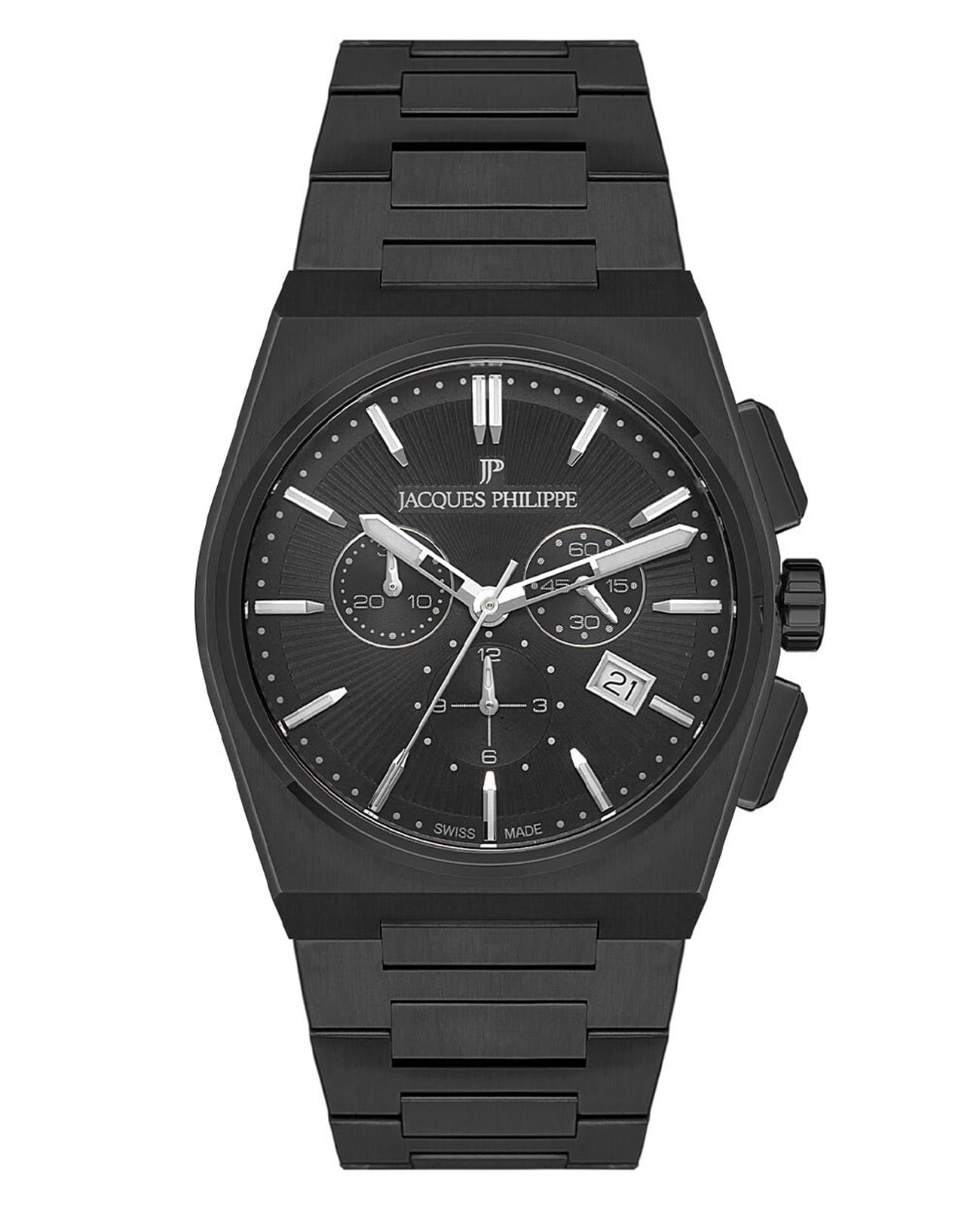 Швейцарские мужские часы-хронографХронографФункция позволяет измерять отрезки времени с особой точностью: часы, минуты, секунды. Верным признаком хронографа является наличие на циферблате 3 дополнительных окошек-счётчиков. с секундомеромСекундомерСекундоме́р — прибор, способный измерять интервалы времени с точностью до долей секунды. Jacques Philippe Aurora JPQGC414311, кварцевый механизм с высокой точностью. Сапфировое стеклоСапфировое стеклоПрочный и надёжный материал из кристалла сапфира синтетического происхождения, характеризующийся особой твёрдостью и устойчивостью к царапинам и повреждениям. устойчивое к появлению царапин, обладающее высокой прозрачностью. Корпус часов изготовлен из нержавеющей стали с IP-покрытиемIP-покрытиеМетод ионного напыления. Демонстрирует повышенную устойчивость к истиранию, окислению и химическим веществам. Под воздействием высокого давления и температуры около 1500°C молекулы металла надёжно соединяются с частицами корпуса часов.. На циферблате три дополнительных индикатора. Окошко даты находится в положении 4 часа. Стрелки с люминесцентным покрытиемЛюминесцентное покрытиеПозволяет считывать показания времени в темноте. Производители наносят на стрелки, часовые индексы, безель или поверхность циферблата светонакопительный состав, дающий холодное свечение.. Класс водозащиты: 50 метров, позволит защитить корпус от случайных брызг или капель дождя. Стальной браслет с IP-покрытиемIP-покрытиеМетод ионного напыления. Демонстрирует повышенную устойчивость к истиранию, окислению и химическим веществам. Под воздействием высокого давления и температуры около 1500°C молекулы металла надёжно соединяются с частицами корпуса часов. на застёжке «бабочка» с кнопкамиЗастёжка "бабочка"Такой вид застёжки дополняется предохранителями, помогающими избежать случайного раскрытия браслета. Обладают изящным исполнением. .