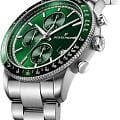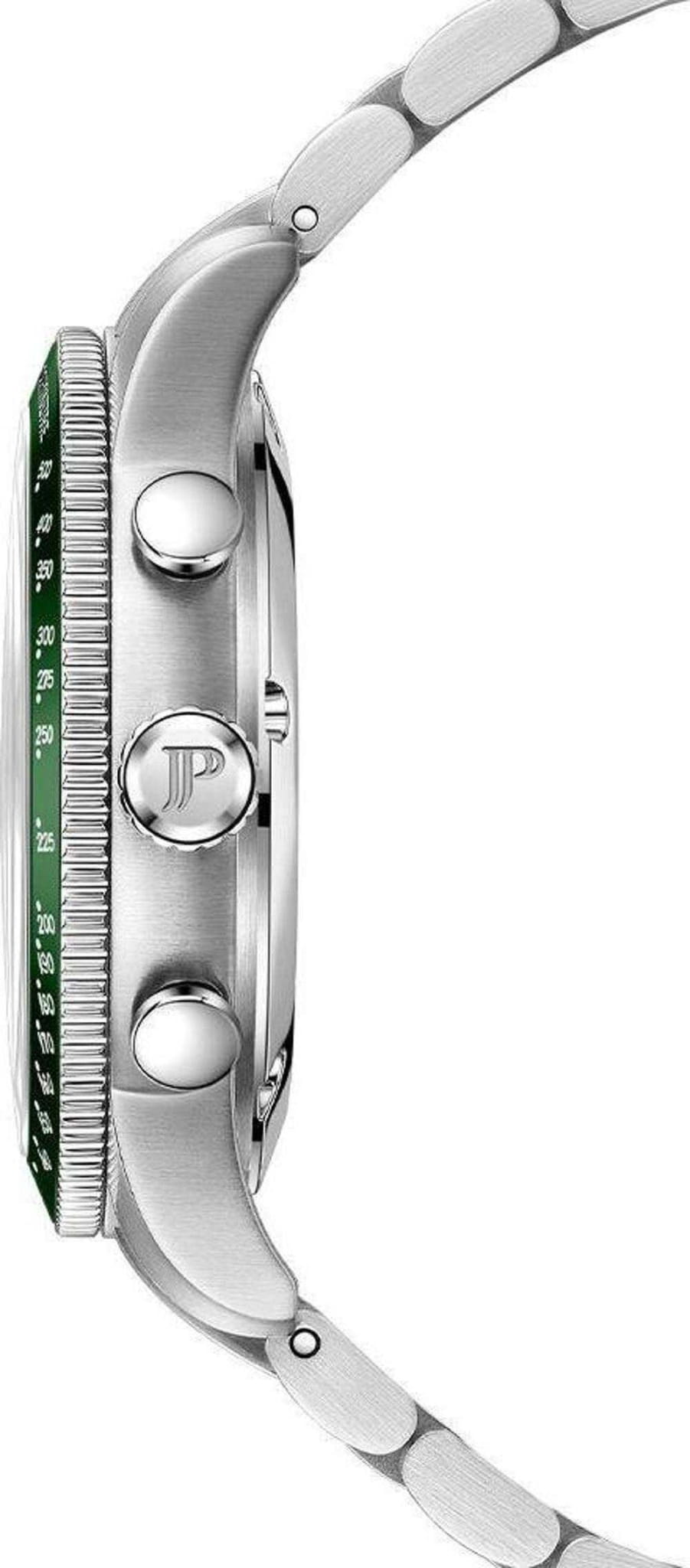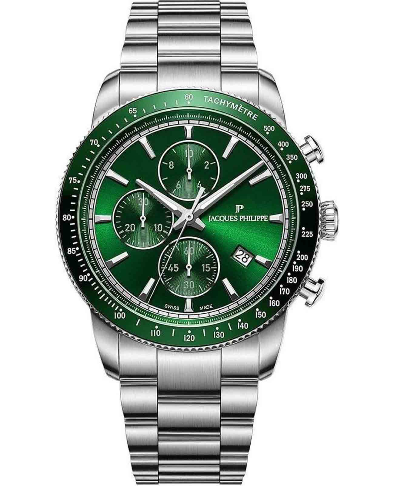 Швейцарские наручные часы Jacques Philippe JPQGC6913X6 сочетают в себе современный дизайн, надежность и функциональность, это стильные швейцарские часы с функцией хронографаХронографФункция позволяет измерять отрезки времени с особой точностью: часы, минуты, секунды. Верным признаком хронографа является наличие на циферблате 3 дополнительных окошек-счётчиков. и секундомераСекундомерСекундоме́р — прибор, способный измерять интервалы времени с точностью до долей секунды.. Корпус круглой формы диаметром 42 мм выполнен из прочной нержавеющей стали, а безельБезельВнешний ободок, закрепляющий стекло. В спортивных часах так называется поворотное кольцо с делениями на циферблате, выполняет роль таймера – замеряет отрезки времени на шкале. Неподвижный безель – элемент декора. Однонаправленно вращающийся безель на дайверских часах позволяет фиксировать моменты погружения и выныривания на поверхность. с элегантным зеленым IP-покрытиемIP-покрытиеМетод ионного напыления. Демонстрирует повышенную устойчивость к истиранию, окислению и химическим веществам. Под воздействием высокого давления и температуры около 1500°C молекулы металла надёжно соединяются с частицами корпуса часов.. Сапфировое стеклоСапфировое стеклоПрочный и надёжный материал из кристалла сапфира синтетического происхождения, характеризующийся особой твёрдостью и устойчивостью к царапинам и повреждениям. с антибликовым покрытиемАнтибликовое покрытиеСлой оксида металла в 0,13-0,3 микрон, благодаря которому стекло часов не бликует и не отражает свет. Антибликовое покрытие уменьшает отражение света в 10 раз, обеспечивая отличную читаемость показателей циферблата. надежно защищает зеленый циферблат от царапин и повреждений. Модель оснащена точным кварцевым механизмом, а также дополнительными функциями — тахиметромТахиметрРазмеченная шкала, располагается на ободке или безеле часов. Тахиметр позволяет рассчитать скорость на определённом участке пути, расстояние измеряется в километрах или милях. и индикатором даты, что делает часы не только стильным аксессуаром, но и практичным помощником на каждый день. Серебряный браслет шириной 22 мм удобно фиксируется на запястье с помощью застежки «бабочка»Застёжка "бабочка"Такой вид застёжки дополняется предохранителями, помогающими избежать случайного раскрытия браслета. Обладают изящным исполнением. . Стрелки имеют люминесцентное покрытиеЛюминесцентное покрытиеПозволяет считывать показания времени в темноте. Производители наносят на стрелки, часовые индексы, безель или поверхность циферблата светонакопительный состав, дающий холодное свечение. для удобства чтения времени в темноте. Водозащита 5 АТМ позволяет не снимать часы при дожде и случайных контактах с водой.