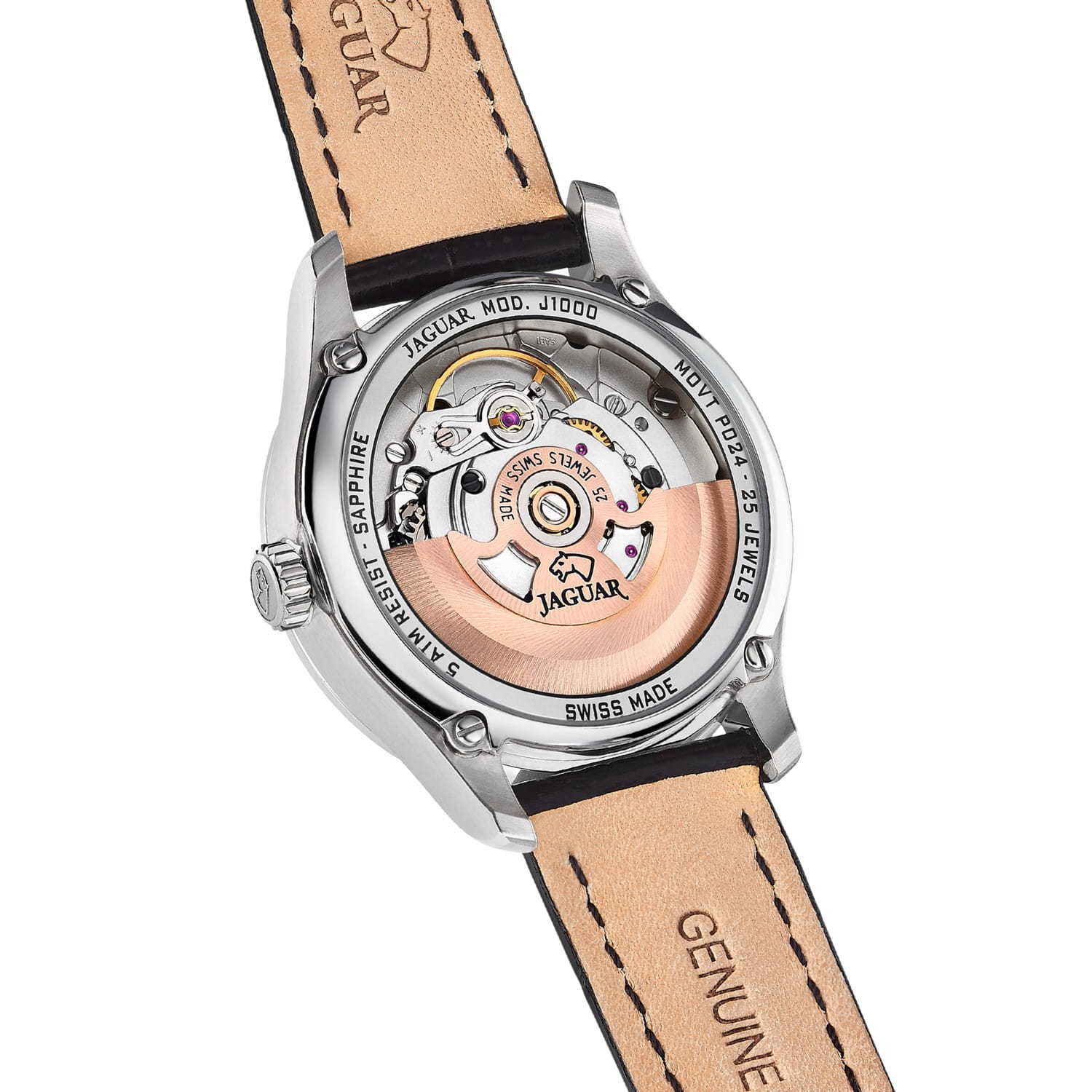 Женские швейцарские часы JAGUAR Automatic Woman J1000/A, механизм — автоподзавод. В часах с автоподзаводом заводная головка практически не используется, что исключает истирание ее материала и материала корпуса. Сапфировое стеклоСапфировое стеклоПрочный и надёжный материал из кристалла сапфира синтетического происхождения, характеризующийся особой твёрдостью и устойчивостью к царапинам и повреждениям. устойчивое к мелким механическим повреждениям. Корпус часов изготовлен из нержавеющей стали. Окошко даты находится в положении 6 часов. Класс водозащиты: 50 метров, позволит защитить корпус от случайных брызг или капель дождя. Кожаный ремешок на застёжке-бабочке с кнопкамиЗастёжка "бабочка"Такой вид застёжки дополняется предохранителями, помогающими избежать случайного раскрытия браслета. Обладают изящным исполнением. .
