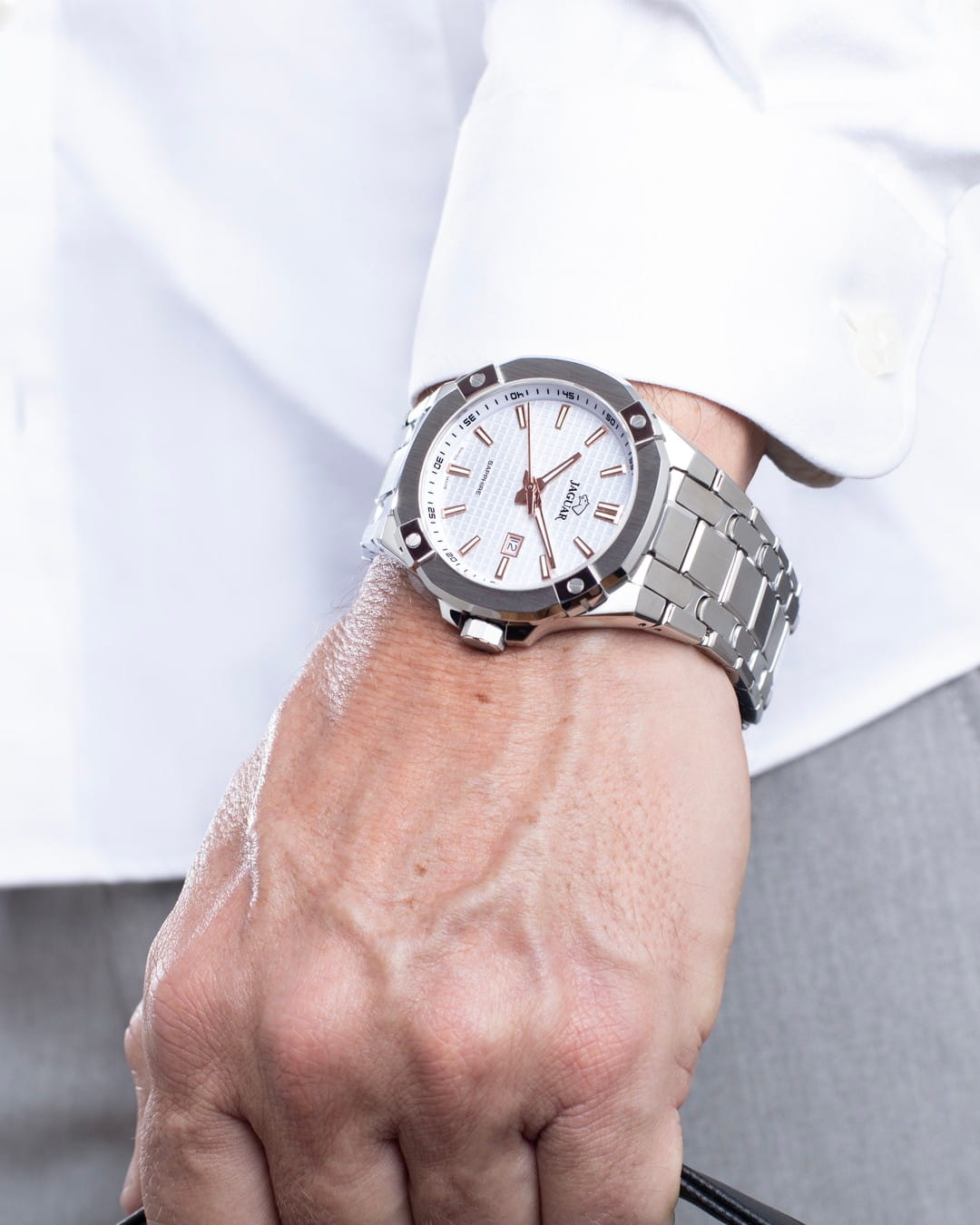 Мужские швейцарские часы JAGUAR Diplomatic J1009/1. Кварцевый швейцарский калибр Ronda 705. Сапфировое стеклоСапфировое стеклоПрочный и надёжный материал из кристалла сапфира синтетического происхождения, характеризующийся особой твёрдостью и устойчивостью к царапинам и повреждениям. устойчивое к мелким механическим повреждениям. Корпус и браслет часов изготовлены из нержавеющей стали. Стрелки и метки с люминесцентным покрытиемЛюминесцентное покрытиеПозволяет считывать показания времени в темноте. Производители наносят на стрелки, часовые индексы, безель или поверхность циферблата светонакопительный состав, дающий холодное свечение.. Окошко даты находится в положении 3 часа. Класс водозащиты: 100 метров, позволит плавать, нырять и заниматься другими водными видами спорта. Стальной браслет на раскладной застёжкеРаскладная застёжкаТакой тип застёжки используется только на браслетах из металла. Она никогда не раскрывается полностью, происходит разделение на 2 и более частей. Раскладывающая застёжка снизит вероятность потери часов к минимуму..