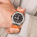 Окошко даты расположено в положении 3 часа, что обеспечивает удобный доступ к этой функции. Класс водозащиты 100 метров позволяет использовать часы для плавания, ныряния и занятий водными видами спорта.
