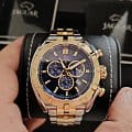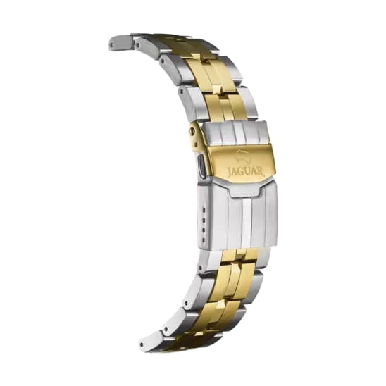 Мужские швейцарские часы-хронографХронографФункция позволяет измерять отрезки времени с особой точностью: часы, минуты, секунды. Верным признаком хронографа является наличие на циферблате 3 дополнительных окошек-счётчиков. Jaguar Executive J855/A. Кварцевый швейцарский калибр Ronda 5030d. Сапфировое стеклоСапфировое стеклоПрочный и надёжный материал из кристалла сапфира синтетического происхождения, характеризующийся особой твёрдостью и устойчивостью к царапинам и повреждениям. устойчивое к мелким механическим повреждениям. Корпус и браслет часов изготовлены из нержавеющей стали. Стрелки и метки с люминесцентным покрытиемЛюминесцентное покрытиеПозволяет считывать показания времени в темноте. Производители наносят на стрелки, часовые индексы, безель или поверхность циферблата светонакопительный состав, дающий холодное свечение.. Окошко даты находится в положении между «4» и «5 часами». Класс водозащиты: 100 метров, позволит плавать, нырять и заниматься другими водными видами спорта. Стальной браслет с частичным PVD-покрытиемPVDУльтратонкое покрытие наносится в технике вакуумного напыления, сочетает в себе нитрид титана особой прочности со слоем золота или оксида хрома. Несёт в себе декоративную или защитную функцию. на раскладной застёжкеРаскладная застёжкаТакой тип застёжки используется только на браслетах из металла. Она никогда не раскрывается полностью, происходит разделение на 2 и более частей. Раскладывающая застёжка снизит вероятность потери часов к минимуму.. БезельБезельВнешний ободок, закрепляющий стекло. В спортивных часах так называется поворотное кольцо с делениями на циферблате, выполняет роль таймера – замеряет отрезки времени на шкале. Неподвижный безель – элемент декора. Однонаправленно вращающийся безель на дайверских часах позволяет фиксировать моменты погружения и выныривания на поверхность. с PVD-покрытиемPVDУльтратонкое покрытие наносится в технике вакуумного напыления, сочетает в себе нитрид титана особой прочности со слоем золота или оксида хрома. Несёт в себе декоративную или защитную функцию..