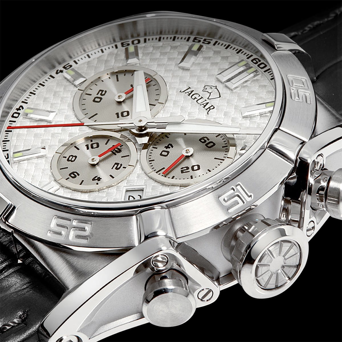 Мужские швейцарские часы-хронографХронографФункция позволяет измерять отрезки времени с особой точностью: часы, минуты, секунды. Верным признаком хронографа является наличие на циферблате 3 дополнительных окошек-счётчиков. Jaguar Executive Chrono J857/1. Кварцевый швейцарский калибр Ronda 5030d. Сапфировое стеклоСапфировое стеклоПрочный и надёжный материал из кристалла сапфира синтетического происхождения, характеризующийся особой твёрдостью и устойчивостью к царапинам и повреждениям. устойчивое к мелким механическим повреждениям. Корпус и браслет часов изготовлены из нержавеющей стали. Стрелки и метки с люминесцентным покрытиемЛюминесцентное покрытиеПозволяет считывать показания времени в темноте. Производители наносят на стрелки, часовые индексы, безель или поверхность циферблата светонакопительный состав, дающий холодное свечение.. Окошко даты находится в положении между «4» и «5 часами». Класс водозащиты: 100 метров, позволит плавать, нырять и заниматься другими водными видами спорта. Кожаный ремешок на стандартной застёжке.
