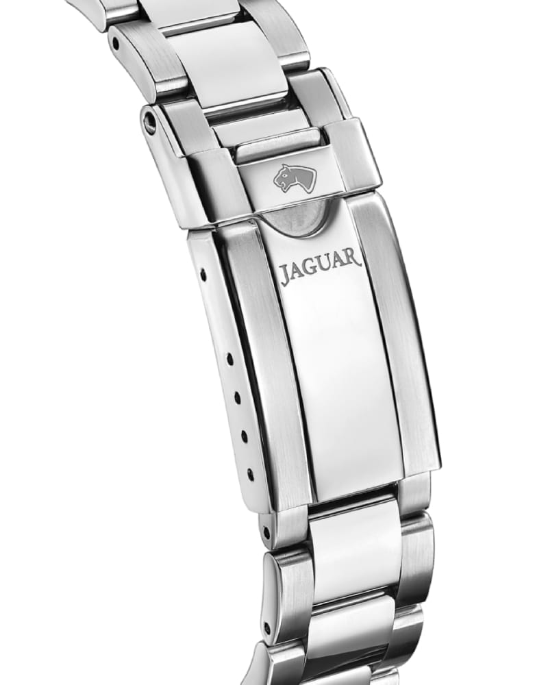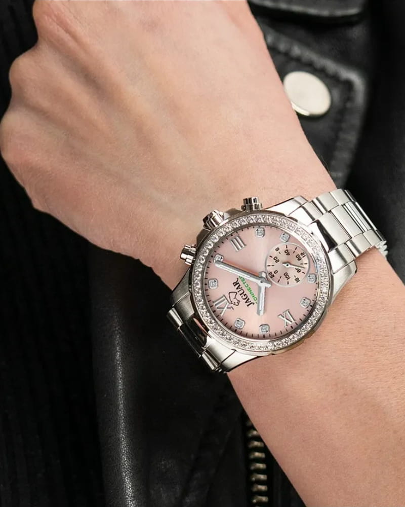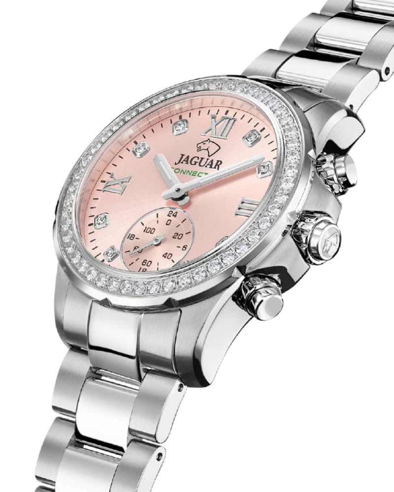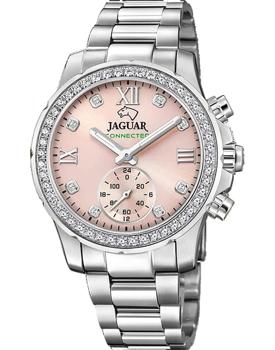 Jaguar J980/2 из коллекции Connected Lady — элегантные женские гибридные часы, сочетающие классический дизайн с современными технологиями. Корпус диаметром 37 мм выполнен из нержавеющей стали, что обеспечивает прочность и долговечность. Сапфировое стеклоСапфировое стеклоПрочный и надёжный материал из кристалла сапфира синтетического происхождения, характеризующийся особой твёрдостью и устойчивостью к царапинам и повреждениям. защищает циферблат от царапин и повреждений. Розовый циферблат с серебристыми индексами и стрелками подчёркивает изысканность дизайна. Часы оснащены функциями шагомера, уведомлений о звонках и сообщениях, управления музыкой и камерой смартфона, функции поиска телефона, а также автоматической синхронизации времени через Bluetooth. БезельБезельВнешний ободок, закрепляющий стекло. В спортивных часах так называется поворотное кольцо с делениями на циферблате, выполняет роль таймера – замеряет отрезки времени на шкале. Неподвижный безель – элемент декора. Однонаправленно вращающийся безель на дайверских часах позволяет фиксировать моменты погружения и выныривания на поверхность. инкрустирован кристаллами. Браслет из нержавеющей стали гарантирует комфортное ношение. Раскладная застёжкаРаскладная застёжкаТакой тип застёжки используется только на браслетах из металла. Она никогда не раскрывается полностью, происходит разделение на 2 и более частей. Раскладывающая застёжка снизит вероятность потери часов к минимуму. обеспечивает надёжную фиксацию. Водозащита до 5 ATM (50 метров) делает часы подходящими для повседневного использования. Jaguar J980/2 — это идеальный выбор для женщин, ценящих сочетание элегантности, функциональности и современных технологий.