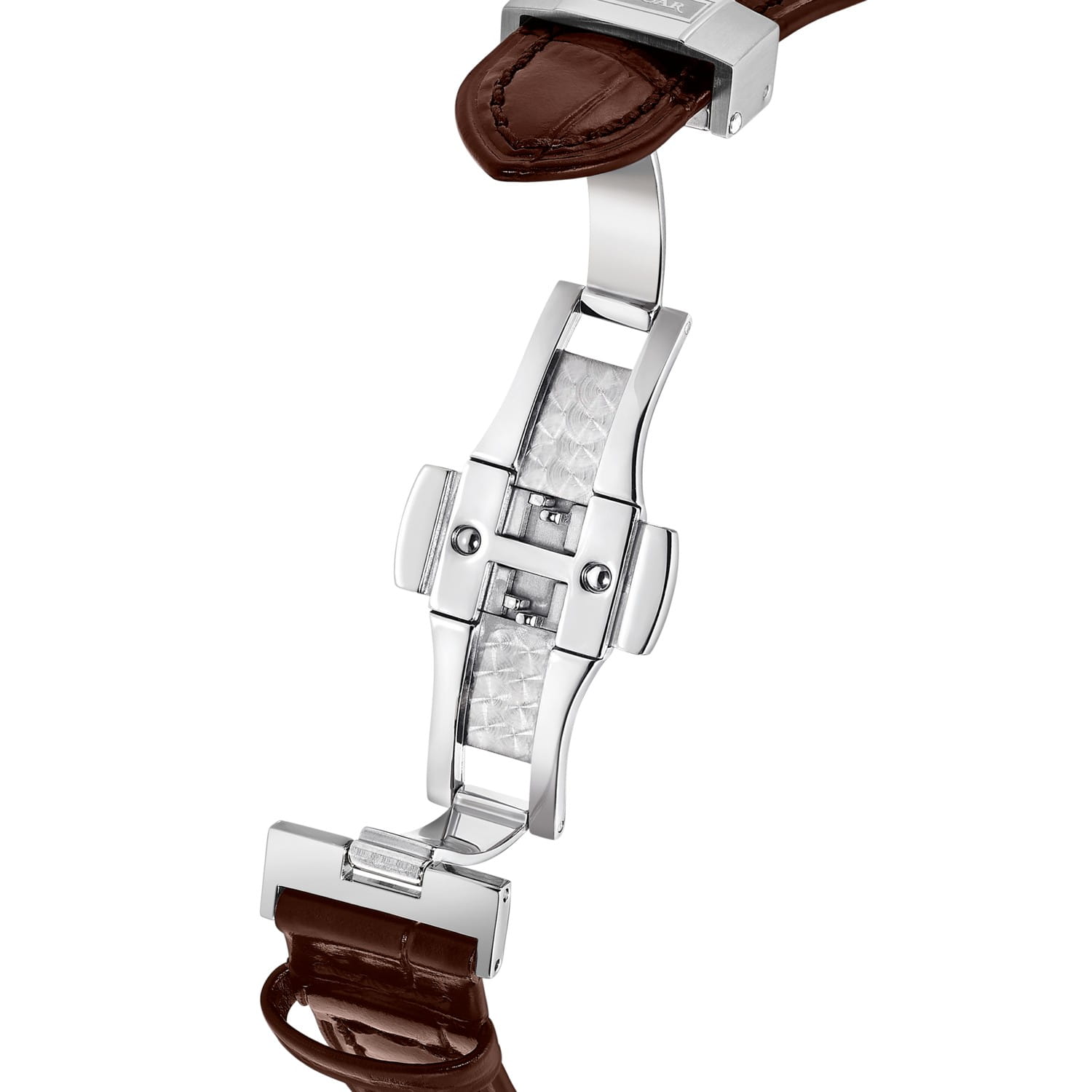 Женские швейцарские часы Jaguar Automatic Open Heart J995/A, механизм — автоподзавод. В часах с автоподзаводом заводная головка практически не используется, что исключает истирание ее материала и материала корпуса. Сапфировое стеклоСапфировое стеклоПрочный и надёжный материал из кристалла сапфира синтетического происхождения, характеризующийся особой твёрдостью и устойчивостью к царапинам и повреждениям. устойчивое к мелким механическим повреждениям. Корпус часов изготовлен из нержавеющей стали. Класс водозащиты: 50 метров, позволит защитить корпус от случайных брызг или капель дождя. Циферблат украшен кристаллами в роли часовых индексов, крупная апертура в виде сердца, открывающая обзор на балансовое колесо механизма. БезельБезельВнешний ободок, закрепляющий стекло. В спортивных часах так называется поворотное кольцо с делениями на циферблате, выполняет роль таймера – замеряет отрезки времени на шкале. Неподвижный безель – элемент декора. Однонаправленно вращающийся безель на дайверских часах позволяет фиксировать моменты погружения и выныривания на поверхность. с PVD-покрытиемPVDУльтратонкое покрытие наносится в технике вакуумного напыления, сочетает в себе нитрид титана особой прочности со слоем золота или оксида хрома. Несёт в себе декоративную или защитную функцию.. Кожаный ремешок на застёжке «бабочка» с кнопкамиЗастёжка "бабочка"Такой вид застёжки дополняется предохранителями, помогающими избежать случайного раскрытия браслета. Обладают изящным исполнением. .