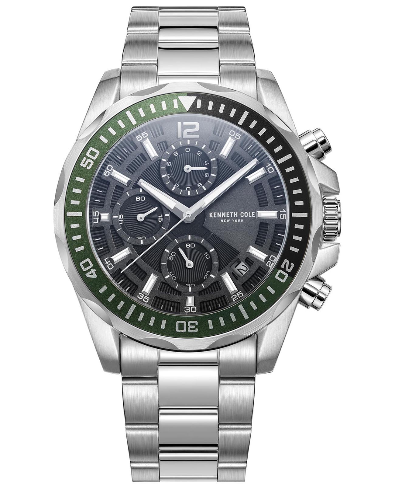 Мужские кварцевые часы-хронографХронографФункция позволяет измерять отрезки времени с особой точностью: часы, минуты, секунды. Верным признаком хронографа является наличие на циферблате 3 дополнительных окошек-счётчиков. с секундомеромСекундомерСекундоме́р — прибор, способный измерять интервалы времени с точностью до долей секунды. Kenneth Cole Dress Sport KCWGK2222202, кварцевый механизм с высокой точностью. Класс водозащиты: 30 метров, позволит защитить корпус от случайных брызг или капель дождя. Корпус часов изготовлен из стали. Стальной браслет на раскладной застёжкеРаскладная застёжкаТакой тип застёжки используется только на браслетах из металла. Она никогда не раскрывается полностью, происходит разделение на 2 и более частей. Раскладывающая застёжка снизит вероятность потери часов к минимуму.. Заводная головка с защитой. БезельБезельВнешний ободок, закрепляющий стекло. В спортивных часах так называется поворотное кольцо с делениями на циферблате, выполняет роль таймера – замеряет отрезки времени на шкале. Неподвижный безель – элемент декора. Однонаправленно вращающийся безель на дайверских часах позволяет фиксировать моменты погружения и выныривания на поверхность. с IP-покрытиемIP-покрытиеМетод ионного напыления. Демонстрирует повышенную устойчивость к истиранию, окислению и химическим веществам. Под воздействием высокого давления и температуры около 1500°C молекулы металла надёжно соединяются с частицами корпуса часов.. Окошко даты находится в положении между 4 и 5 часами. Стрелки и метки с люминесцентным покрытиемЛюминесцентное покрытиеПозволяет считывать показания времени в темноте. Производители наносят на стрелки, часовые индексы, безель или поверхность циферблата светонакопительный состав, дающий холодное свечение..
