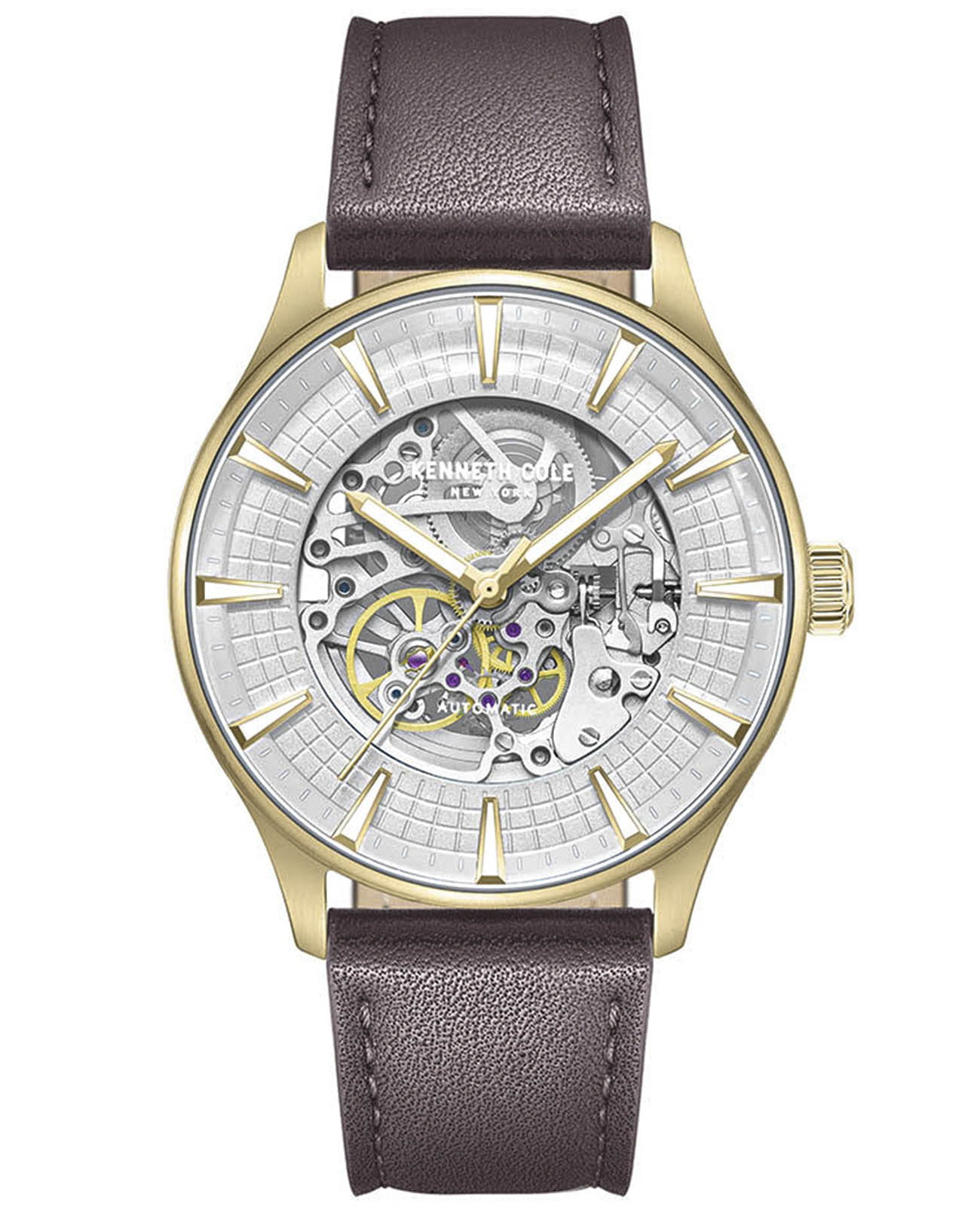 Мужские механические часы с автоподзаводом Kenneth Cole KCWGX0057901 — это стильный и современный аксессуар, подчеркивающий индивидуальность владельца. Корпус диаметром 43,5 мм выполнен из стали с IP-покрытиемIP-покрытиеМетод ионного напыления. Демонстрирует повышенную устойчивость к истиранию, окислению и химическим веществам. Под воздействием высокого давления и температуры около 1500°C молекулы металла надёжно соединяются с частицами корпуса часов. розового золота. Циферблат серебристого цвета оснащён люминесцентным покрытиемЛюминесцентное покрытиеПозволяет считывать показания времени в темноте. Производители наносят на стрелки, часовые индексы, безель или поверхность циферблата светонакопительный состав, дающий холодное свечение. и частично скелетонизирован, что позволяет наблюдать за работой автоматического механизма. Циферблат защищён минеральным стекломМинеральное стеклоМинеральное стекло представляет собой искусственно выращенный минерал кварца. Такое стекло отличается особой устойчивостью к повреждениям и царапинам. Уступает по некоторым качествам сапфировому стеклу. и оформлен метками в виде штрихов. Часы оснащены ремешком из натуральной кожи тёмно-коричневого цвета с классической пряжкой. Водонепроницаемость 50 м позволяет использовать часы для плавания и повседневного ношения. Универсальный выбор.