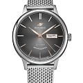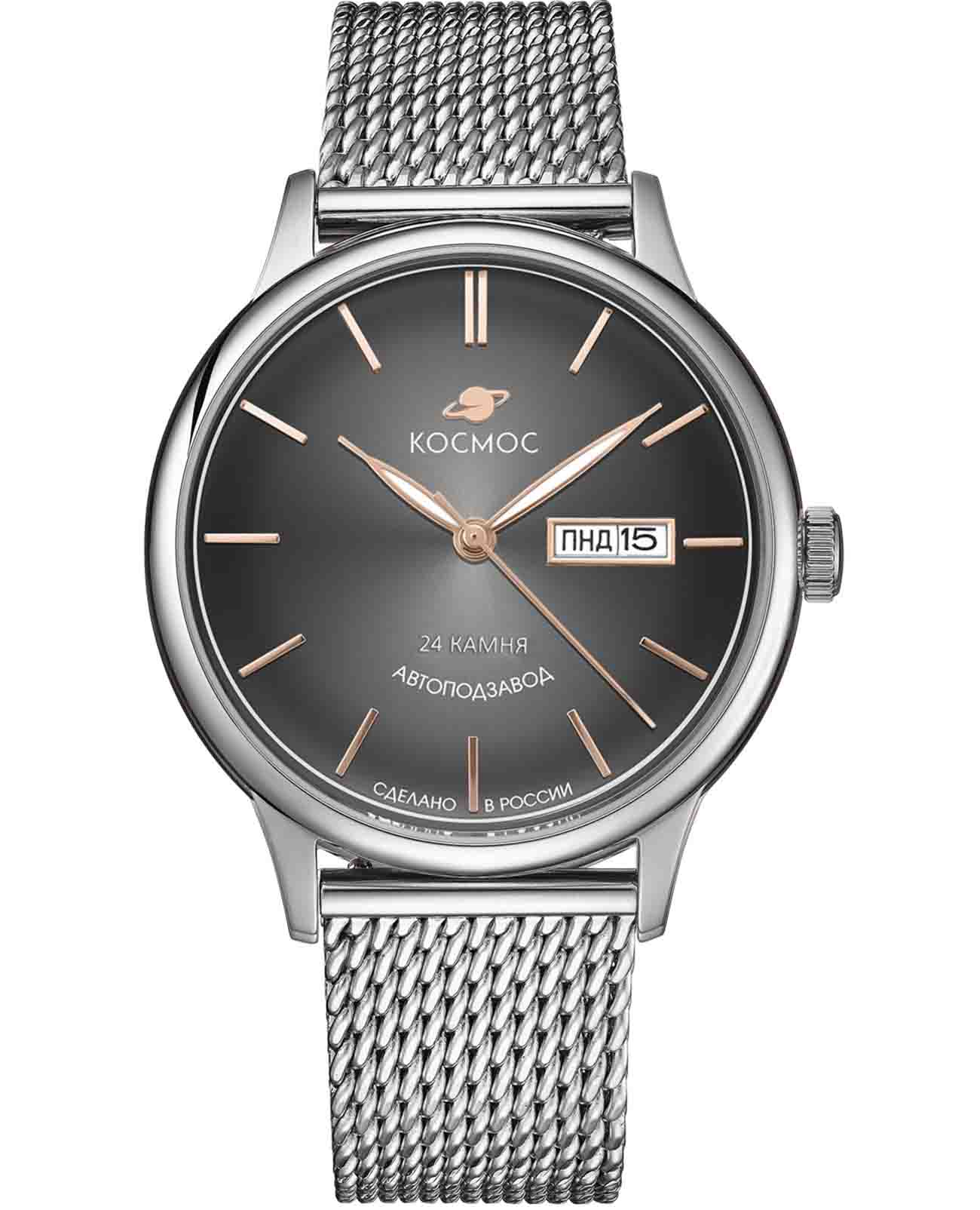 Российские мужские механические часы Космос K 043.10.34 с автоподзаводом оснащены корпусом из нержавеющей стали 316L диаметром 41 мм и защищены минеральным стекломМинеральное стеклоМинеральное стекло представляет собой искусственно выращенный минерал кварца. Такое стекло отличается особой устойчивостью к повреждениям и царапинам. Уступает по некоторым качествам сапфировому стеклу.. Дополнен функциями отображения даты и дня недели. Заводная головка декорирована логотипом бренда в виде стилизованного изображения планеты. Стрелки с люминесцентным покрытиемЛюминесцентное покрытиеПозволяет считывать показания времени в темноте. Производители наносят на стрелки, часовые индексы, безель или поверхность циферблата светонакопительный состав, дающий холодное свечение. обеспечивают хорошую видимость в темное время суток. Часы имеют водонепроницаемость 50 метров, позволит защитить корпус от случайных брызг или капель дождя. Модель комплектуется браслетом из нержавеющей стали 316L с миланским плетением на раскладном замкеРаскладной замокДанный вариант застежки используется только на часах с металлическим браслетом. Отличительная особенность такого крепления в том, что длина браслета становится универсальной и вы можете самостоятельно отрегулировать нужный вам размер – застежка просто двигается по браслету часов.. Специальные крепежи позволяют легко заменить браслет на часах самостоятельно. Прочный корпус и надежный механизм делают эти часы универсальным аксессуаром для повседневного использования. Уникальный дизайн и высокое качество материалов подчеркивают индивидуальность владельца.