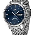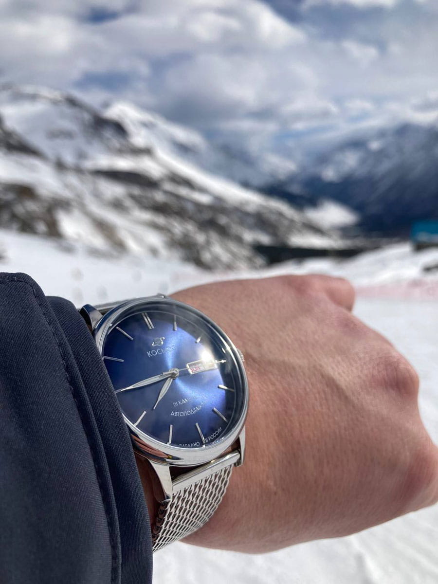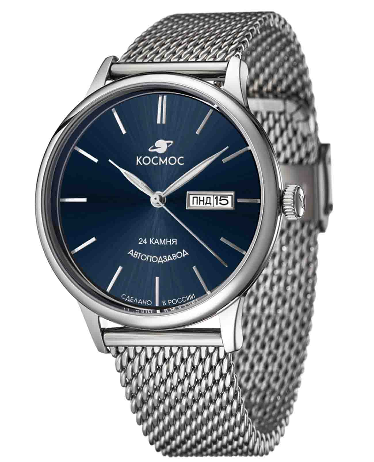 Российские мужские механические часы Космос K 043.10.36 с автоподзаводом оснащены корпусом из нержавеющей стали 316L диаметром 41 мм и защищены минеральным стекломМинеральное стеклоМинеральное стекло представляет собой искусственно выращенный минерал кварца. Такое стекло отличается особой устойчивостью к повреждениям и царапинам. Уступает по некоторым качествам сапфировому стеклу.. Дополнен функциями отображения даты и дня недели. Заводная головка декорирована логотипом бренда в виде стилизованного изображения планеты. Часы имеют водонепроницаемость 50 метров, позволит защитить корпус от случайных брызг или капель дождя. Модель комплектуется браслетом из нержавеющей стали 316L с миланским плетением на раскладном замкеРаскладной замокДанный вариант застежки используется только на часах с металлическим браслетом. Отличительная особенность такого крепления в том, что длина браслета становится универсальной и вы можете самостоятельно отрегулировать нужный вам размер – застежка просто двигается по браслету часов.. Специальные крепежи позволяют легко заменить браслет на часах самостоятельно. Прочный корпус и надежный механизм делают эти часы универсальным аксессуаром для повседневного использования. Уникальный дизайн и высокое качество материалов подчеркивают индивидуальность владельца.