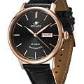 Российские мужские механические часы Космос K 043.41.31 из коллекции Юпитер с автоподзаводом оснащены корпусом из нержавеющей стали 316L с PVD-покрытиемPVDУльтратонкое покрытие наносится в технике вакуумного напыления, сочетает в себе нитрид титана особой прочности со слоем золота или оксида хрома. Несёт в себе декоративную или защитную функцию. диаметром 41 мм и толщиной 14 мм. Циферблат защищен минеральным стекломМинеральное стеклоМинеральное стекло представляет собой искусственно выращенный минерал кварца. Такое стекло отличается особой устойчивостью к повреждениям и царапинам. Уступает по некоторым качествам сапфировому стеклу., выпуклым с обеих сторон. Циферблат дополнен функциями отображения даты и дня недели. Прозрачная задняя крышка позволяет наблюдать за работой механизма. Заводная головка украшена логотипом бренда в виде стилизованного изображения планеты. Часы имеют водонепроницаемость 50 метров, позволит защитить корпус от случайных брызг или капель дождя. Модель комплектуется кожаным ремешком на стандартной застежке. Специальные крепежи позволяют легко заменить браслет на часах самостоятельно. Прочный корпус и надежный механизм делают эти часы универсальным аксессуаром для повседневного использования. Уникальный дизайн и высокое качество материалов подчеркивают индивидуальность владельца.
