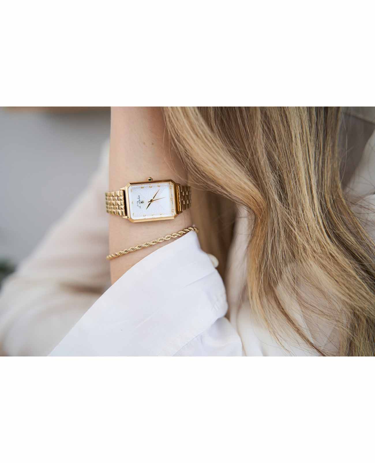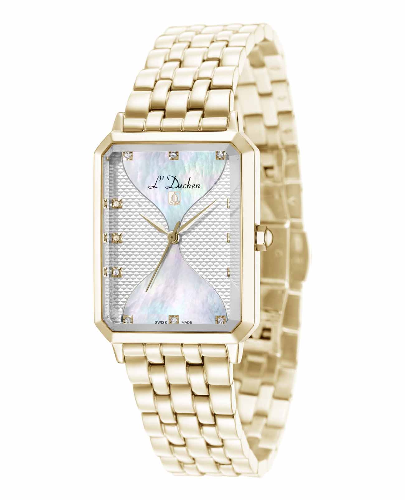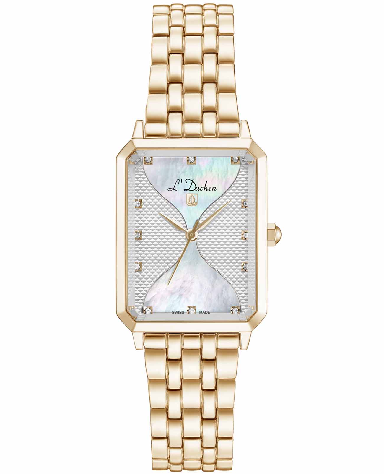 Женские швейцарские L'Duchen Pyramide D 591.20.33, кварцевый механизм с высокой точностью. Сапфировое стеклоСапфировое стеклоПрочный и надёжный материал из кристалла сапфира синтетического происхождения, характеризующийся особой твёрдостью и устойчивостью к царапинам и повреждениям. устойчивое к появлению царапин, обладающее высокой прозрачностью. Корпус часов выполнен из нержавеющей стали с PVD-покрытиемPVDУльтратонкое покрытие наносится в технике вакуумного напыления, сочетает в себе нитрид титана особой прочности со слоем золота или оксида хрома. Несёт в себе декоративную или защитную функцию.. Циферблат украшен фианитами. Класс водозащиты: 50 метров, позволит защитить корпус от случайных брызг или капель дождя. Стальной браслет с PVD-покрытиемPVDУльтратонкое покрытие наносится в технике вакуумного напыления, сочетает в себе нитрид титана особой прочности со слоем золота или оксида хрома. Несёт в себе декоративную или защитную функцию. на застёжке-бабочке с кнопкамиЗастёжка "бабочка"Такой вид застёжки дополняется предохранителями, помогающими избежать случайного раскрытия браслета. Обладают изящным исполнением. .