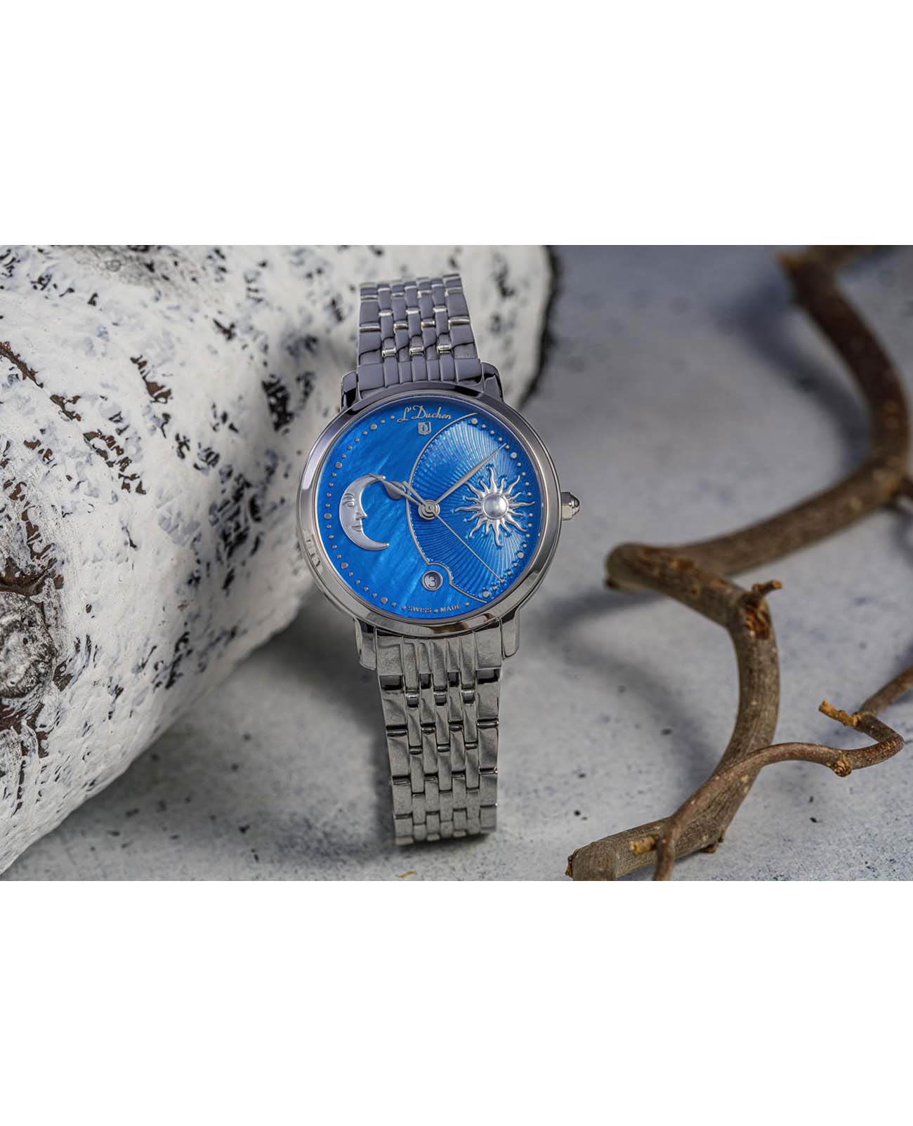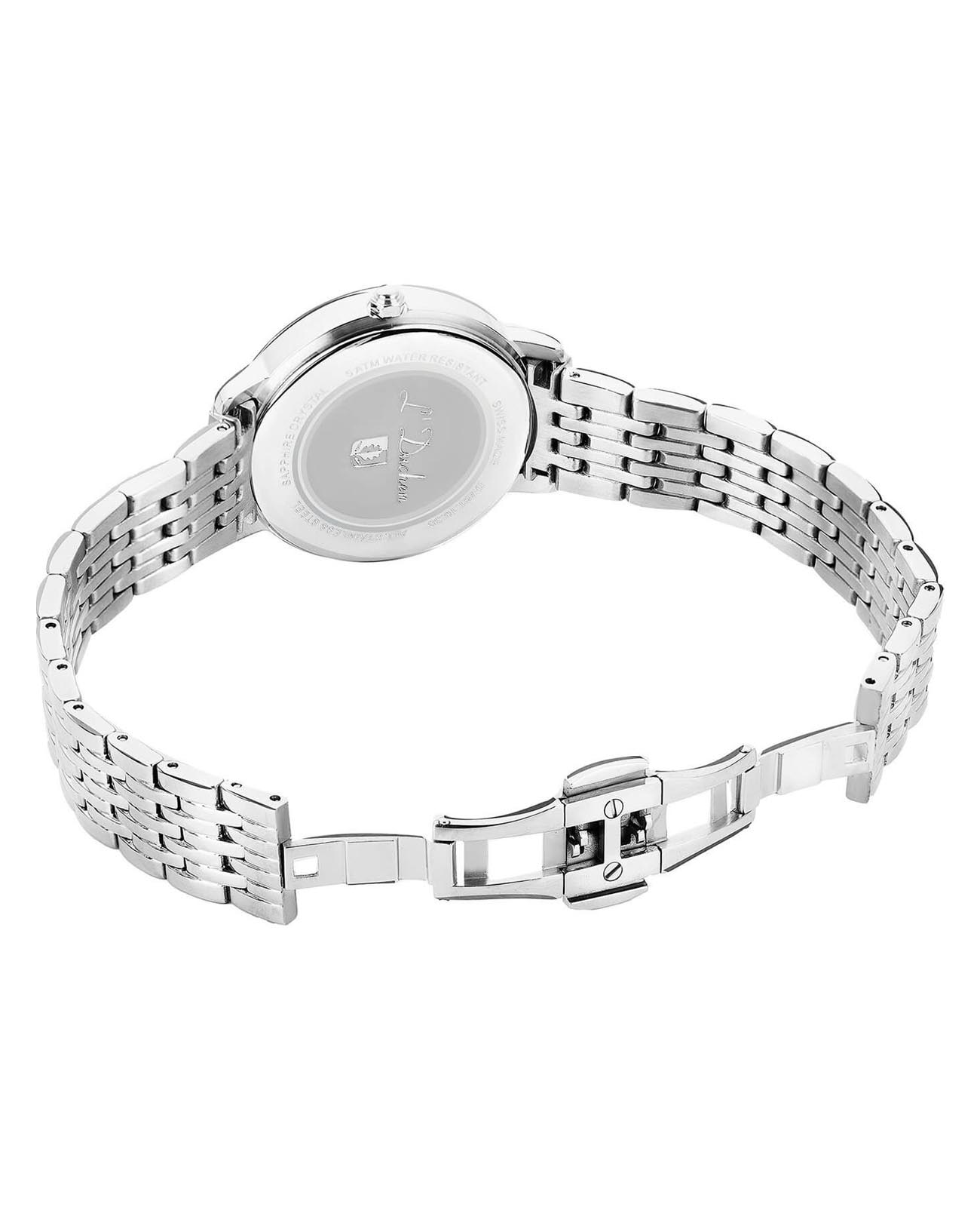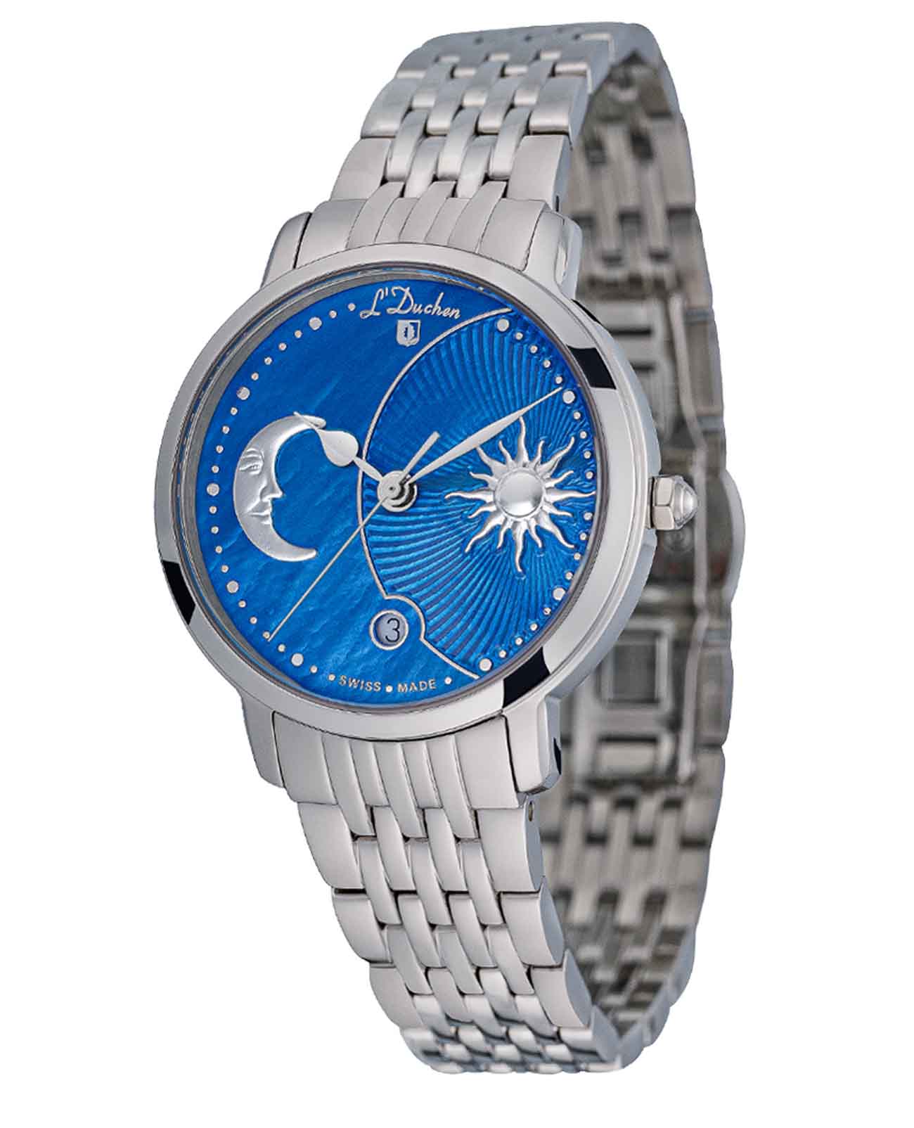 Женские швейцарские часы L'Duchen Day & Night D 781.10.32, кварцевый механизм с высокой точностью. Сапфировое стеклоСапфировое стеклоПрочный и надёжный материал из кристалла сапфира синтетического происхождения, характеризующийся особой твёрдостью и устойчивостью к царапинам и повреждениям. устойчивое к появлению царапин, обладающее высокой прозрачностью. Корпус часов выполнен из нержавеющей стали. Окошко даты находится в положении 6 часов. Класс водозащиты: 50 метров, позволит защитить корпус от случайных брызг или капель дождя. Стальной браслет на застёжке «бабочка» с кнопкамиЗастёжка "бабочка"Такой вид застёжки дополняется предохранителями, помогающими избежать случайного раскрытия браслета. Обладают изящным исполнением. .