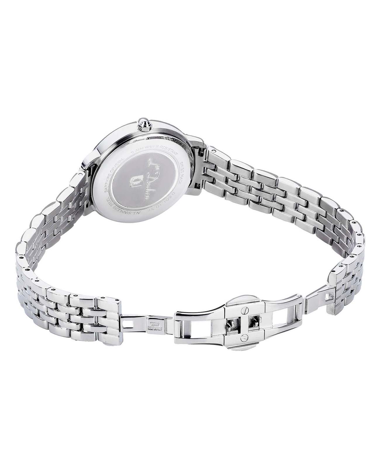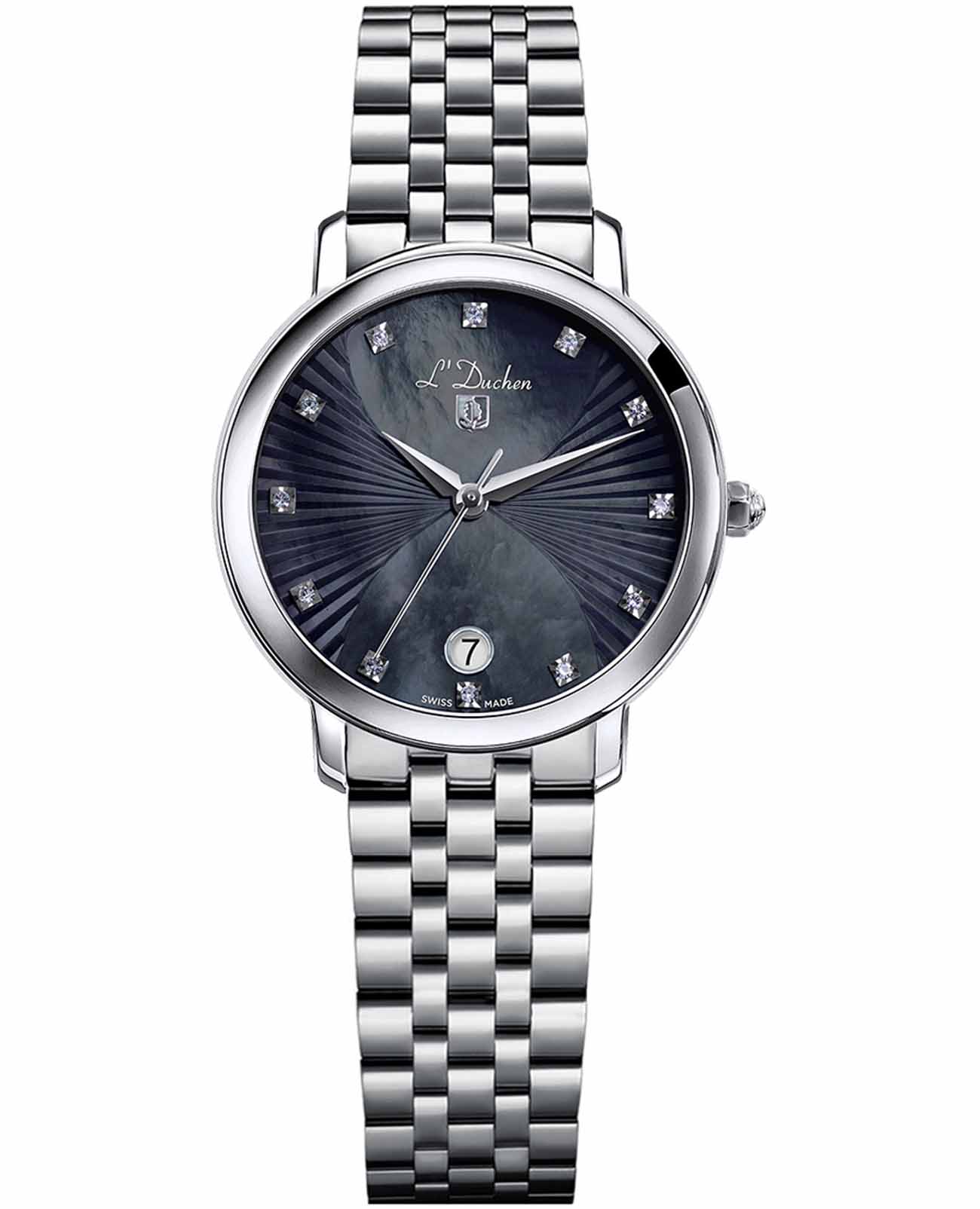 Женские швейцарские часы L'Duchen Eternity D 801.10.31, кварцевый механизм с высокой точностью. Сапфировое стеклоСапфировое стеклоПрочный и надёжный материал из кристалла сапфира синтетического происхождения, характеризующийся особой твёрдостью и устойчивостью к царапинам и повреждениям. устойчивое к появлению царапин, обладающее высокой прозрачностью. Корпус часов выполнен из нержавеющей стали. Окошко даты находится в положении 6 часов. Класс водозащиты: 50 метров, позволит защитить корпус от случайных брызг или капель дождя. Стальной браслет на застёжке «бабочка» с кнопкамиЗастёжка "бабочка"Такой вид застёжки дополняется предохранителями, помогающими избежать случайного раскрытия браслета. Обладают изящным исполнением. .
