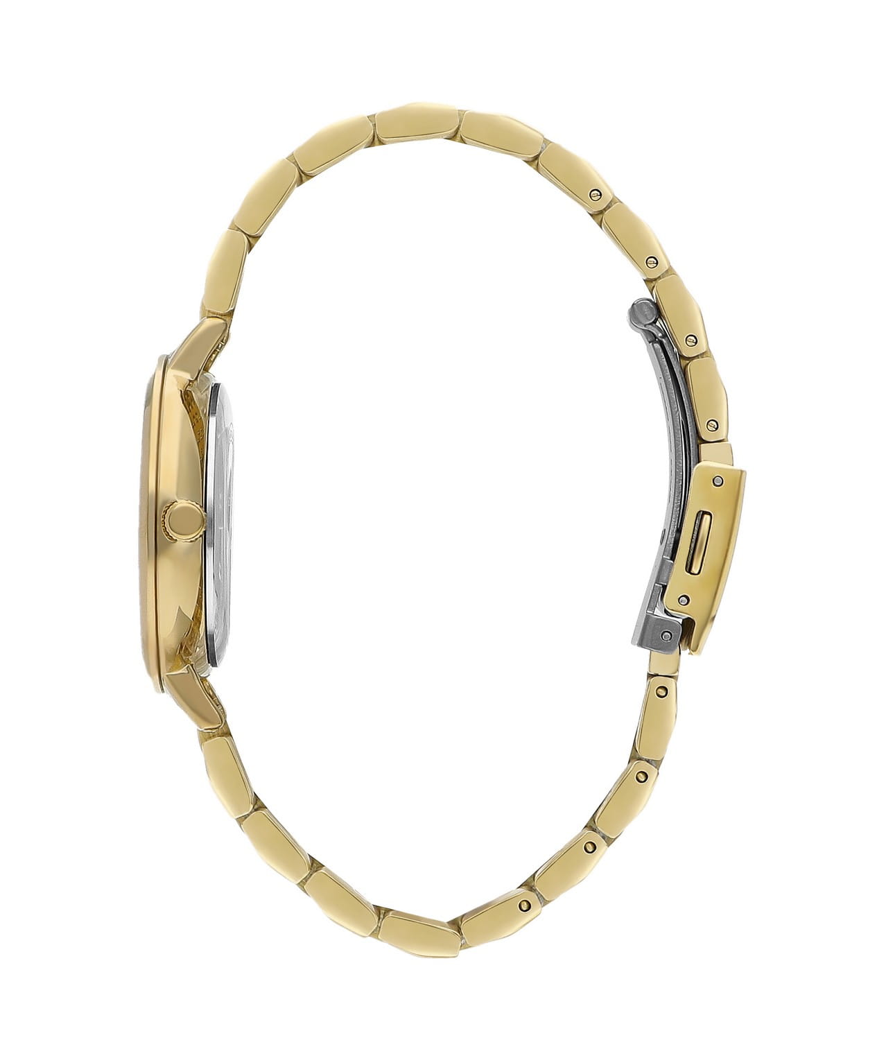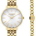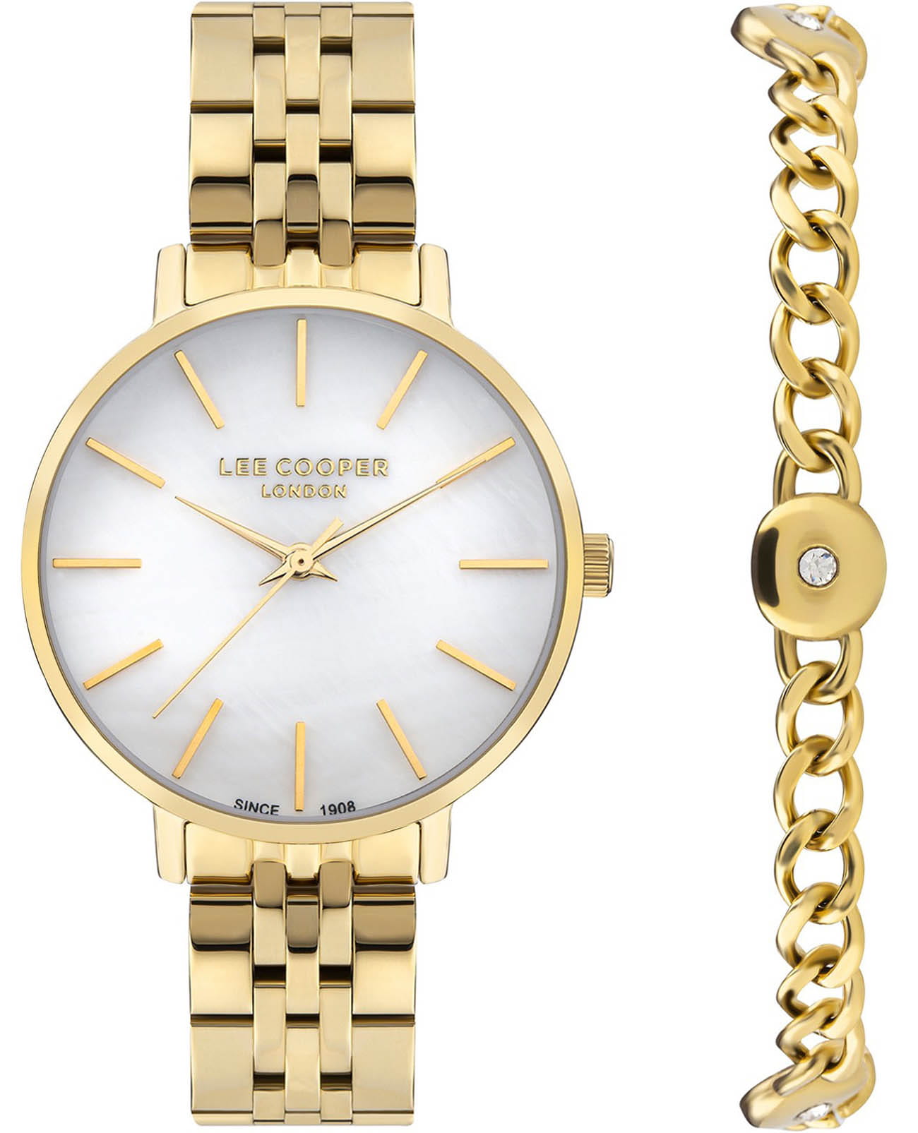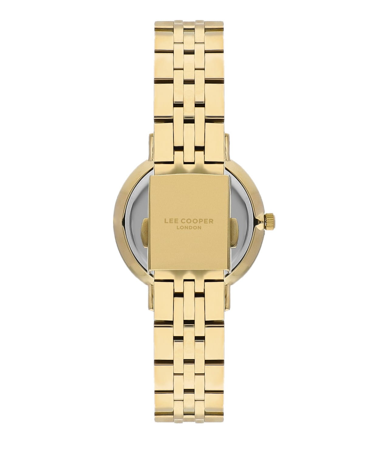 Женские часы Lee Cooper LC07857.120 — это стильное сочетание элегантности и современного дизайна. Изящный круглый корпус диаметром 34 мм выполнен из суперметалла с IP-покрытиемIP-покрытиеМетод ионного напыления. Демонстрирует повышенную устойчивость к истиранию, окислению и химическим веществам. Под воздействием высокого давления и температуры около 1500°C молекулы металла надёжно соединяются с частицами корпуса часов. золотого цвета, что придает модели особый блеск. Перламутровый циферблат защищен минеральным стекломМинеральное стеклоМинеральное стекло представляет собой искусственно выращенный минерал кварца. Такое стекло отличается особой устойчивостью к повреждениям и царапинам. Уступает по некоторым качествам сапфировому стеклу., обеспечивающим устойчивость к царапинам. Метки в виде штрихов. Часы оснащены надежным кварцевым механизмом, а стальной браслет с IP-покрытиемIP-покрытиеМетод ионного напыления. Демонстрирует повышенную устойчивость к истиранию, окислению и химическим веществам. Под воздействием высокого давления и температуры около 1500°C молекулы металла надёжно соединяются с частицами корпуса часов. на раскладной застёжкеРаскладная застёжкаТакой тип застёжки используется только на браслетах из металла. Она никогда не раскрывается полностью, происходит разделение на 2 и более частей. Раскладывающая застёжка снизит вероятность потери часов к минимуму. гарантирует комфортную посадку на запястье. Водозащита 30 метров защищает модель от случайных брызг и дождя. В комплекте к часам идет дополнительный браслет в цвет часов. Lee Cooper — отличный выбор для тех, кто ценит утонченность и качество.
