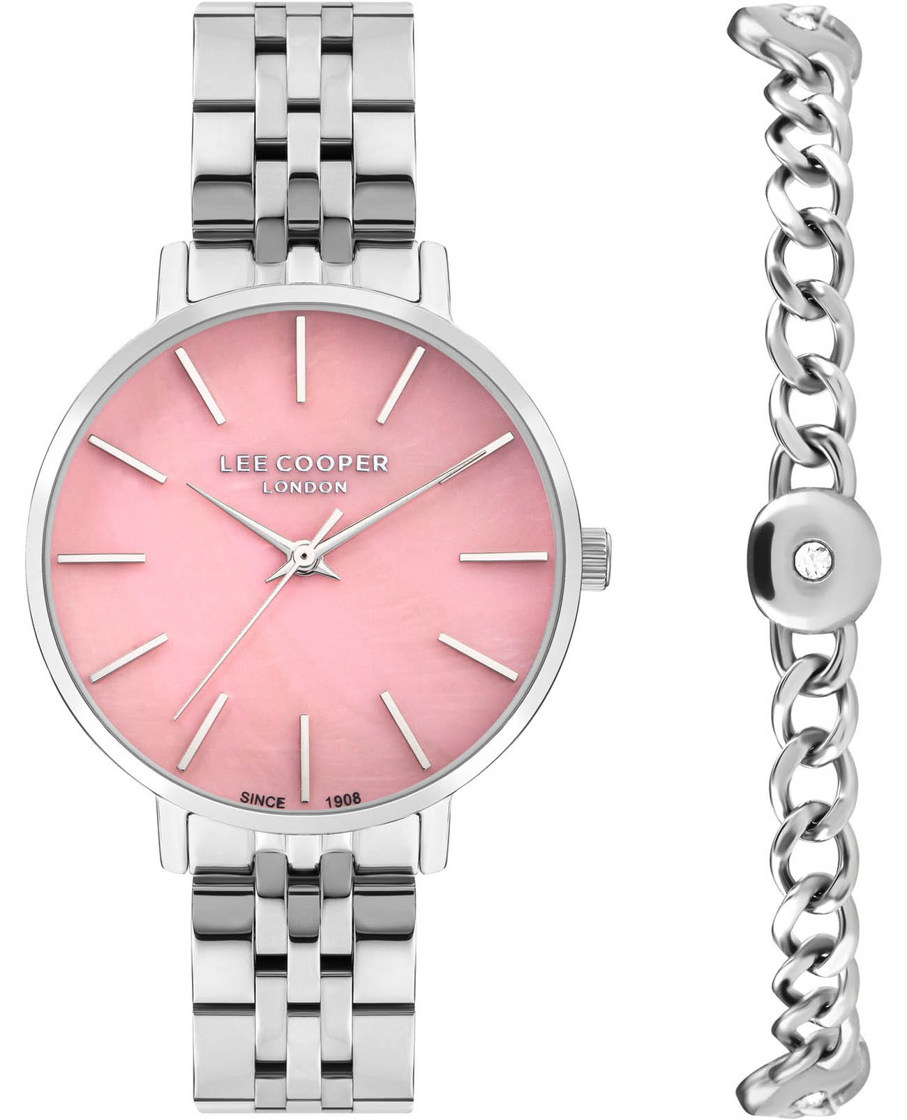 Женские часы Lee Cooper LC07857.380 — это стильное сочетание элегантности и современного дизайна. Изящный круглый корпус диаметром 34 мм выполнен из суперметалла серебристого цвета, что придает модели особый блеск. Розовый циферблат защищен минеральным стекломМинеральное стеклоМинеральное стекло представляет собой искусственно выращенный минерал кварца. Такое стекло отличается особой устойчивостью к повреждениям и царапинам. Уступает по некоторым качествам сапфировому стеклу., обеспечивающим устойчивость к царапинам. Метки в виде штрихов. Часы оснащены надежным кварцевым механизмом, а стальной браслет на раскладной застёжкеРаскладная застёжкаТакой тип застёжки используется только на браслетах из металла. Она никогда не раскрывается полностью, происходит разделение на 2 и более частей. Раскладывающая застёжка снизит вероятность потери часов к минимуму. гарантирует комфортную посадку на запястье. Водозащита 30 метров защищает модель от случайных брызг и дождя. В комплекте к часам идет дополнительный браслет. Lee Cooper — отличный выбор для тех, кто ценит утонченность и качество.