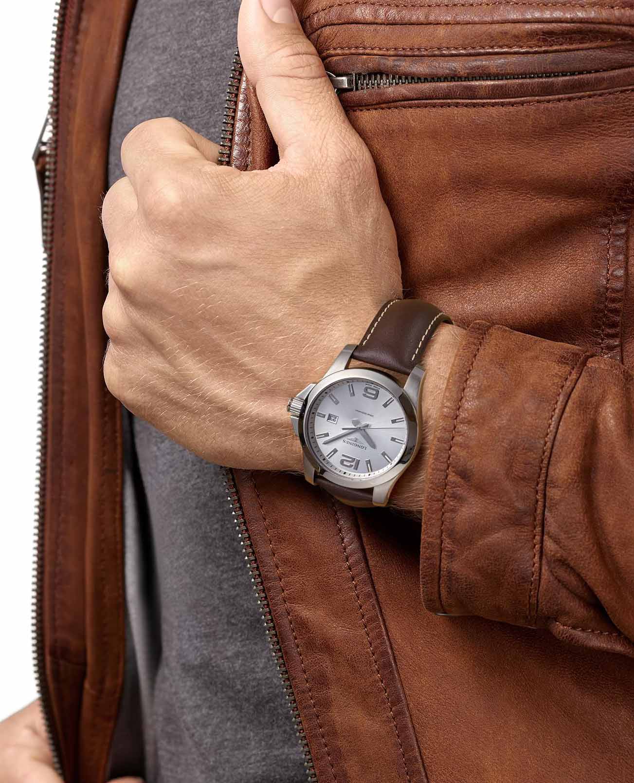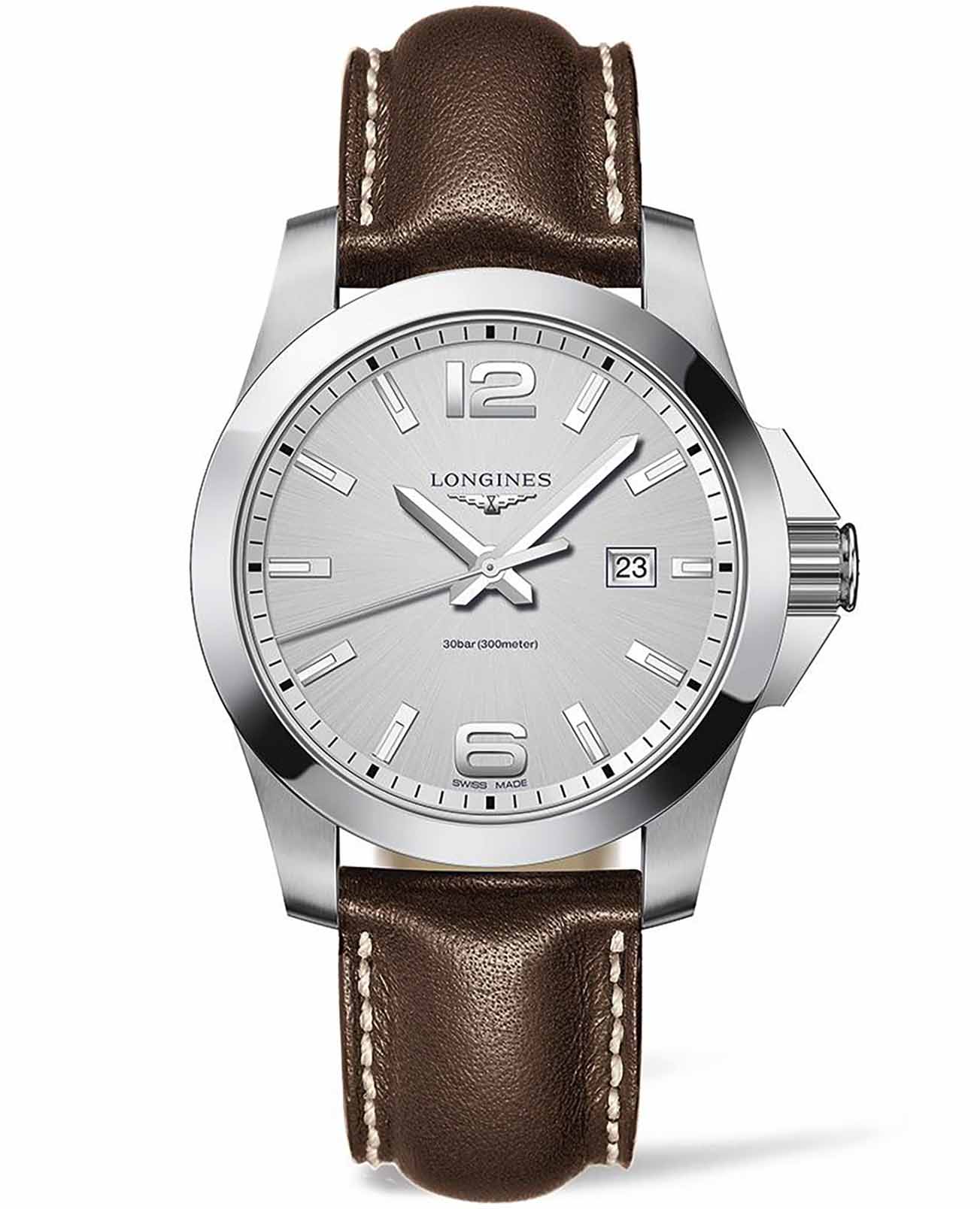 Часы Longines Conquest (артикул L37604765) сочетают спортивную элегантность и высокую функциональность, характерные для коллекции Conquest. Корпус диаметром 43 мм выполнен из нержавеющей стали с водозащитой до 30 бар (300 метров). Завинчивающаяся заводная головка и задняя крышка подчёркивают надёжность. Серебристый циферблат с солнечным узором оснащён накладными арабскими цифрами и индексами, стрелками с люминесцентным покрытиемЛюминесцентное покрытиеПозволяет считывать показания времени в темноте. Производители наносят на стрелки, часовые индексы, безель или поверхность циферблата светонакопительный состав, дающий холодное свечение., а также окошком даты в положении «3 часа». Циферблат защищён сапфировым стекломСапфировое стеклоПрочный и надёжный материал из кристалла сапфира синтетического происхождения, характеризующийся особой твёрдостью и устойчивостью к царапинам и повреждениям. с антибликовым покрытием.