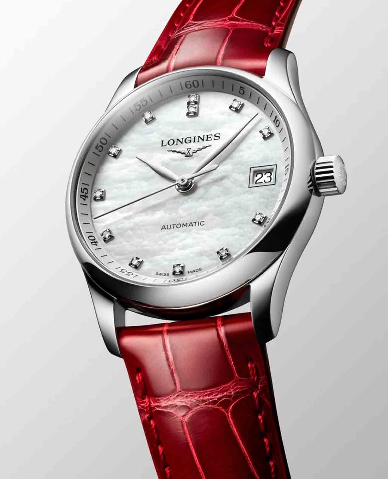 Швейцарские механические часы Longines Master Collection L2.357.4.87.2. Сапфировое стеклоСапфировое стеклоПрочный и надёжный материал из кристалла сапфира синтетического происхождения, характеризующийся особой твёрдостью и устойчивостью к царапинам и повреждениям. устойчивое к появлению царапин, обладающее высокой прозрачностью. Корпус часов изготовлен из нержавеющей стали. Циферблат с 12 бриллиантами группы Top Wesselton VS-SI общим весом 0.055 карата. Окошко даты в положении 3 часа. Автоматический механизм с частотой баланса 25 200 полуколебаний в час и запасом хода, которого хватает примерно на 72 часа работы. Класс водозащиты: 30 метров, позволит защитить корпус от случайных брызг или капель дождя. Ремешок из кожи аллигатора на застёжке «бабочка» с кнопкамиЗастёжка "бабочка"Такой вид застёжки дополняется предохранителями, помогающими избежать случайного раскрытия браслета. Обладают изящным исполнением. .