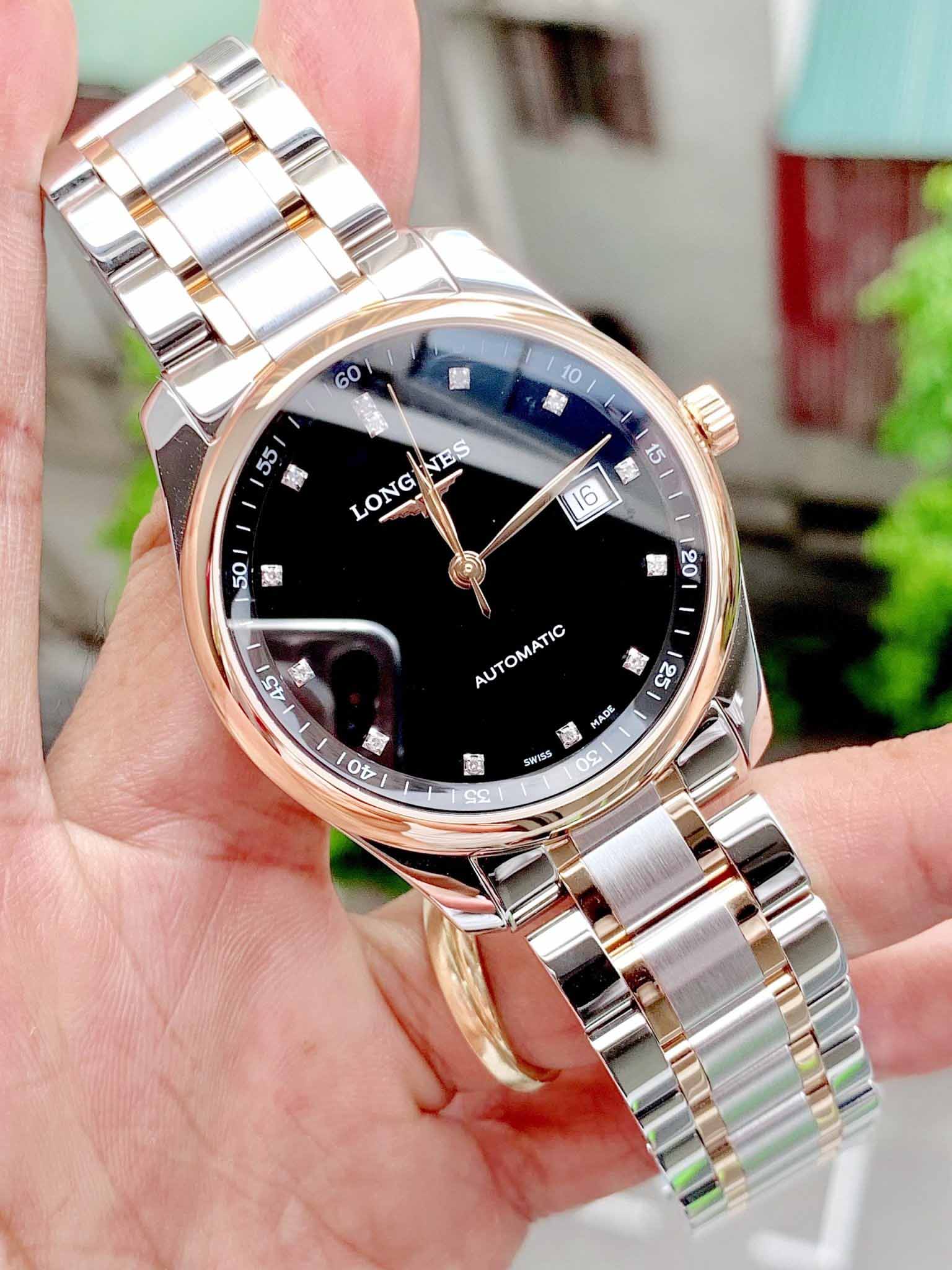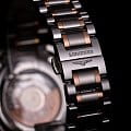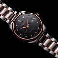 Швейцарский автоматический калибр L888 характеризуется запасом хода на 64 часа. Прозрачная задняя крышка с сапфировым стеклом позволяет следить за движением деталей и шестерёнок. Чёрный циферблат инкрустирован 12 бриллиантами общим весом в 0,055 карата, роскошное сияние драгоценных камней сочетается с блеском корпуса из нержавеющей стали 316L и 18-каратного розового золота18-каратное золотоОбозначение по каратной системе пробирования, оно показывает, сколько драгоценного металла содержится в изделии. 18 карат - в составе 75% чистого золота, соответствует 750 пробе.