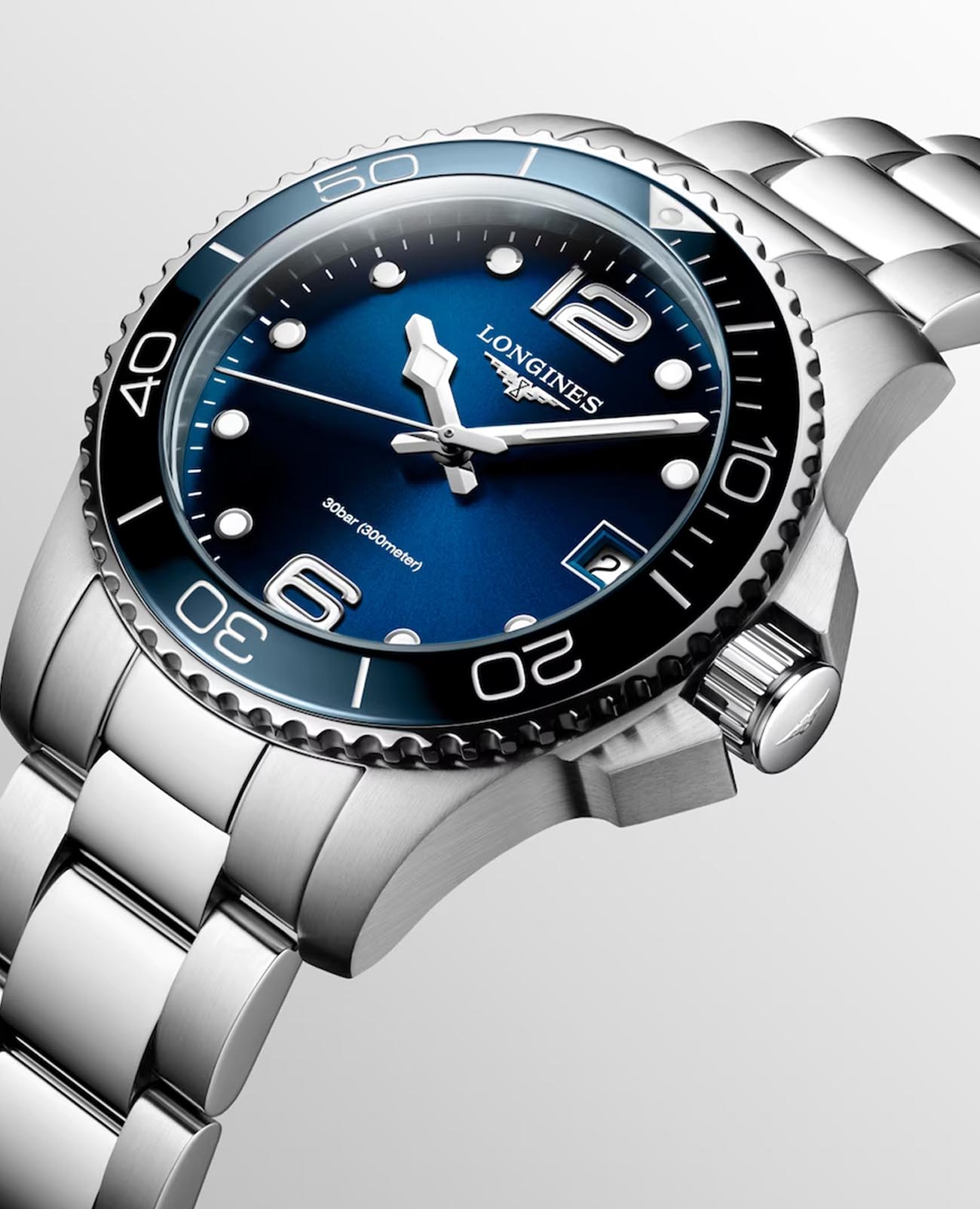 Женские швейцарские часы для дайвинга Longines HydroConquest L3.370.4.96.6, кварцевый механизм с высокой точностью. Сапфировое стеклоСапфировое стеклоПрочный и надёжный материал из кристалла сапфира синтетического происхождения, характеризующийся особой твёрдостью и устойчивостью к царапинам и повреждениям. с многослойным антибликовым покрытием с обеих сторон, устойчивое к появлению царапин, обладающее высокой прозрачностью. Корпус часов изготовлен из стали. Вращающийся безельБезельВнешний ободок, закрепляющий стекло. В спортивных часах так называется поворотное кольцо с делениями на циферблате, выполняет роль таймера – замеряет отрезки времени на шкале. Неподвижный безель – элемент декора. Однонаправленно вращающийся безель на дайверских часах позволяет фиксировать моменты погружения и выныривания на поверхность. из стали и керамики, защищенный от царапин, никогда не изнашивается и не выцветает. Стрелки и метки с люминесцентным покрытиемЛюминесцентное покрытиеПозволяет считывать показания времени в темноте. Производители наносят на стрелки, часовые индексы, безель или поверхность циферблата светонакопительный состав, дающий холодное свечение.. Окошко даты находится в положении 3 часов. Класс водозащиты: 300 метров, позволит плавать, нырять и заниматься другими водными видами спорта. Стальной браслет на раскладной застёжкеРаскладная застёжкаТакой тип застёжки используется только на браслетах из металла. Она никогда не раскрывается полностью, происходит разделение на 2 и более частей. Раскладывающая застёжка снизит вероятность потери часов к минимуму..