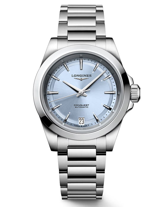 Часы Longines Conquest (артикул L34304926) сочетают спортивную элегантность и функциональность, характерные для коллекции Conquest. Корпус диаметром 34 мм выполнен из нержавеющей стали с водозащитой до 10 бар (100 метров). Завинчивающаяся заводная головка и прозрачная задняя крышка из сапфирового стеклаСапфировое стеклоПрочный и надёжный материал из кристалла сапфира синтетического происхождения, характеризующийся особой твёрдостью и устойчивостью к царапинам и повреждениям. подчёркивают практичность. Синий циферблат с солнечным узором оснащён накладными индексами, стрелками с люминесцентным покрытием Swiss Super-LumiNova®Люминесцентное покрытиеПозволяет считывать показания времени в темноте. Производители наносят на стрелки, часовые индексы, безель или поверхность циферблата светонакопительный состав, дающий холодное свечение., а также окошком даты в положении «6 часов». Циферблат защищён сапфировым стекломСапфировое стеклоПрочный и надёжный материал из кристалла сапфира синтетического происхождения, характеризующийся особой твёрдостью и устойчивостью к царапинам и повреждениям. с антибликовым покрытием с обеих сторон.