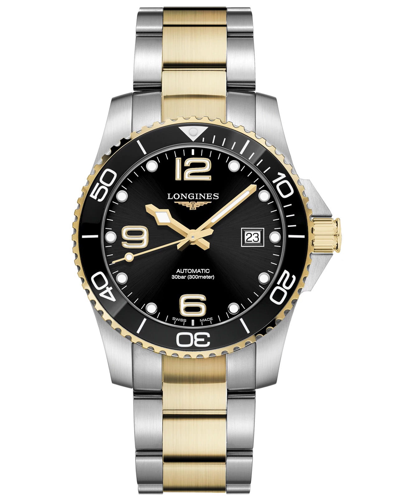 Мужские механические швейцарские часы с автоподзаводом Longines HydroConquest L3.781.3.56.7. Сапфировое стеклоСапфировое стеклоПрочный и надёжный материал из кристалла сапфира синтетического происхождения, характеризующийся особой твёрдостью и устойчивостью к царапинам и повреждениям. с антибликовым покрытием, устойчивое к мелким механическим повреждениям. Корпус часов изготовлен из нержавеющей стали. Вращающийся стальной безельБезельВнешний ободок, закрепляющий стекло. В спортивных часах так называется поворотное кольцо с делениями на циферблате, выполняет роль таймера – замеряет отрезки времени на шкале. Неподвижный безель – элемент декора. Однонаправленно вращающийся безель на дайверских часах позволяет фиксировать моменты погружения и выныривания на поверхность. с люминесцентным покрытиемЛюминесцентное покрытиеПозволяет считывать показания времени в темноте. Производители наносят на стрелки, часовые индексы, безель или поверхность циферблата светонакопительный состав, дающий холодное свечение. Superluminova из нержавеющей стали с PVD-покрытиемPVDУльтратонкое покрытие наносится в технике вакуумного напыления, сочетает в себе нитрид титана особой прочности со слоем золота или оксида хрома. Несёт в себе декоративную или защитную функцию. и керамики, защищенный от царапин, никогда не изнашивается и не выцветает. Стрелки и метки с люминесцентным покрытиемЛюминесцентное покрытиеПозволяет считывать показания времени в темноте. Производители наносят на стрелки, часовые индексы, безель или поверхность циферблата светонакопительный состав, дающий холодное свечение.. Окошко даты находится в положении 3 часа. Класс водозащиты: 300 метров, позволит плавать, нырять и заниматься другими водными видами спорта. Стальной браслет с частичным PVD-покрытиемPVDУльтратонкое покрытие наносится в технике вакуумного напыления, сочетает в себе нитрид титана особой прочности со слоем золота или оксида хрома. Несёт в себе декоративную или защитную функцию. на раскладной застёжкеРаскладная застёжкаТакой тип застёжки используется только на браслетах из металла. Она никогда не раскрывается полностью, происходит разделение на 2 и более частей. Раскладывающая застёжка снизит вероятность потери часов к минимуму. с удлинением для дайверов.