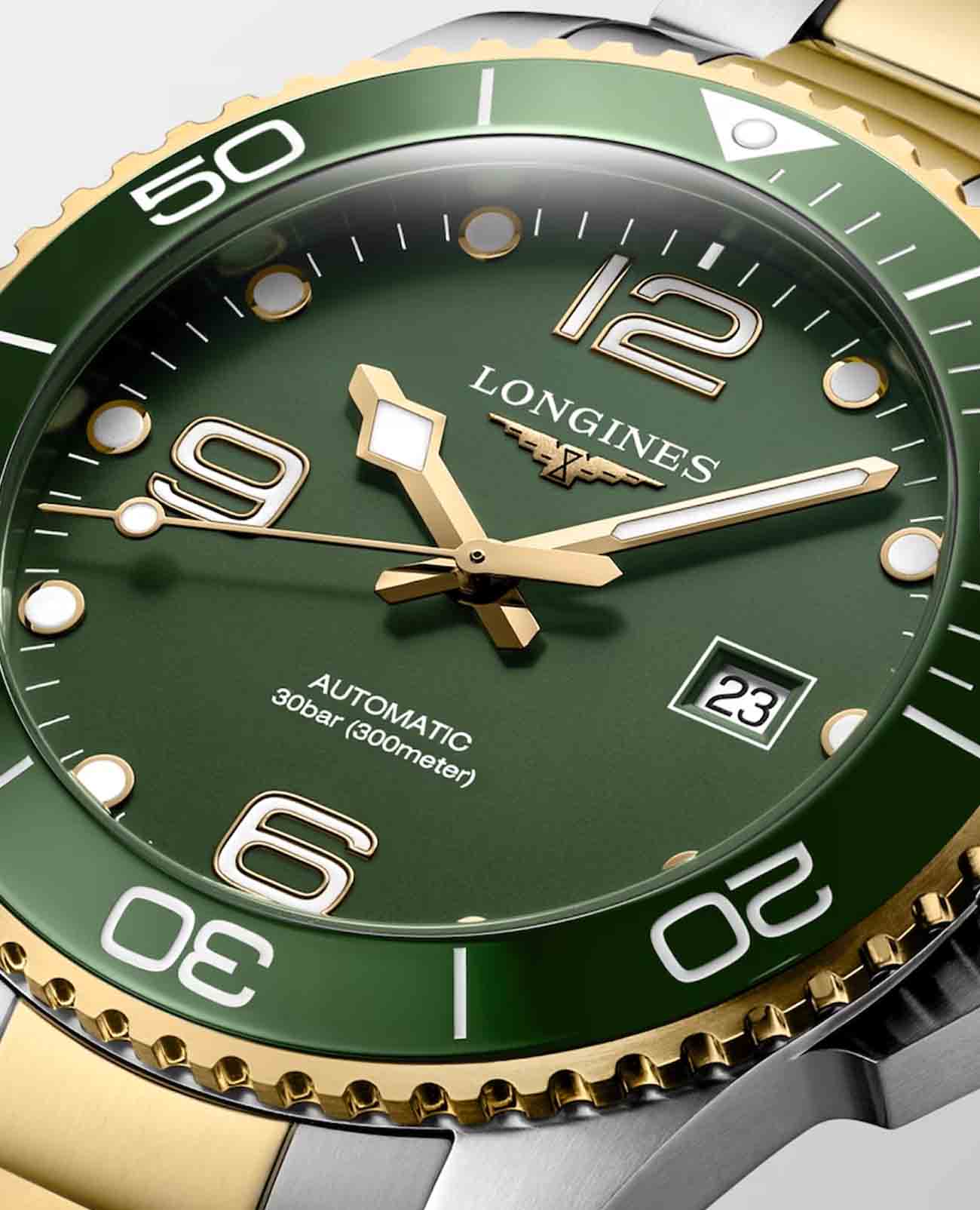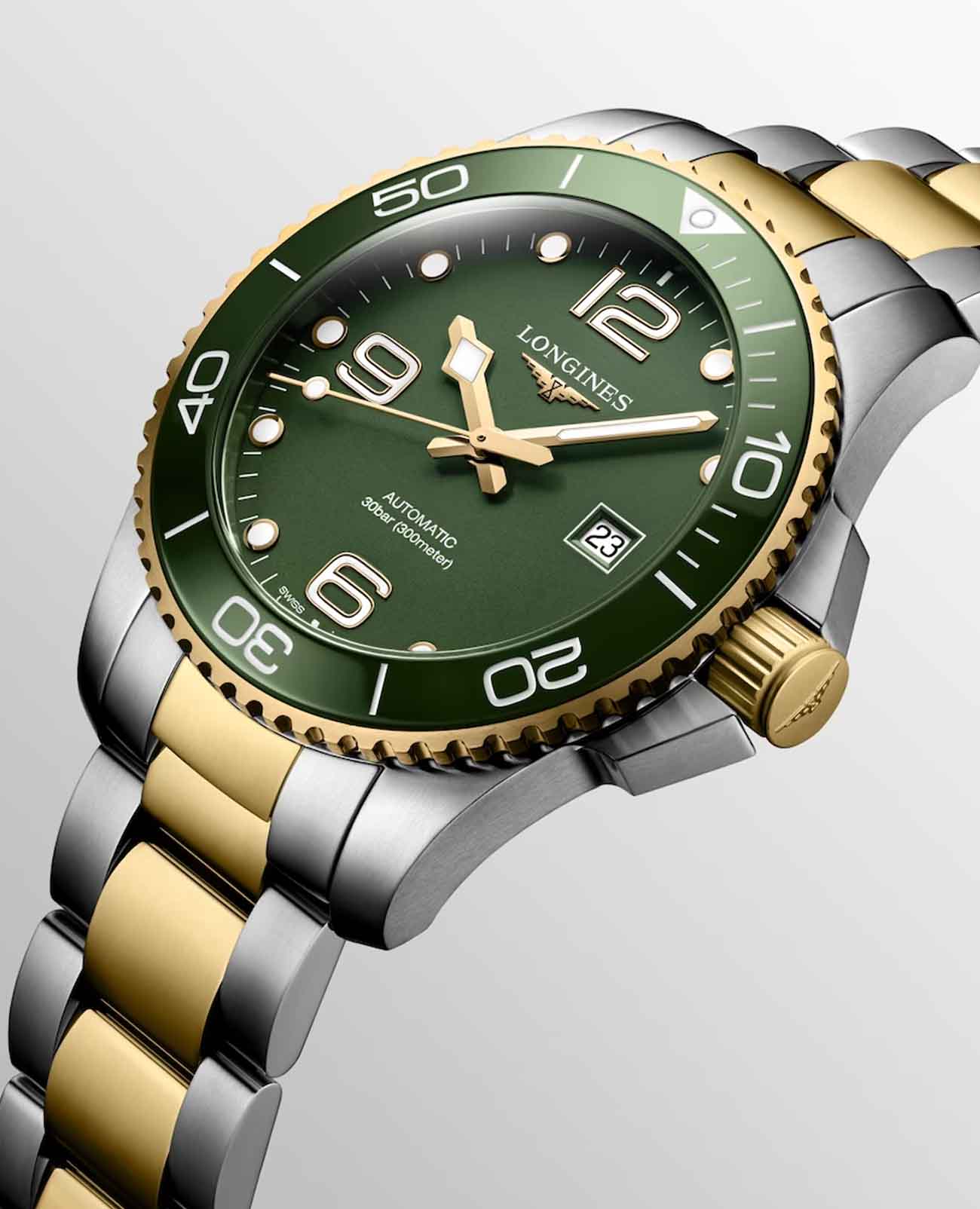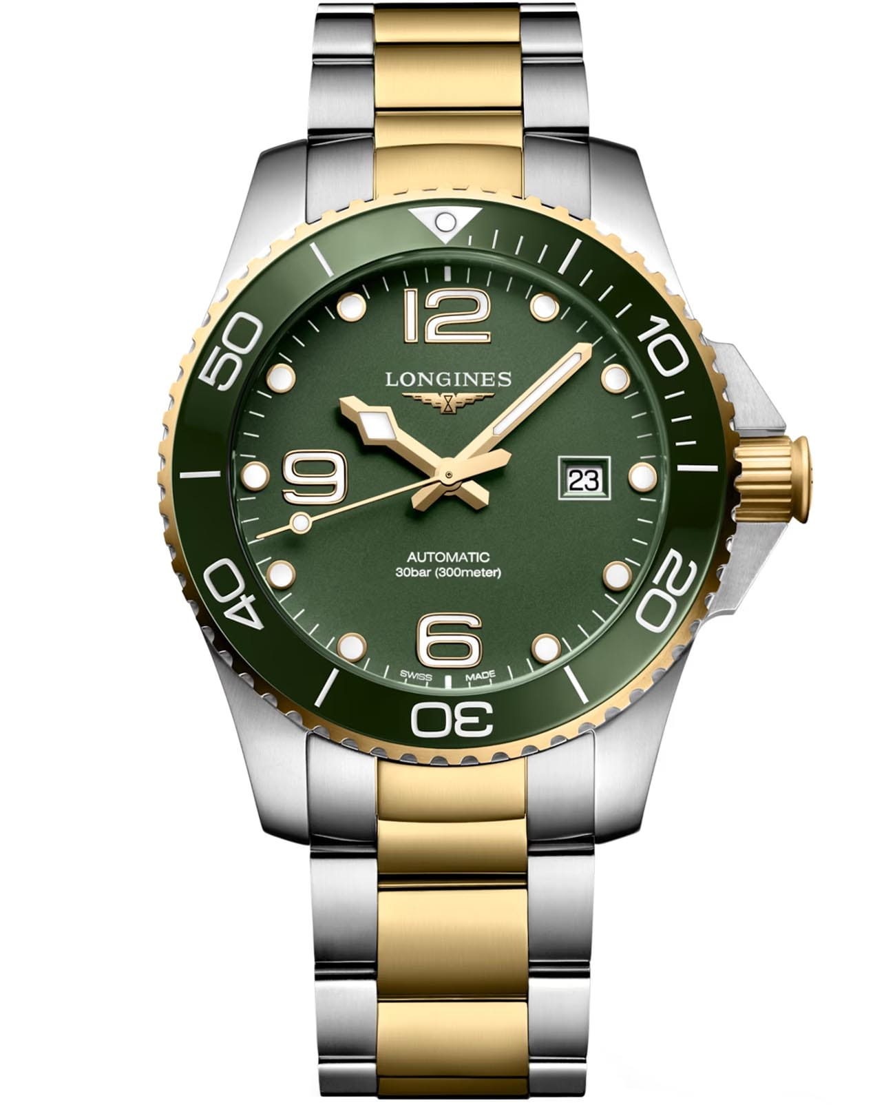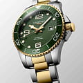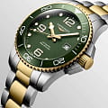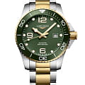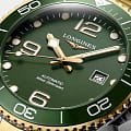 Часы Longines HydroConquest (артикул L37823067) сочетают элегантность с высокими техническими характеристиками, характерными для дайверских моделей. Корпус диаметром 43 мм выполнен из нержавеющей стали с жёлтым PVD-покрытиемPVDУльтратонкое покрытие наносится в технике вакуумного напыления, сочетает в себе нитрид титана особой прочности со слоем золота или оксида хрома. Несёт в себе декоративную или защитную функцию. и водозащитой до 30 бар (300 метров). Однонаправленный вращающийся , завинчивающиеся заводная головка и задняя крышка подчёркивают надёжность. Матовый зелёный циферблат оснащён накладными арабскими цифрами и индексами с люминесцентным покрытием Swiss Super-LumiNova®Люминесцентное покрытиеПозволяет считывать показания времени в темноте. Производители наносят на стрелки, часовые индексы, безель или поверхность циферблата светонакопительный состав, дающий холодное свечение., стрелками с люминесцентным покрытиемЛюминесцентное покрытиеПозволяет считывать показания времени в темноте. Производители наносят на стрелки, часовые индексы, безель или поверхность циферблата светонакопительный состав, дающий холодное свечение., а также окошком даты в положении «3 часа». Циферблат защищён сапфировым стекломСапфировое стеклоПрочный и надёжный материал из кристалла сапфира синтетического происхождения, характеризующийся особой твёрдостью и устойчивостью к царапинам и повреждениям. с антибликовым покрытием.