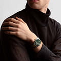 Браслет из нержавеющей стали с жёлтым PVD-покрытиемPVDУльтратонкое покрытие наносится в технике вакуумного напыления, сочетает в себе нитрид титана особой прочности со слоем золота или оксида хрома. Несёт в себе декоративную или защитную функцию. оснащён двойной раскладывающейся застёжкойРаскладная застёжкаТакой тип застёжки используется только на браслетах из металла. Она никогда не раскрывается полностью, происходит разделение на 2 и более частей. Раскладывающая застёжка снизит вероятность потери часов к минимуму. с двойной системой безопасности и интегрированным удлинением для дайвингаУдлинение для дайверовЗастёжка с удлинением для дайверов представляет собой безопасное крепление, которое позволяет надевать часы поверх гидрокостюма. Гибкая застёжка удлиняется на 1-2 миллиметра..