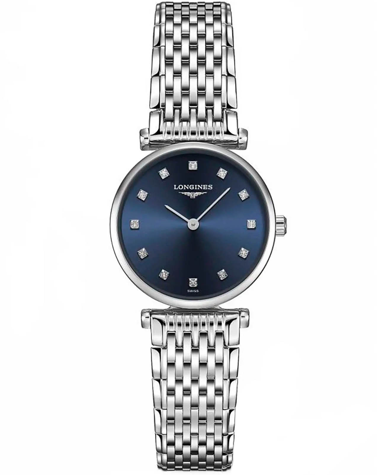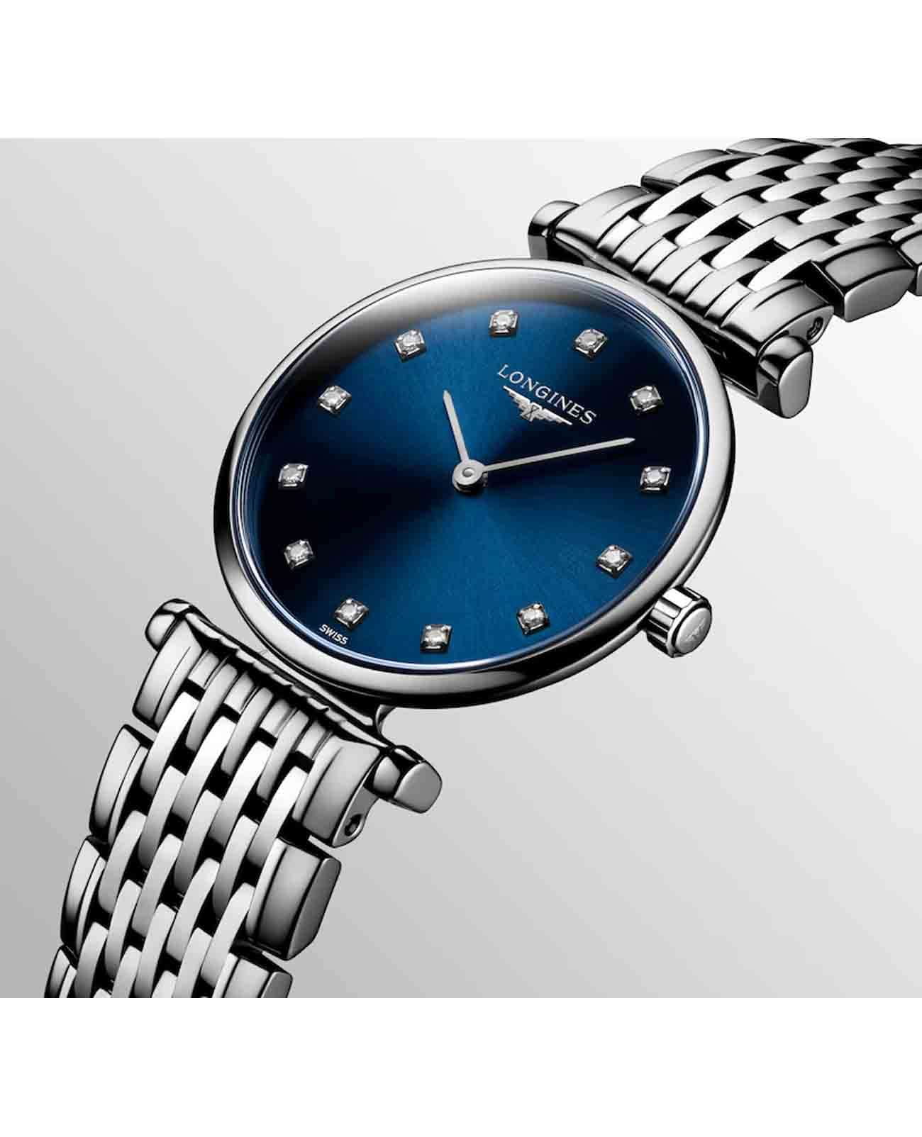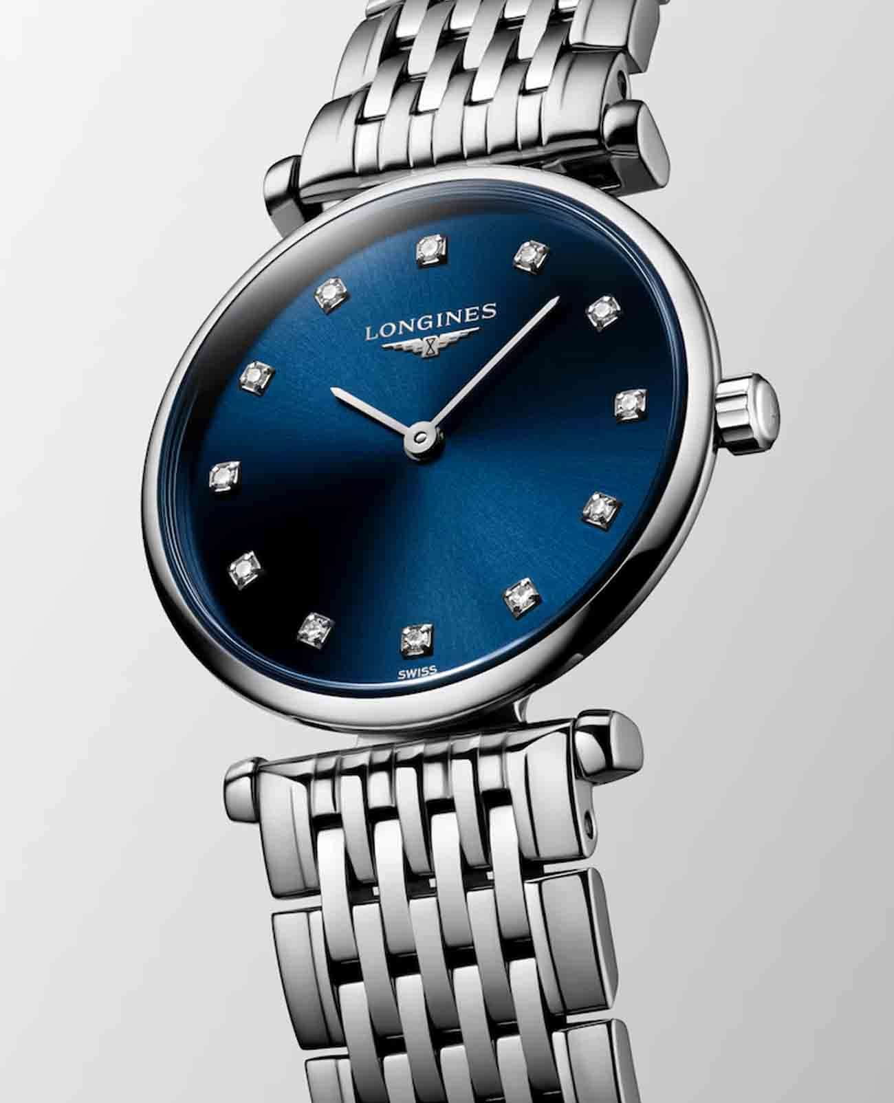 Женские швейцарские часы Longines La Grande Classique L4.209.4.97.6 отличаются изысканным дизайном и высокой точностью работы. Оснащены они сапфировым стекломСапфировое стеклоПрочный и надёжный материал из кристалла сапфира синтетического происхождения, характеризующийся особой твёрдостью и устойчивостью к царапинам и повреждениям., которое прекрасно противостоит царапинам и обеспечивает идеальную прозрачность, позволяя чётко видеть циферблат в любых условиях. Корпус часов выполнен из высококачественной стали, что гарантирует их долговечность и надёжность. Циферблат украшен 12 бриллиантами группы Top Wesselton VS-SI, общий вес которых составляет 0.048 карата, что придаёт часам роскоши и утончённости. Класс водозащиты 30 метров защищает часы от случайных брызг или капель дождя. Стальной браслет с застёжкой-бабочкой с кнопкамиЗастёжка "бабочка"Такой вид застёжки дополняется предохранителями, помогающими избежать случайного раскрытия браслета. Обладают изящным исполнением. обеспечивает комфорт и безопасность при ношении, дополняя элегантный образ этих часов.