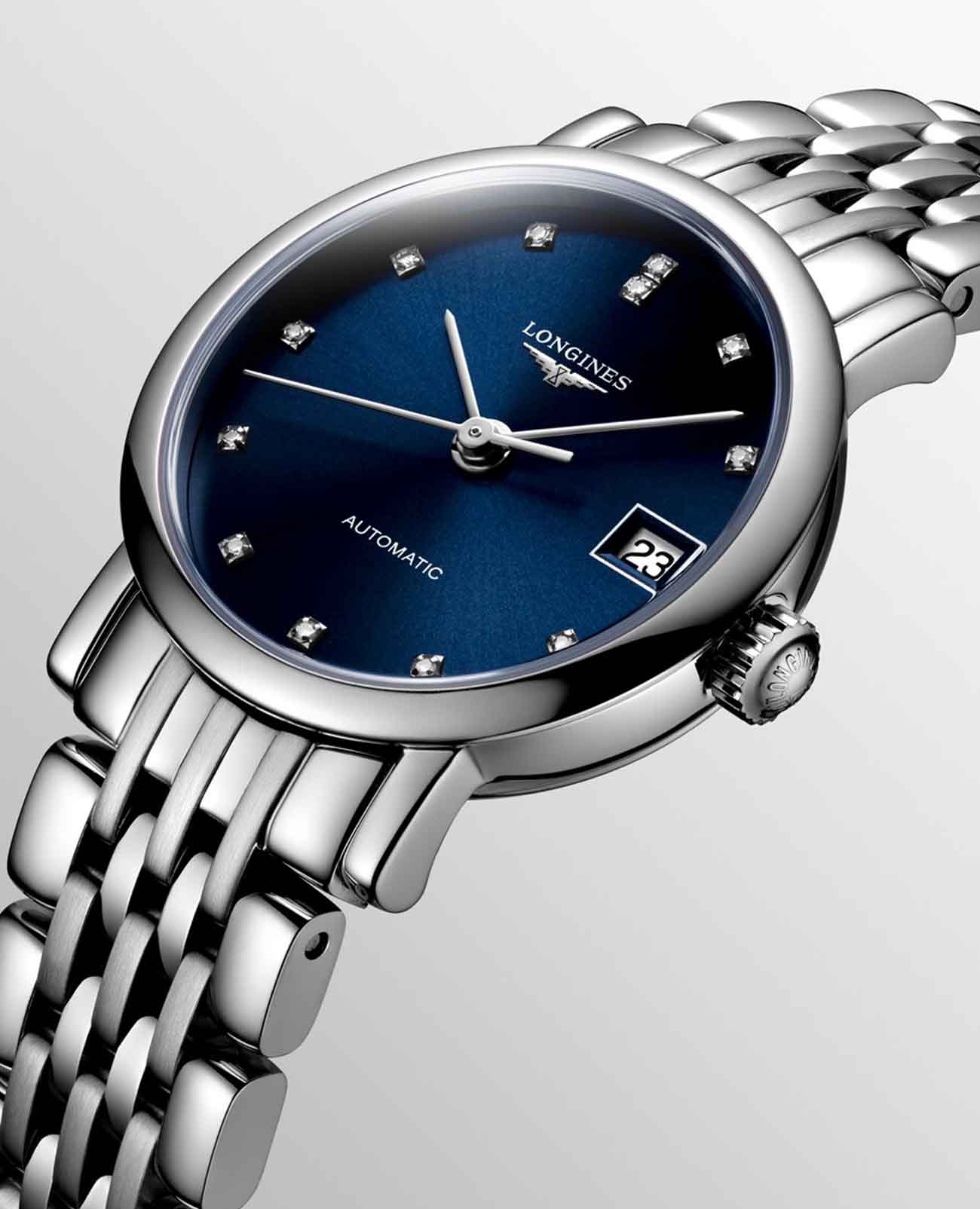 Швейцарские механические часы с автоподзаводом Longines Elegant L4.309.4.97.6. Сапфировое стеклоСапфировое стеклоПрочный и надёжный материал из кристалла сапфира синтетического происхождения, характеризующийся особой твёрдостью и устойчивостью к царапинам и повреждениям. с многослойным антибликовым покрытием с обеих сторон, устойчивое к появлению царапин, обладающее высокой прозрачностью. Корпус часов изготовлен из стали. Циферблат с 12 бриллиантами группы Top Wesselton VS-SI общим весом 0.026 карата. Окошко даты находится в положении 3 часа. Класс водозащиты: 30 метров, позволит защитить корпус от случайных брызг или капель дождя. Стальной браслет на застёжке «бабочка» с кнопкамиЗастёжка "бабочка"Такой вид застёжки дополняется предохранителями, помогающими избежать случайного раскрытия браслета. Обладают изящным исполнением. .