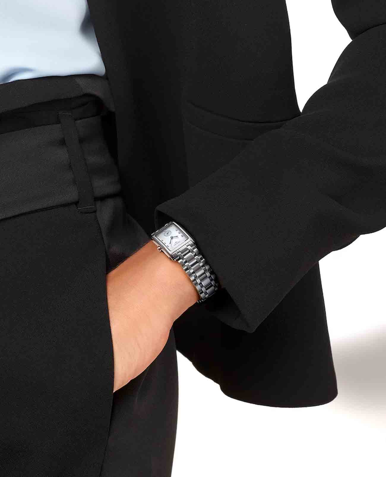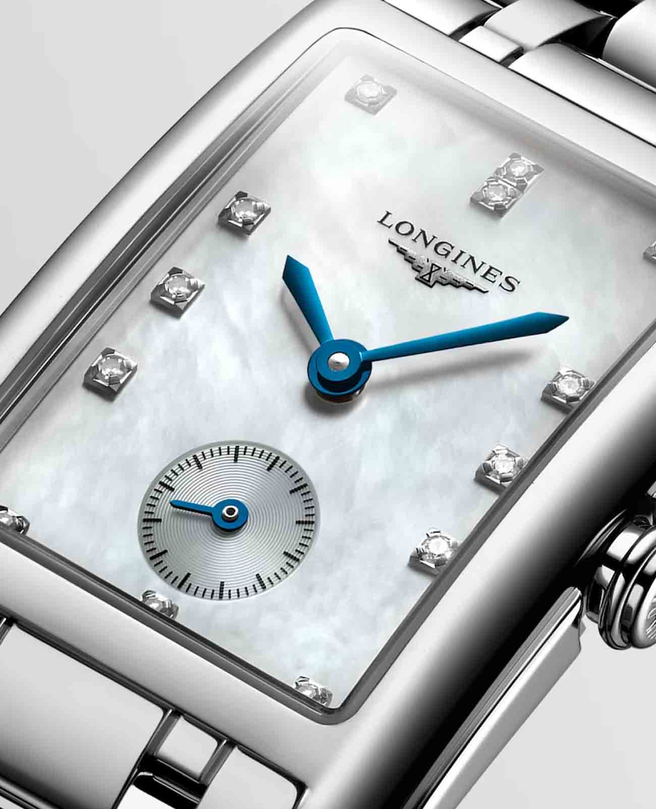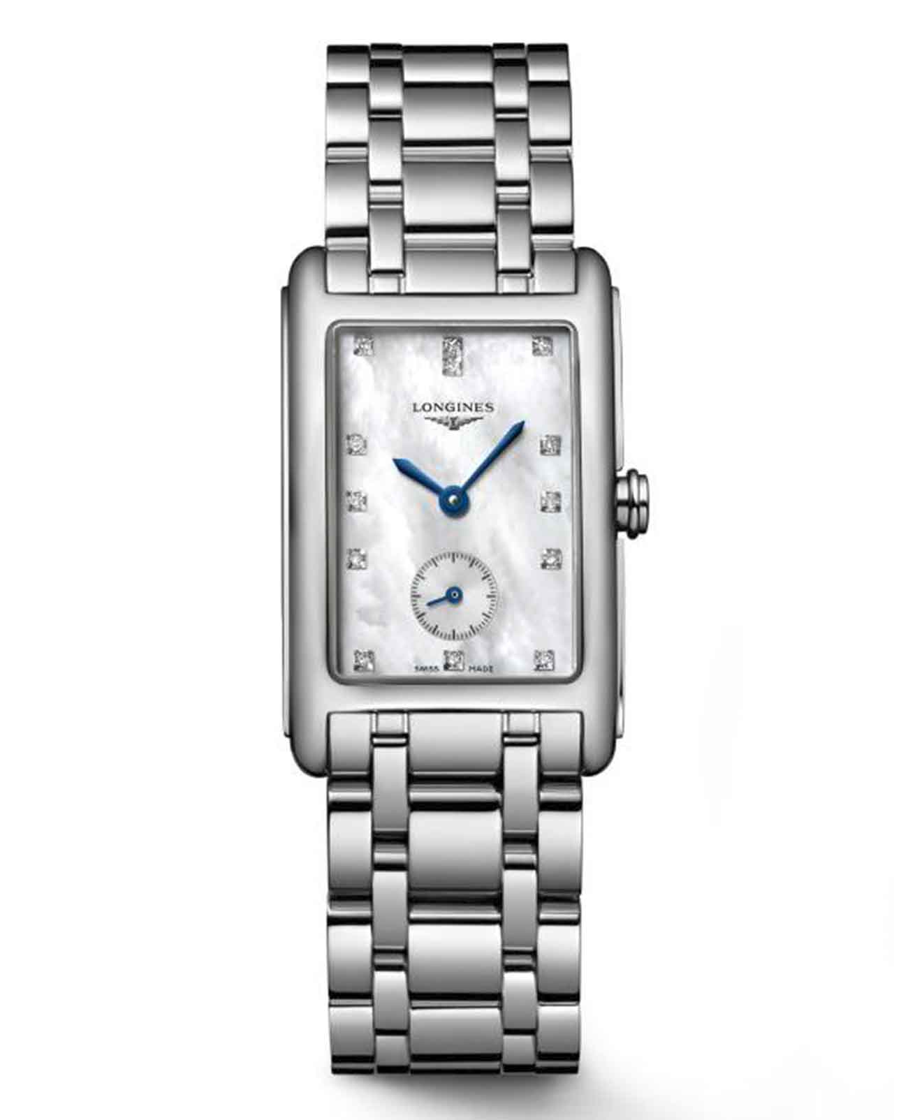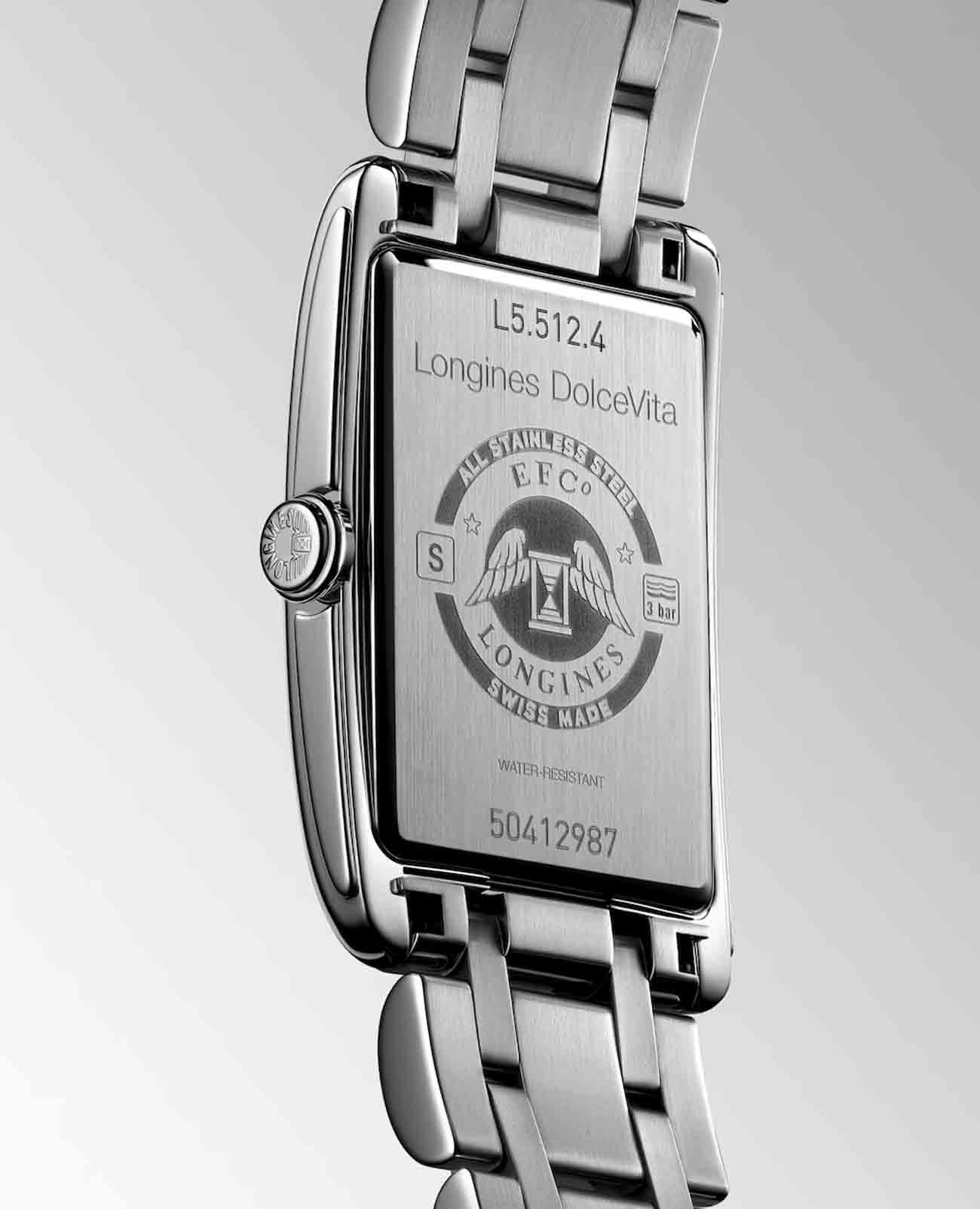 Женские швейцарские часы Longines DolceVita L5.512.4.87.6, кварцевый механизм с высокой точностью. Сапфировое стеклоСапфировое стеклоПрочный и надёжный материал из кристалла сапфира синтетического происхождения, характеризующийся особой твёрдостью и устойчивостью к царапинам и повреждениям. устойчивое к появлению царапин, обладающее высокой прозрачностью. Корпус часов изготовлен из стали. Циферблат украшают 13 бриллиантов 0,06 карат. Малая секундная стрелка в положении 6 часов. Класс водозащиты: 30 метров, позволит защитить корпус от случайных брызг или капель дождя. Браслет из нержавеющей стали на застёжке «бабочка» с кнопкамиЗастёжка "бабочка"Такой вид застёжки дополняется предохранителями, помогающими избежать случайного раскрытия браслета. Обладают изящным исполнением. .