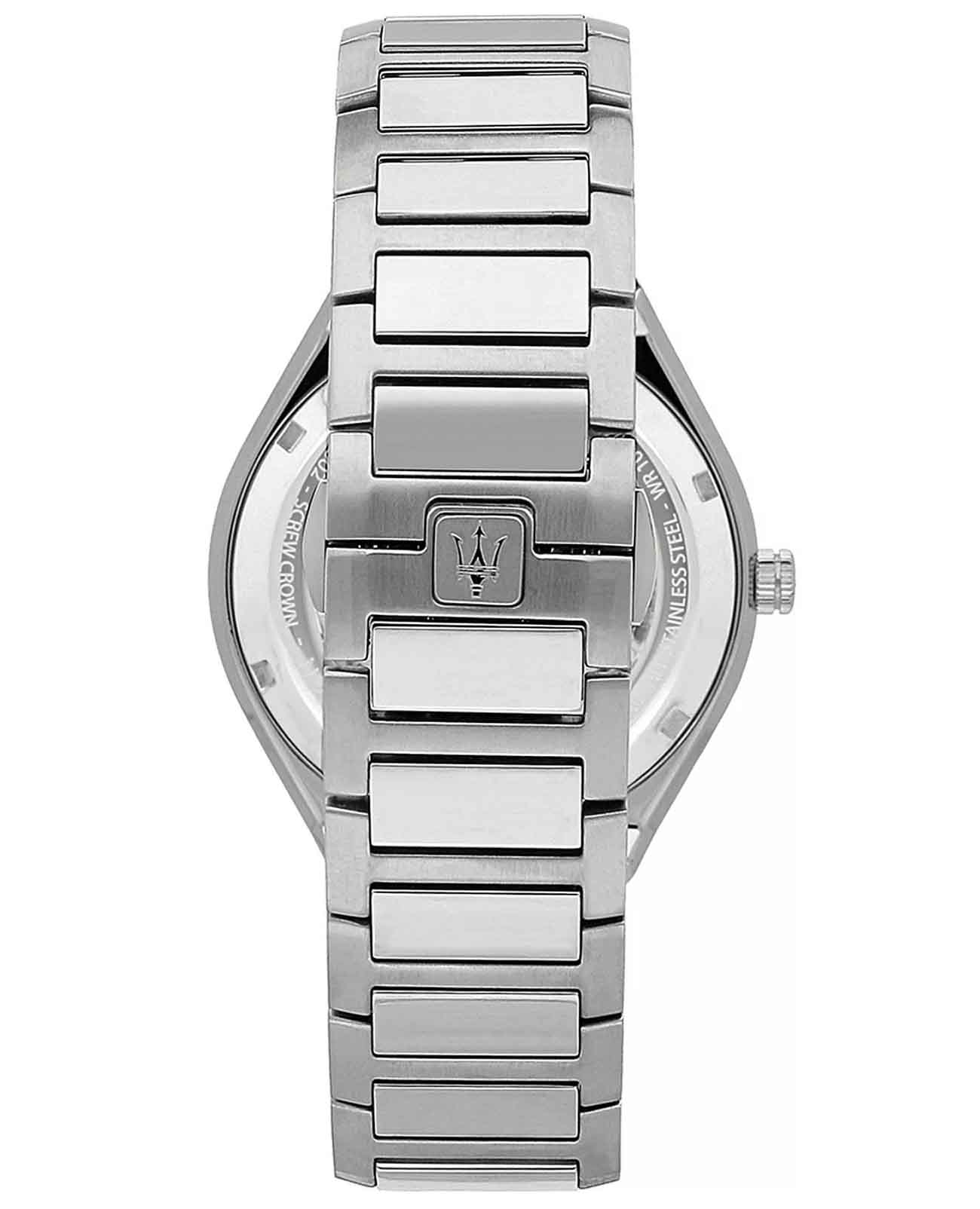 Мужские механические итальянские часы с автоподзаводом Maserati Stile R8823142002. Корпус часов изготовлен из стали. Стрелки с люминесцентным покрытиемЛюминесцентное покрытиеПозволяет считывать показания времени в темноте. Производители наносят на стрелки, часовые индексы, безель или поверхность циферблата светонакопительный состав, дающий холодное свечение.. Класс водозащиты: 100 метров, позволит плавать, нырять и заниматься другими водными видами спорта. Стальной браслет на застёжке «бабочка» с кнопкамиЗастёжка "бабочка"Такой вид застёжки дополняется предохранителями, помогающими избежать случайного раскрытия браслета. Обладают изящным исполнением. .