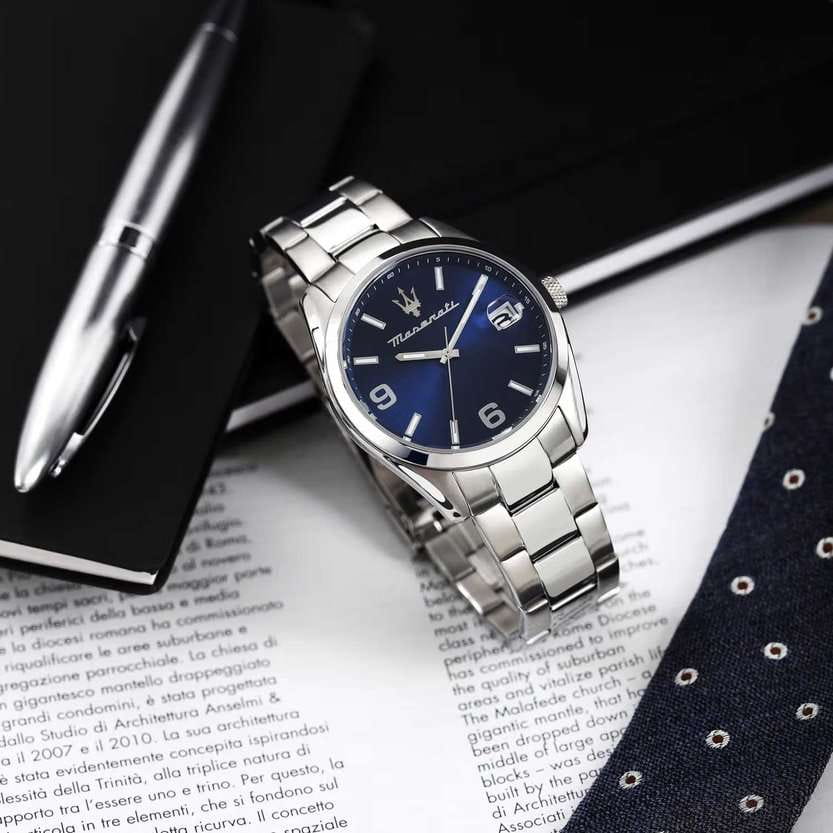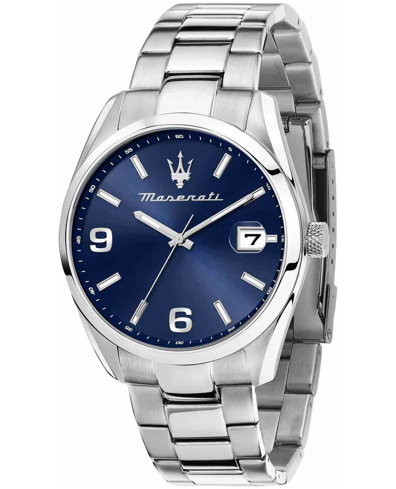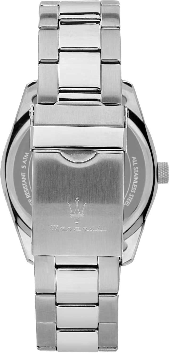Мужские часы Maserati R8853151013 — это стильное сочетание элегантности и современного дизайна. Корпус из нержавеющей стали диаметром 43 мм идеально сбалансирован и элегантен. Минеральное стеклоМинеральное стеклоМинеральное стекло представляет собой искусственно выращенный минерал кварца. Такое стекло отличается особой устойчивостью к повреждениям и царапинам. Уступает по некоторым качествам сапфировому стеклу. защищает циферблат от царапин. Браслет из нержавеющей стали на раскладной застёжкеРаскладная застёжкаТакой тип застёжки используется только на браслетах из металла. Она никогда не раскрывается полностью, происходит разделение на 2 и более частей. Раскладывающая застёжка снизит вероятность потери часов к минимуму. идеально дополняют дизайн часов, обеспечивая комфортное ношение. Стрелки и метки с люминесцентным покрытиемЛюминесцентное покрытиеПозволяет считывать показания времени в темноте. Производители наносят на стрелки, часовые индексы, безель или поверхность циферблата светонакопительный состав, дающий холодное свечение.. Часы обладают впечатляющей водонепроницаемостью до 5 бар (50 метров), что делает их идеальными для повседневной носки. Метки в виде штрихов и двух арабских цифр. Окошко даты с увеличительным стеклом находится в положении 3 часа.