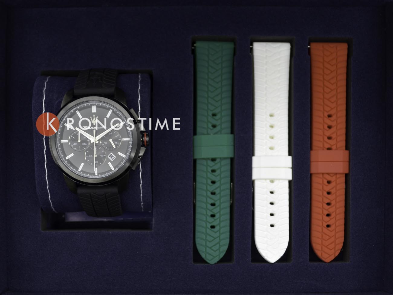 Мужские наручные часы Maserati R8871648005, кварцевый механизм (автоматический калибр) с высокой точностью. 3 дополнительных ремешка в комплекте. Минеральное стеклоМинеральное стеклоМинеральное стекло представляет собой искусственно выращенный минерал кварца. Такое стекло отличается особой устойчивостью к повреждениям и царапинам. Уступает по некоторым качествам сапфировому стеклу. устойчивое к появлению царапин, обладающее высокой прозрачностью. Стрелки с люминесцентным покрытиемЛюминесцентное покрытиеПозволяет считывать показания времени в темноте. Производители наносят на стрелки, часовые индексы, безель или поверхность циферблата светонакопительный состав, дающий холодное свечение.. Класс водозащиты: 50 метров, позволит защитить корпус от случайных брызг или капель дождя. Корпус часов изготовлен из нержавеющей стали с PVD-покрытиемPVDУльтратонкое покрытие наносится в технике вакуумного напыления, сочетает в себе нитрид титана особой прочности со слоем золота или оксида хрома. Несёт в себе декоративную или защитную функцию.. Ремешок с классической застежкой.