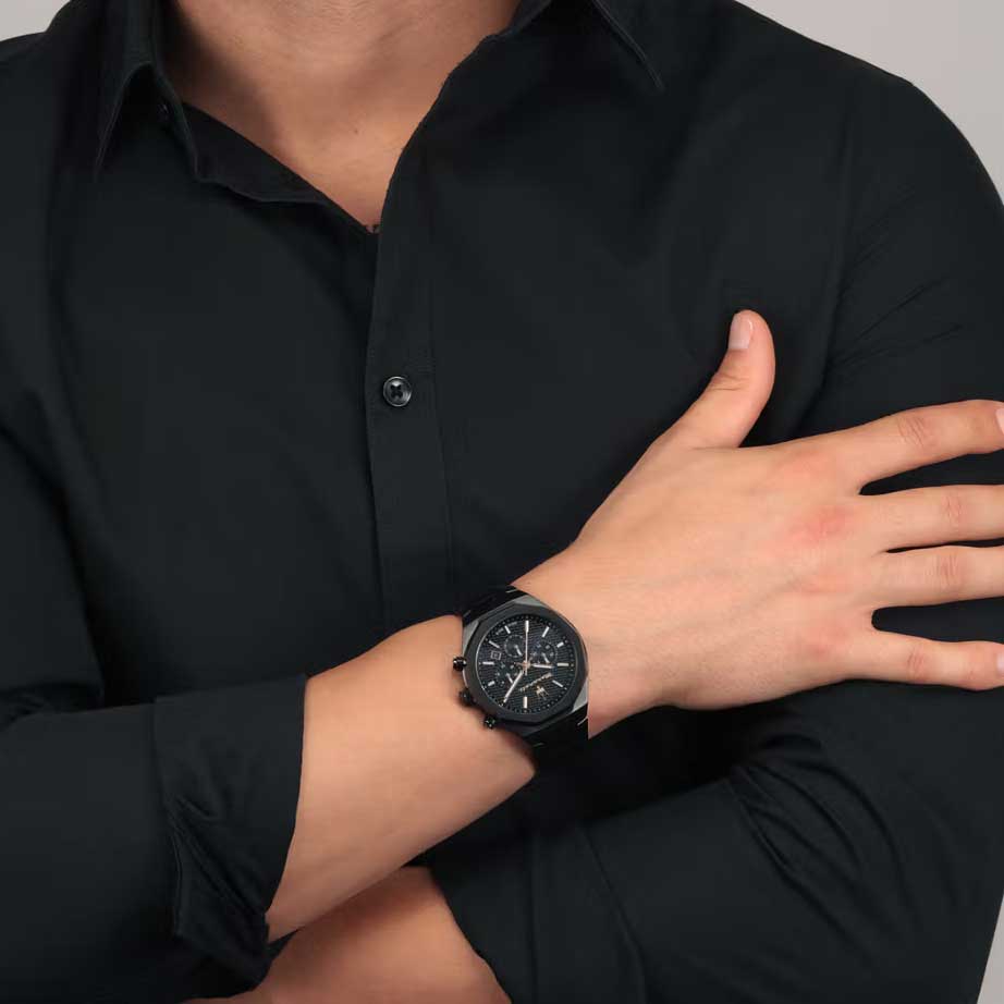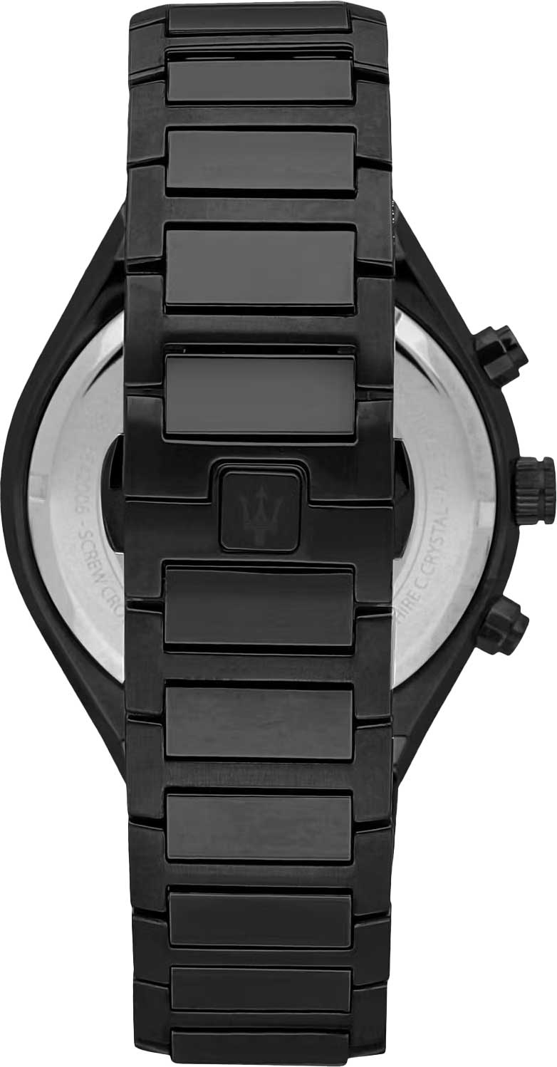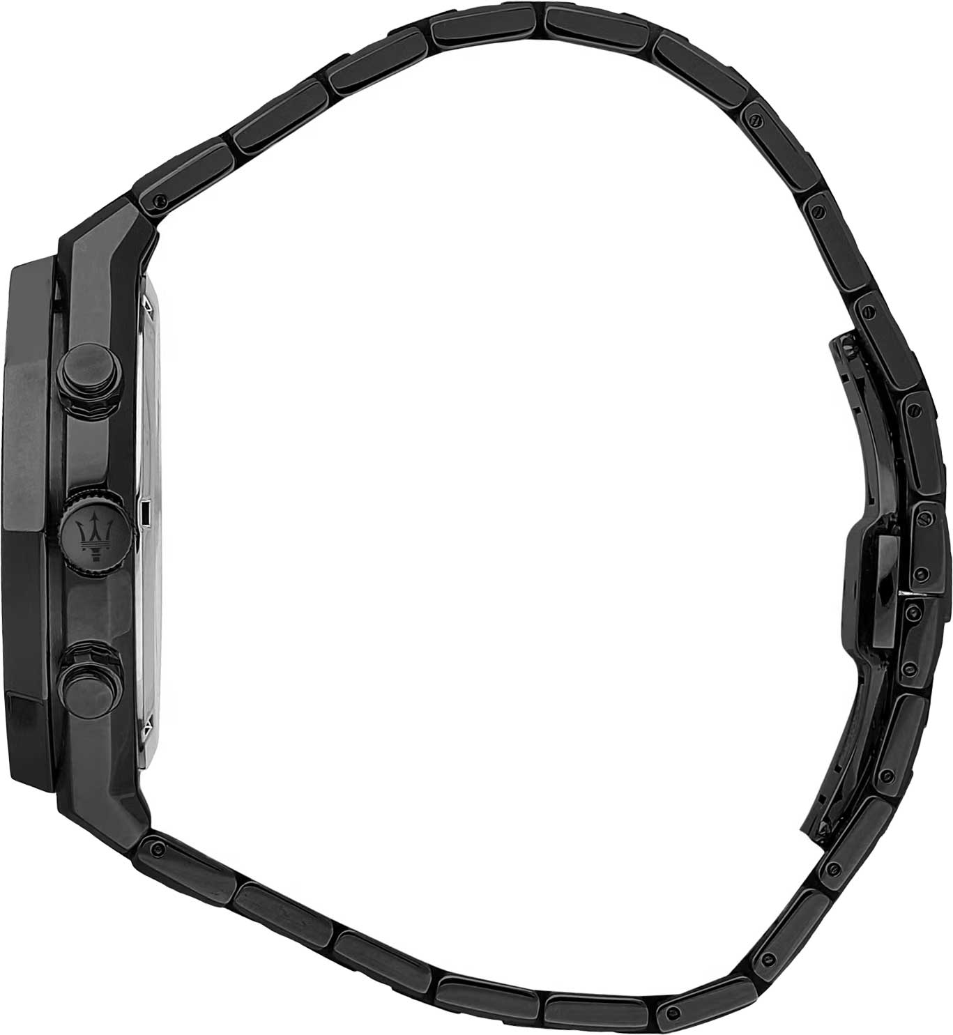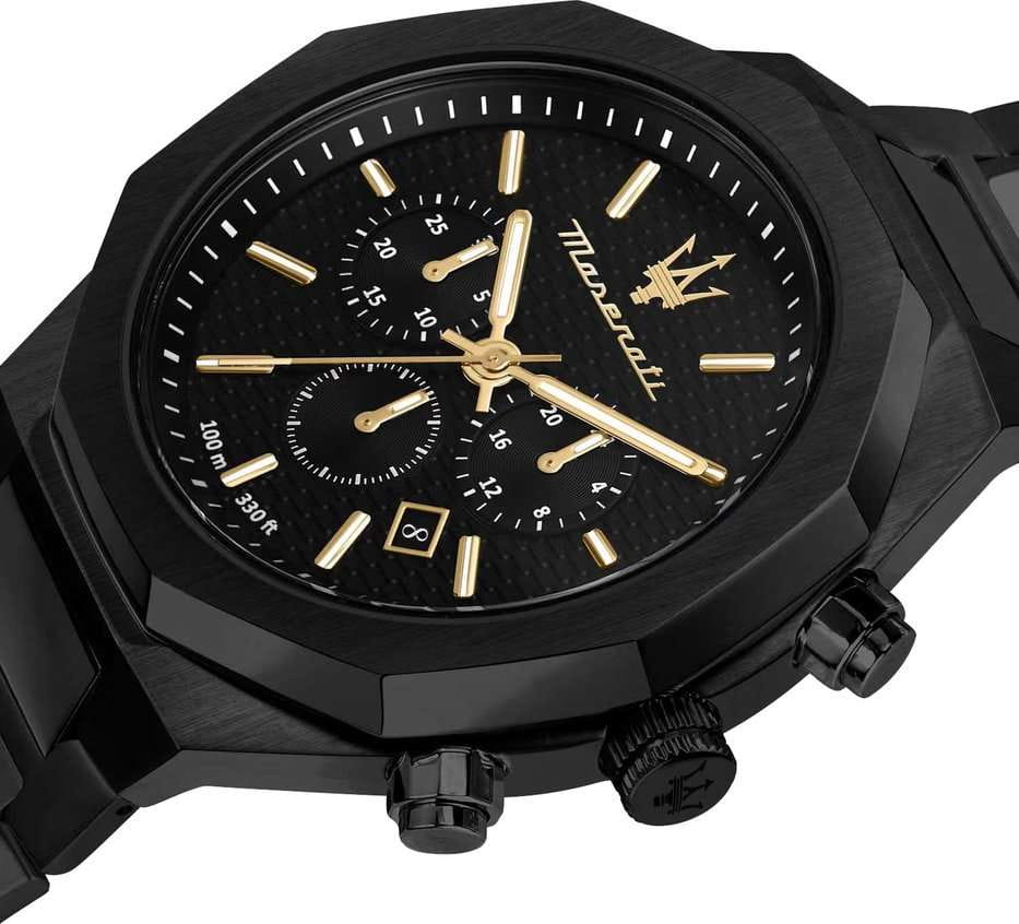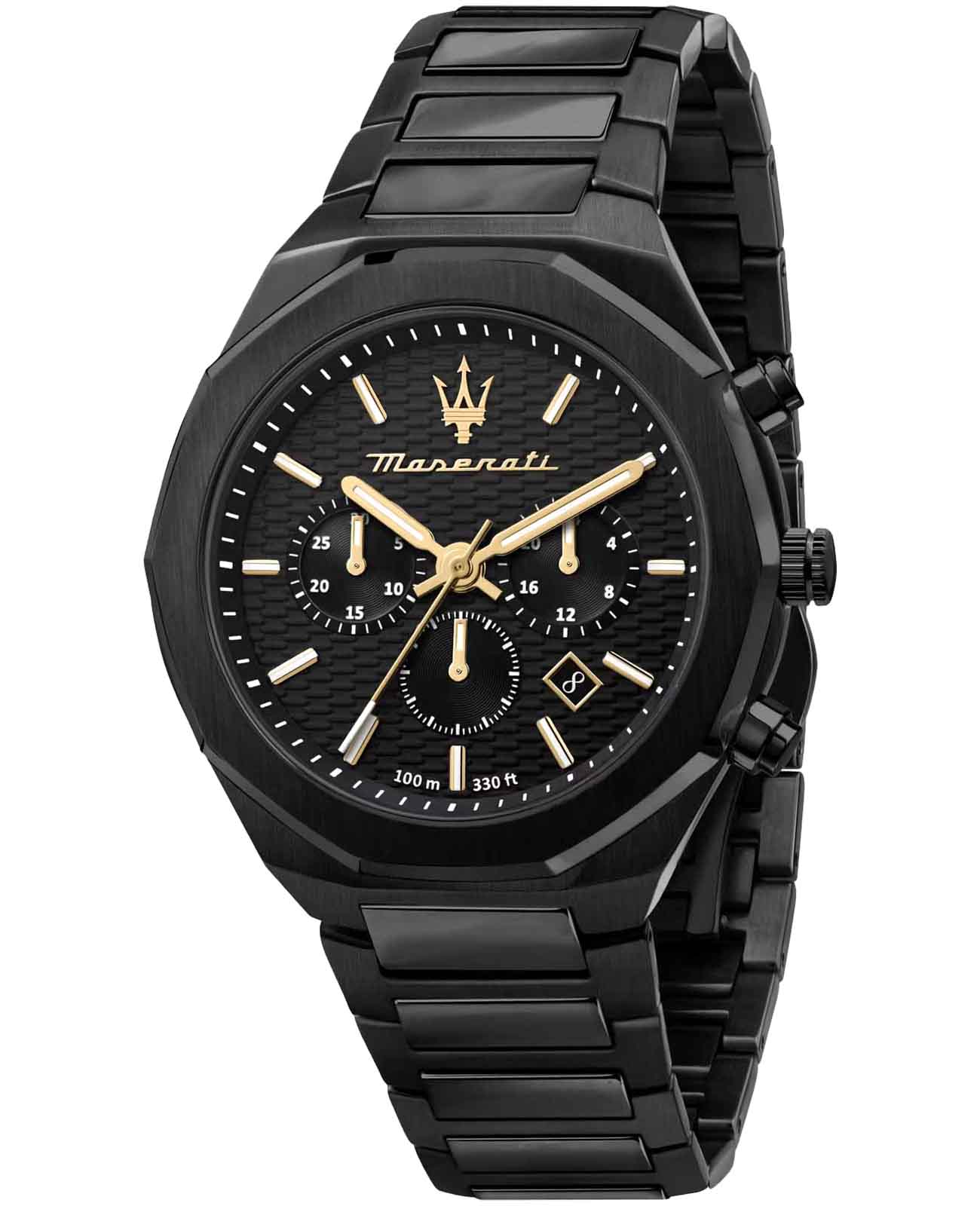 Мужские часы Maserati Stile R8873642005 — это стильное сочетание элегантности и современного дизайна. Корпус из нержавеющей стали с PVD-покрытиемPVDУльтратонкое покрытие наносится в технике вакуумного напыления, сочетает в себе нитрид титана особой прочности со слоем золота или оксида хрома. Несёт в себе декоративную или защитную функцию. диаметром 45 мм идеально сбалансирован и элегантен. Минеральное стеклоМинеральное стеклоМинеральное стекло представляет собой искусственно выращенный минерал кварца. Такое стекло отличается особой устойчивостью к повреждениям и царапинам. Уступает по некоторым качествам сапфировому стеклу. защищает циферблат от царапин. Стальной браслет на застёжке-бабочке с кнопкамиЗастёжка "бабочка"Такой вид застёжки дополняется предохранителями, помогающими избежать случайного раскрытия браслета. Обладают изящным исполнением. идеально дополняют дизайн часов, обеспечивая комфортное ношение. Стрелки и метки с люминесцентным покрытиемЛюминесцентное покрытиеПозволяет считывать показания времени в темноте. Производители наносят на стрелки, часовые индексы, безель или поверхность циферблата светонакопительный состав, дающий холодное свечение.. Часы обладают впечатляющей водонепроницаемостью до 10 бар (100 метров), что делает их идеальными для повседневной носки. Метки в виде штрихов. Окошко даты находится в положении между отметками 4 и 5 часов. Завинчивающаяся задняя крышка и заводная головка. Часы-хронографХронографФункция позволяет измерять отрезки времени с особой точностью: часы, минуты, секунды. Верным признаком хронографа является наличие на циферблате 3 дополнительных окошек-счётчиков. оборудованы надёжным кварцевым механизмом с калибром Miyota JS25, обеспечивающим точность и долговечность.